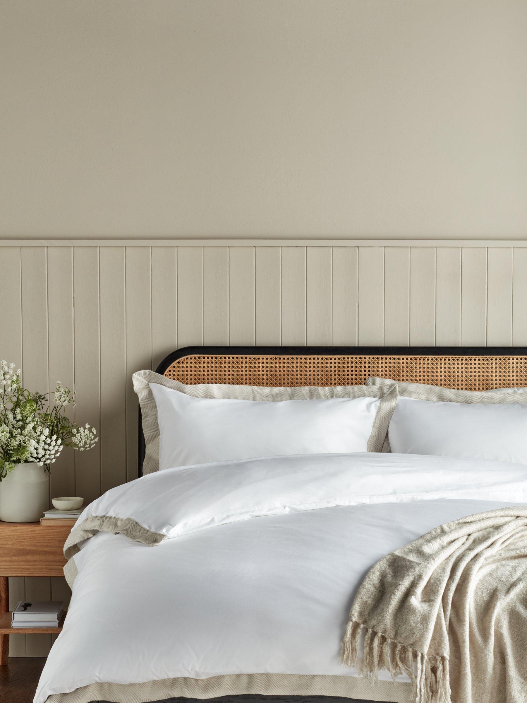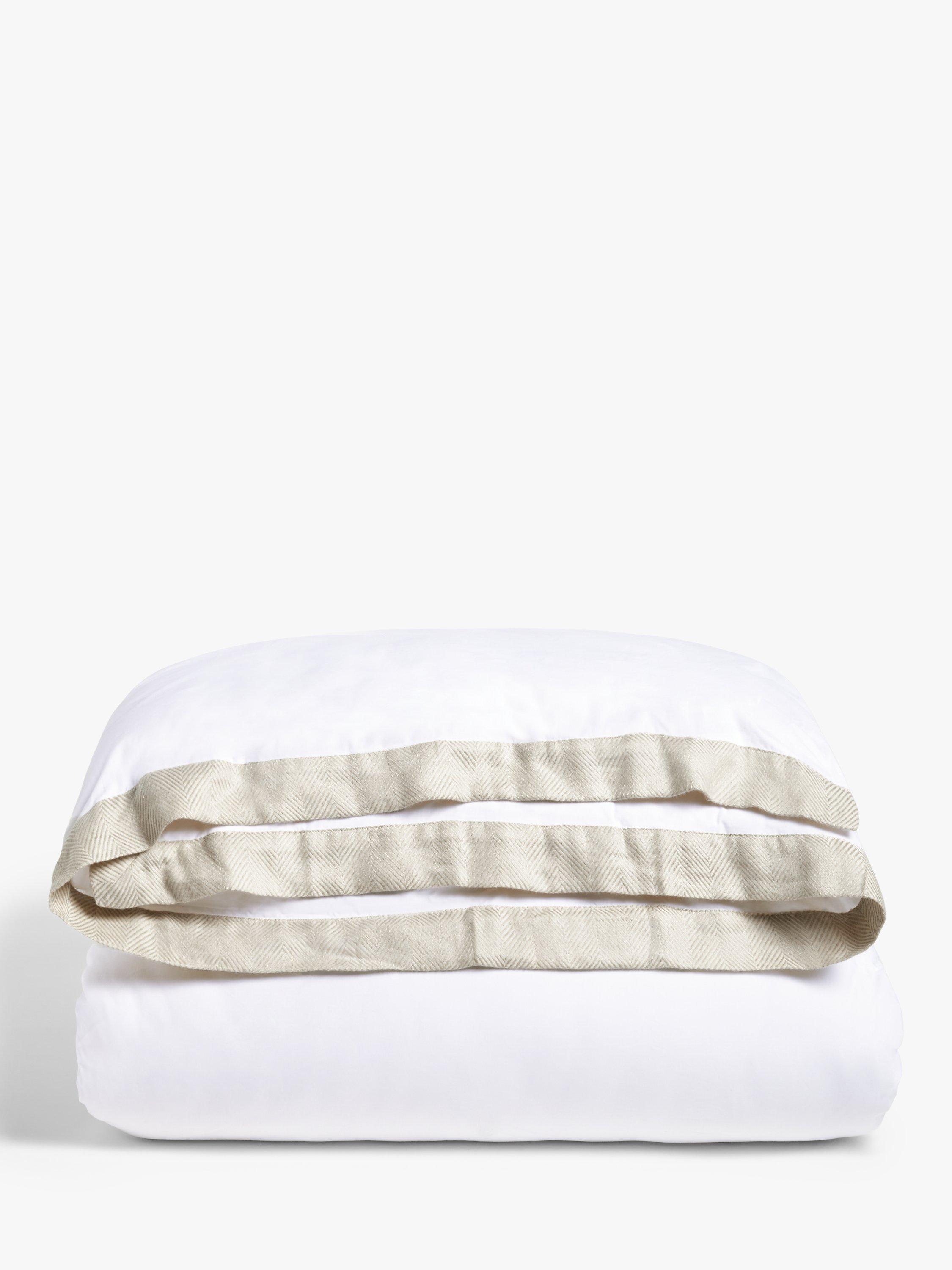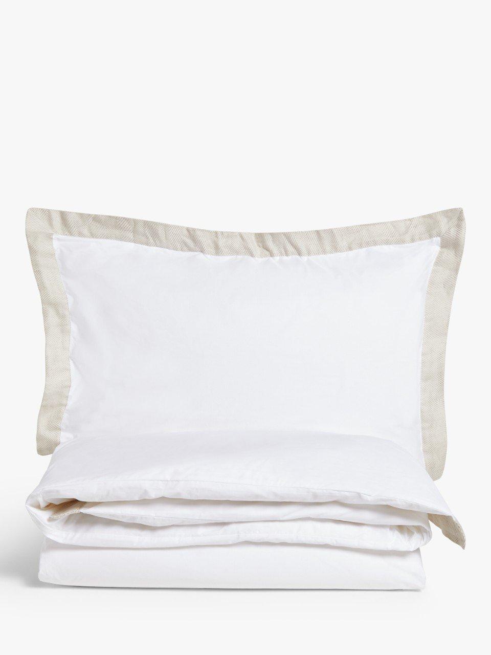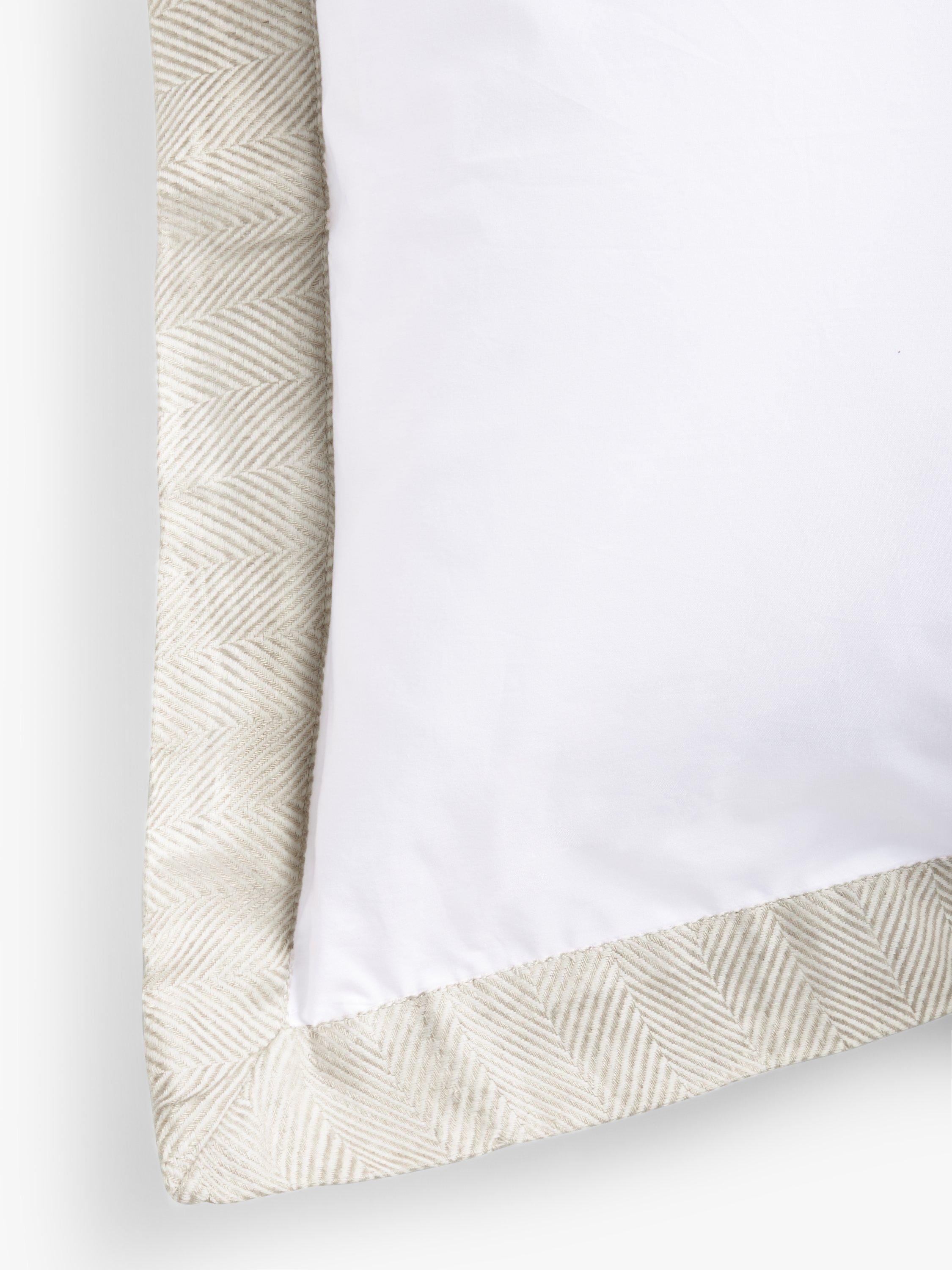 White cotton bedding with a herringbone weave linen blend Oxford border. It will give your bedroom a clean and relaxed look, so you'll look forward to bedtime every night.