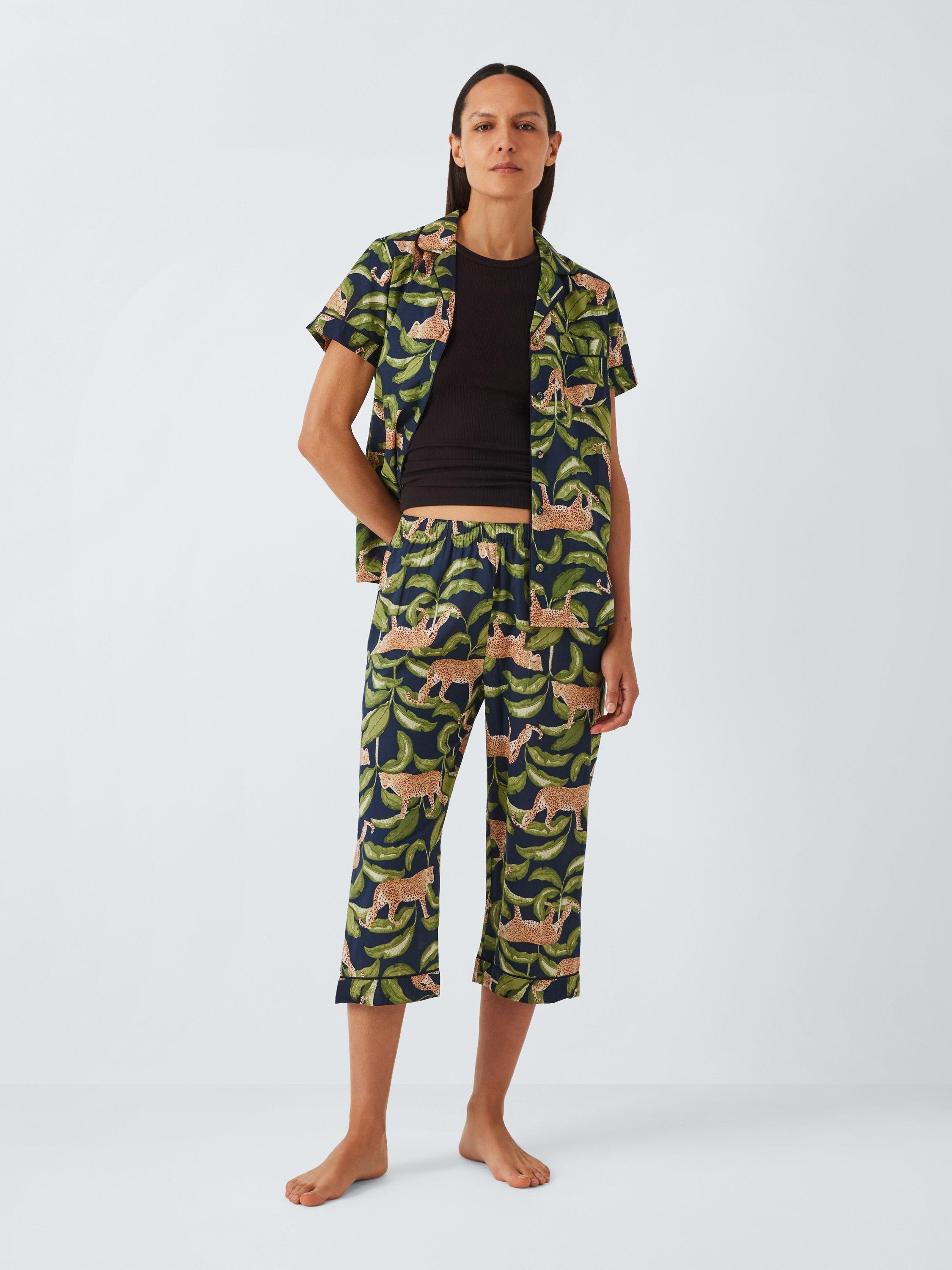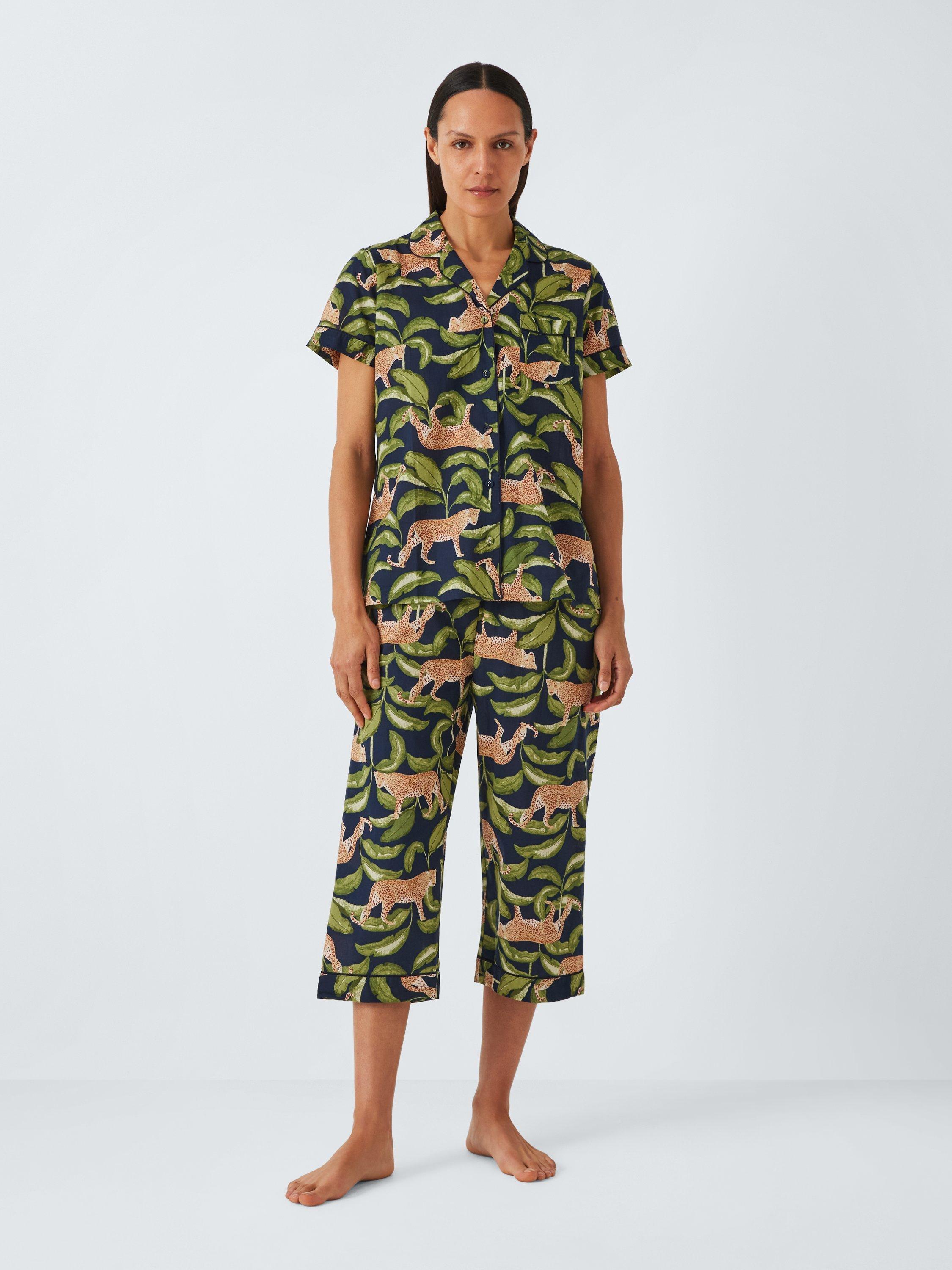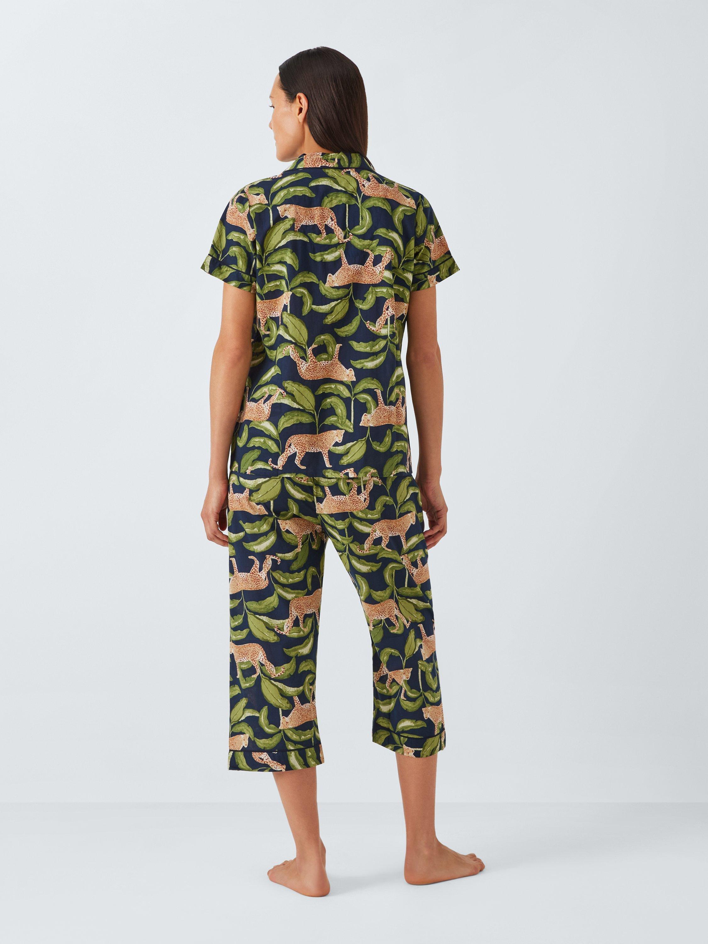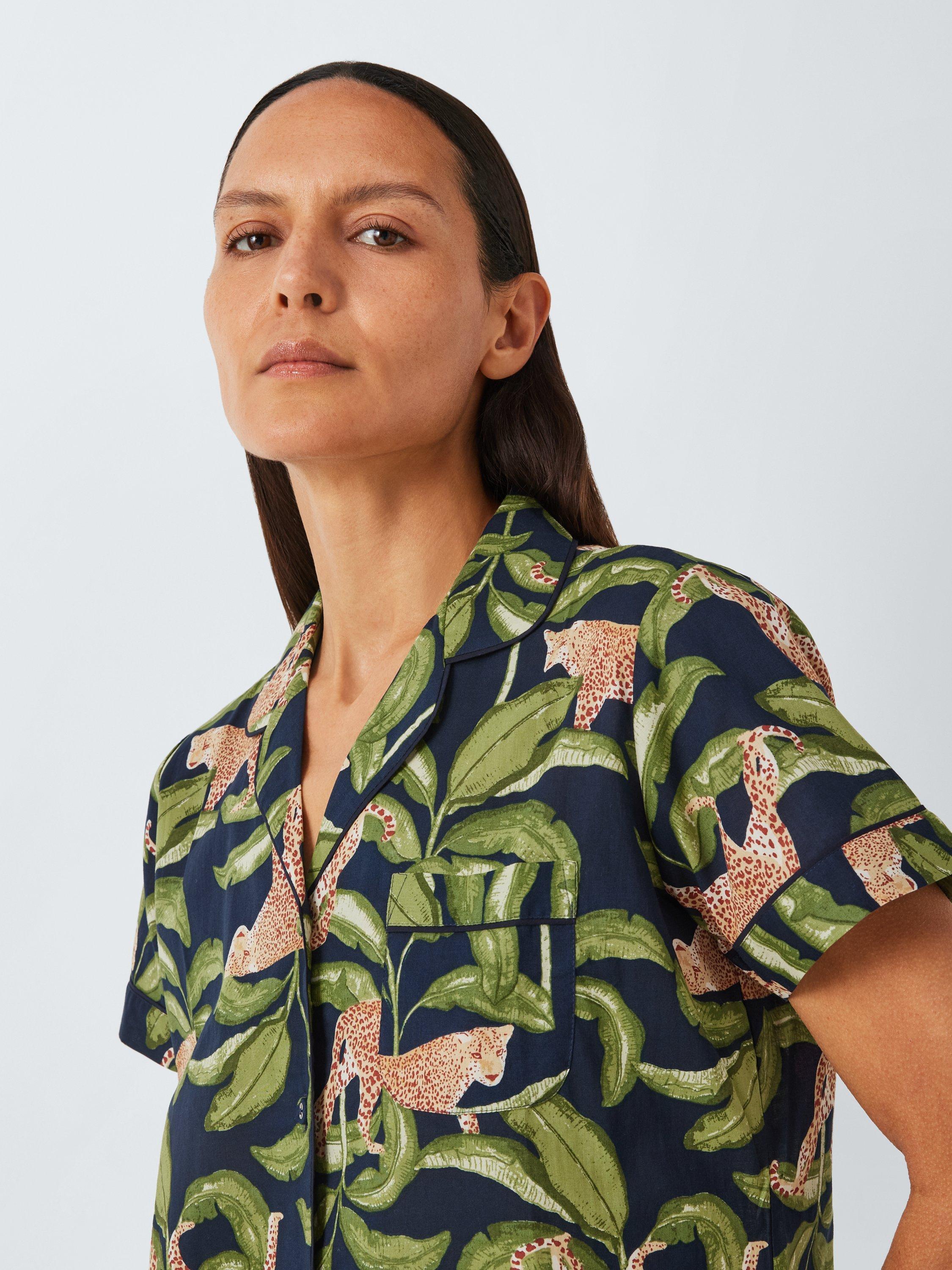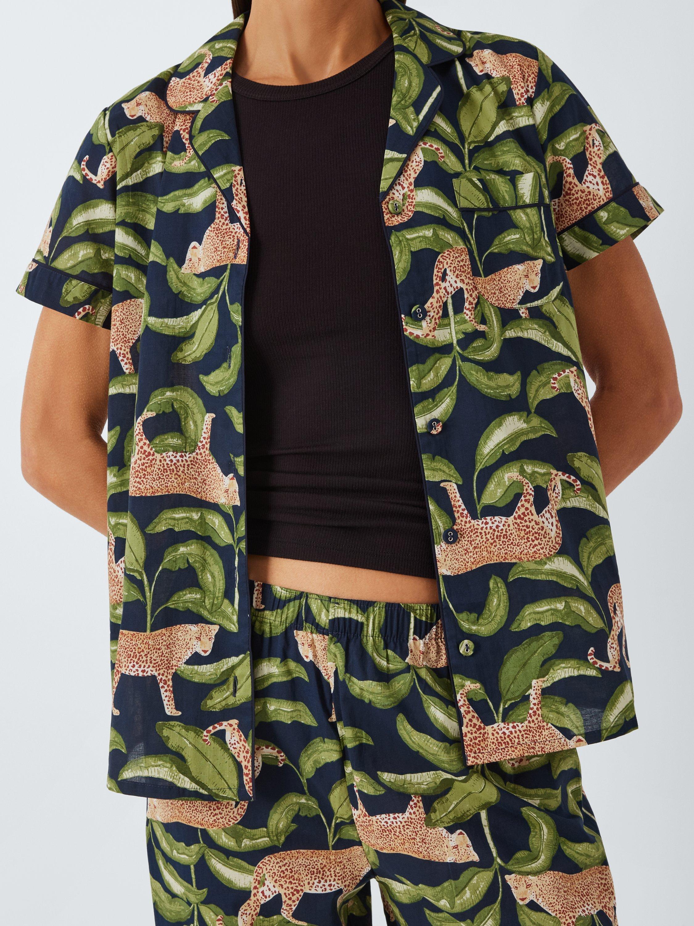 A classic pyjama shirt and bottoms set, but cropped for warmer nights. Made from 100% cotton for breathability and softness the set has a standout leopard design.