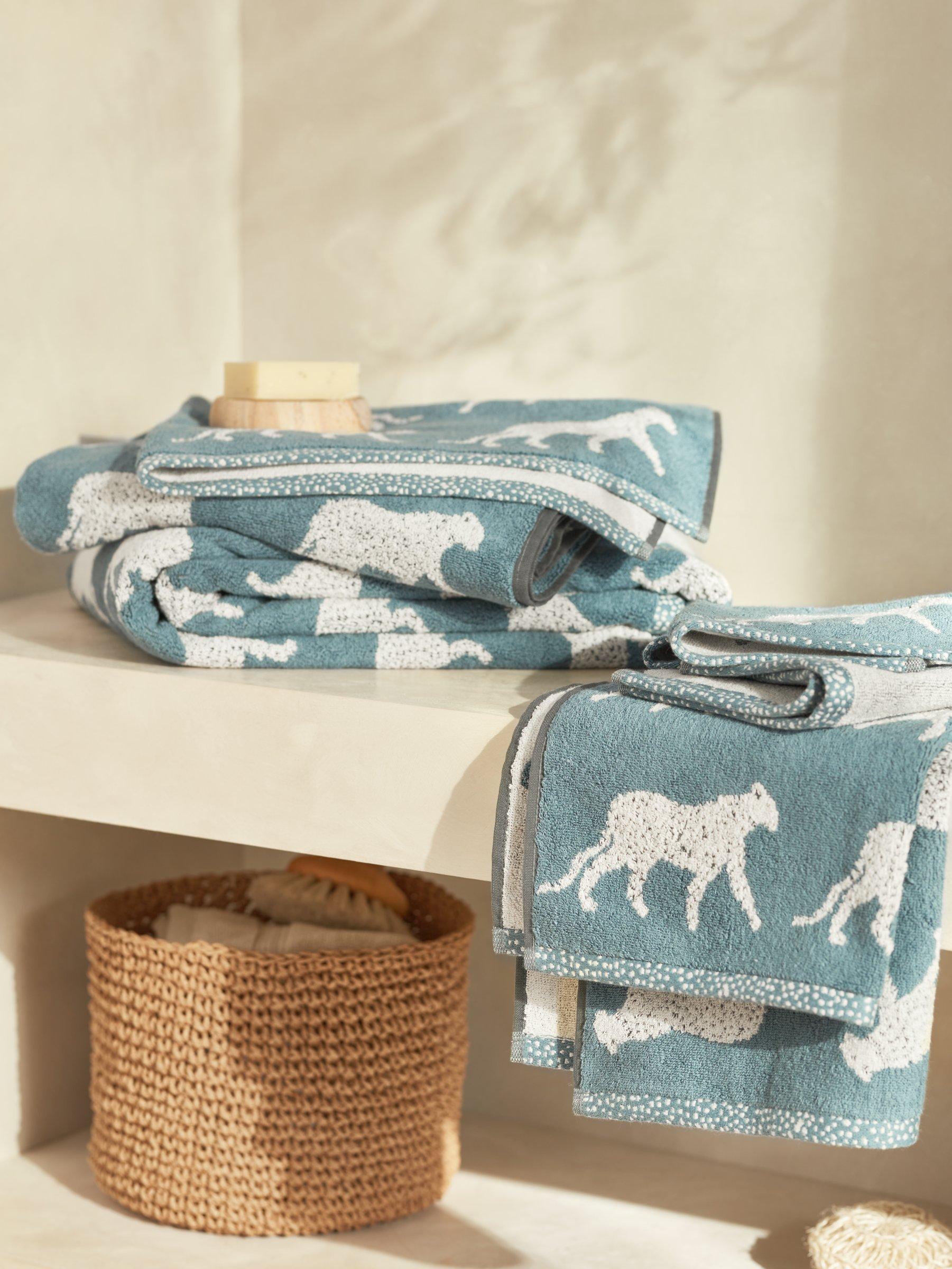 Leopards prowl across these soft cotton towels.