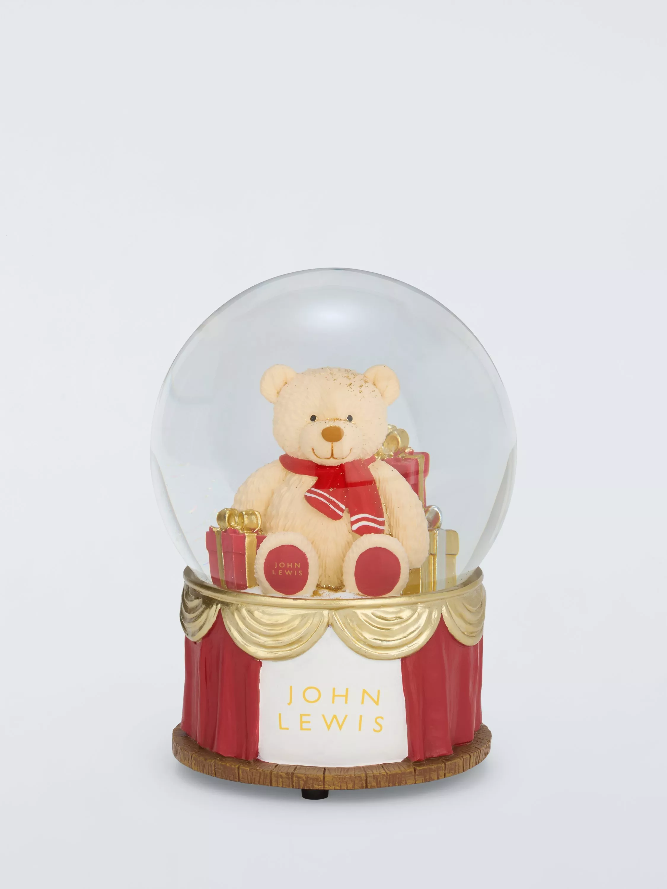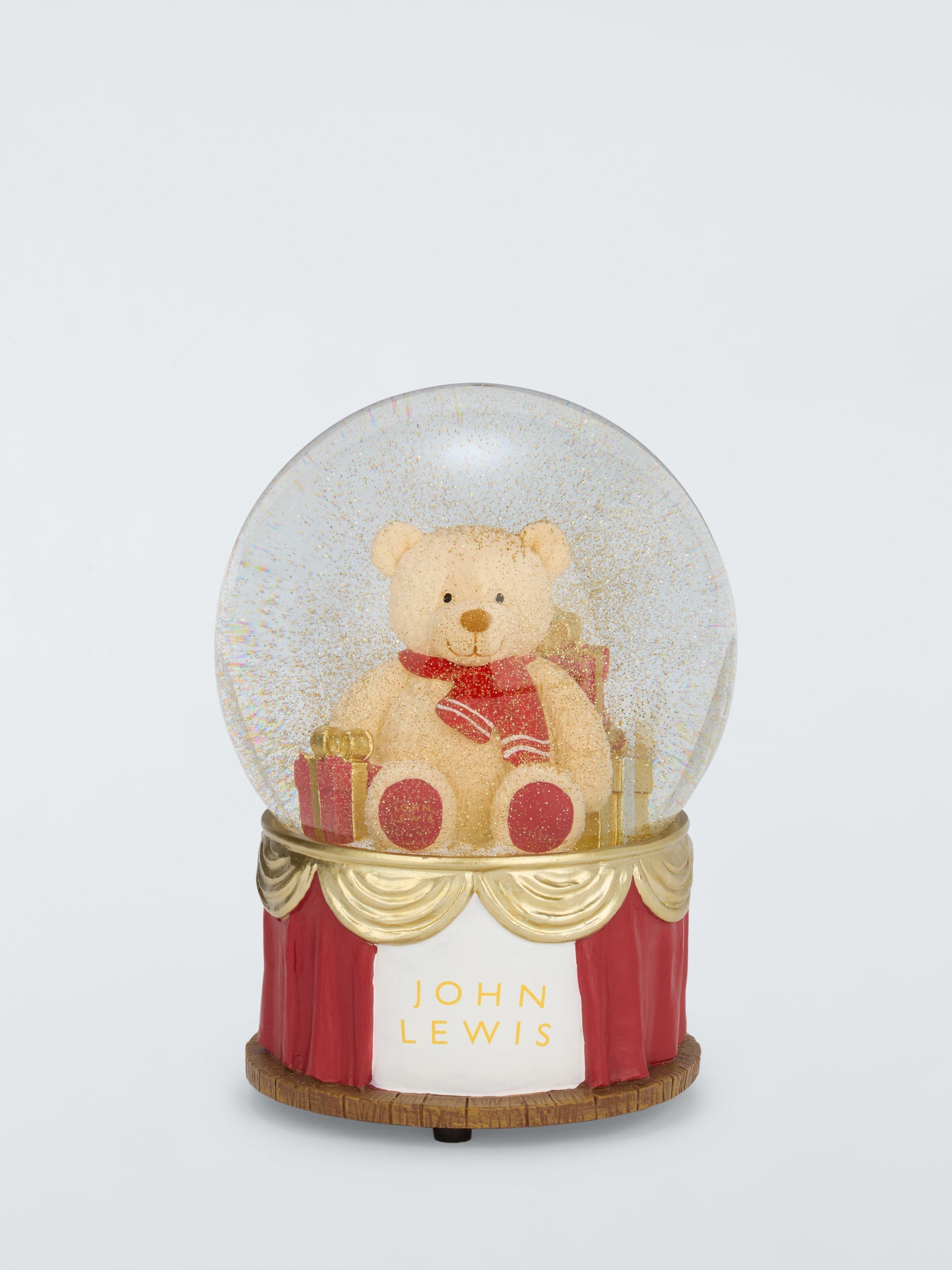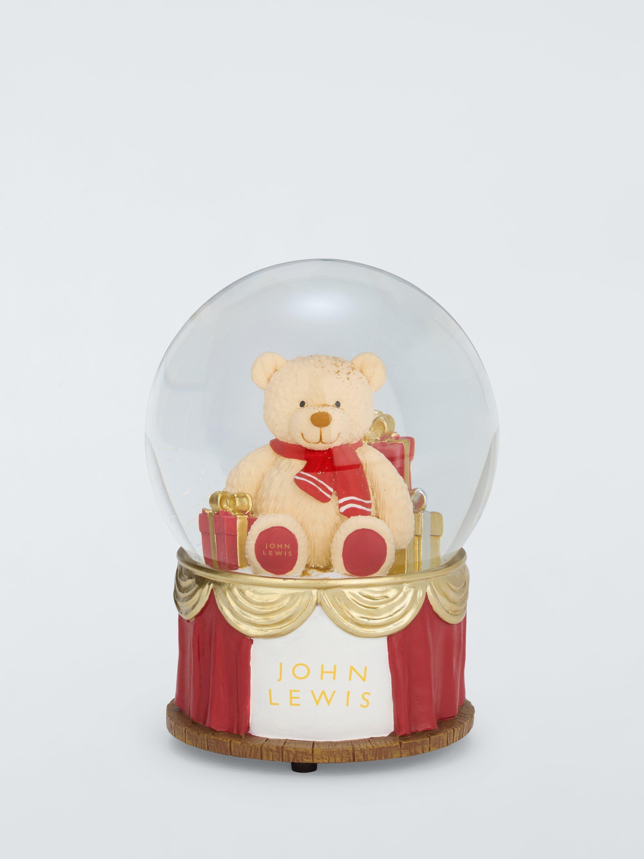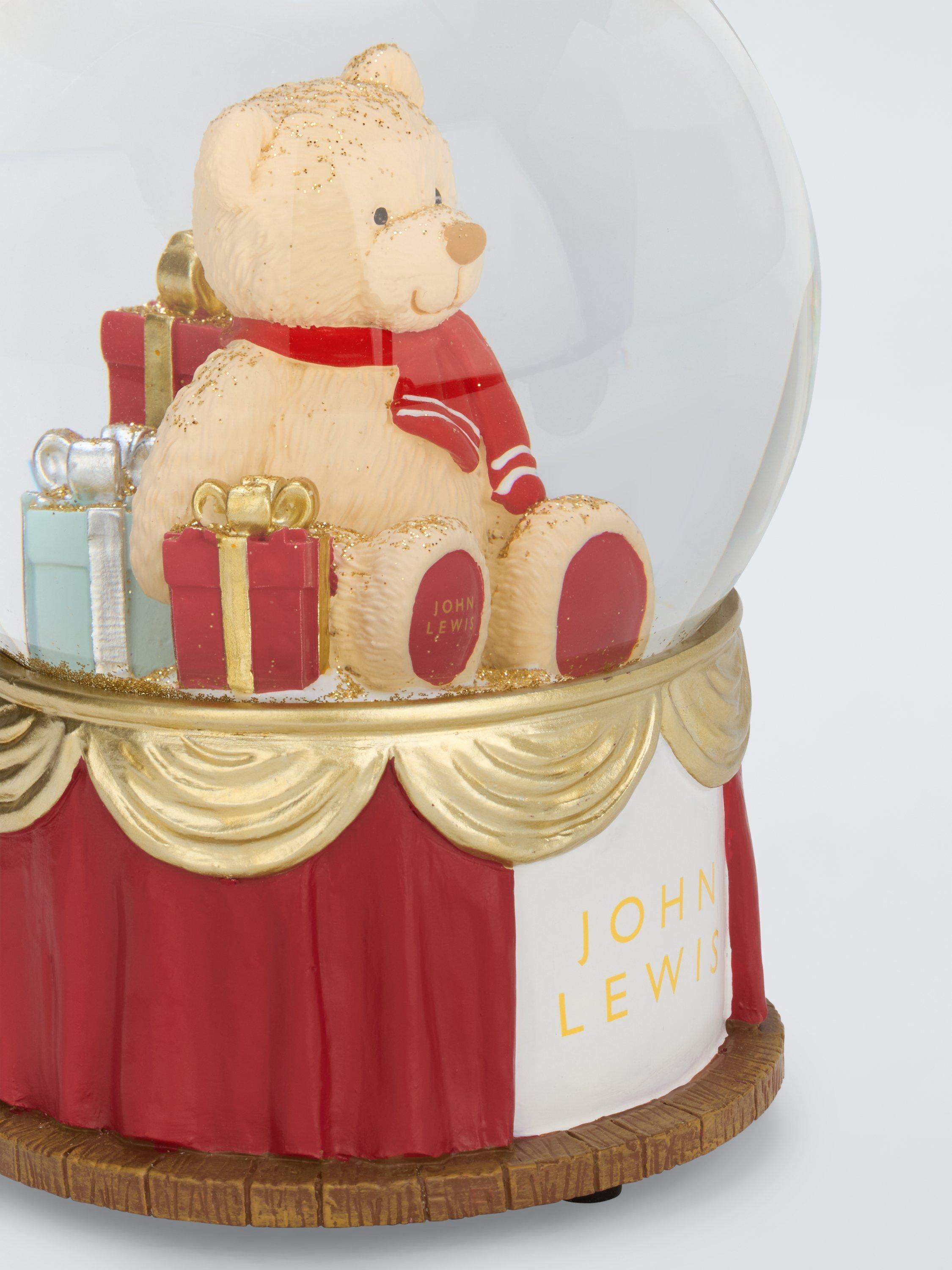 Lewis Bear sits happily in the snow with a pile of Christmas gifts. This snowglobe also plays "Jingle Bells" for extra festive fun.