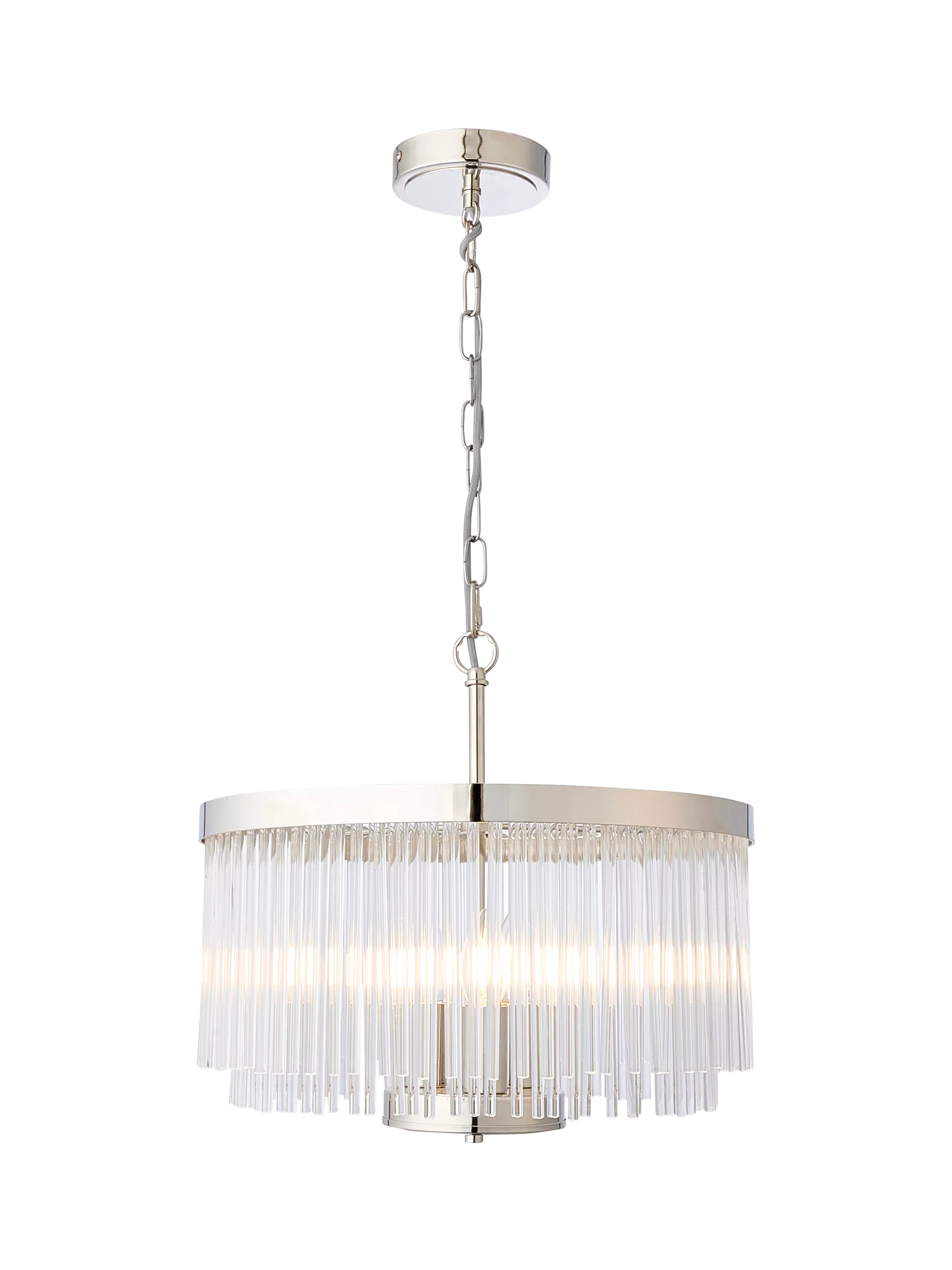Modern glass luxury - the Lexton Chandelier is created from hand formed glass rods, which give a beautiful diffused light. Three lamps top a plinth finished in contemporary brass. Available in two sizes and alongside coordinating items. It has a height adjustable chain and easy to hang glass pieces.