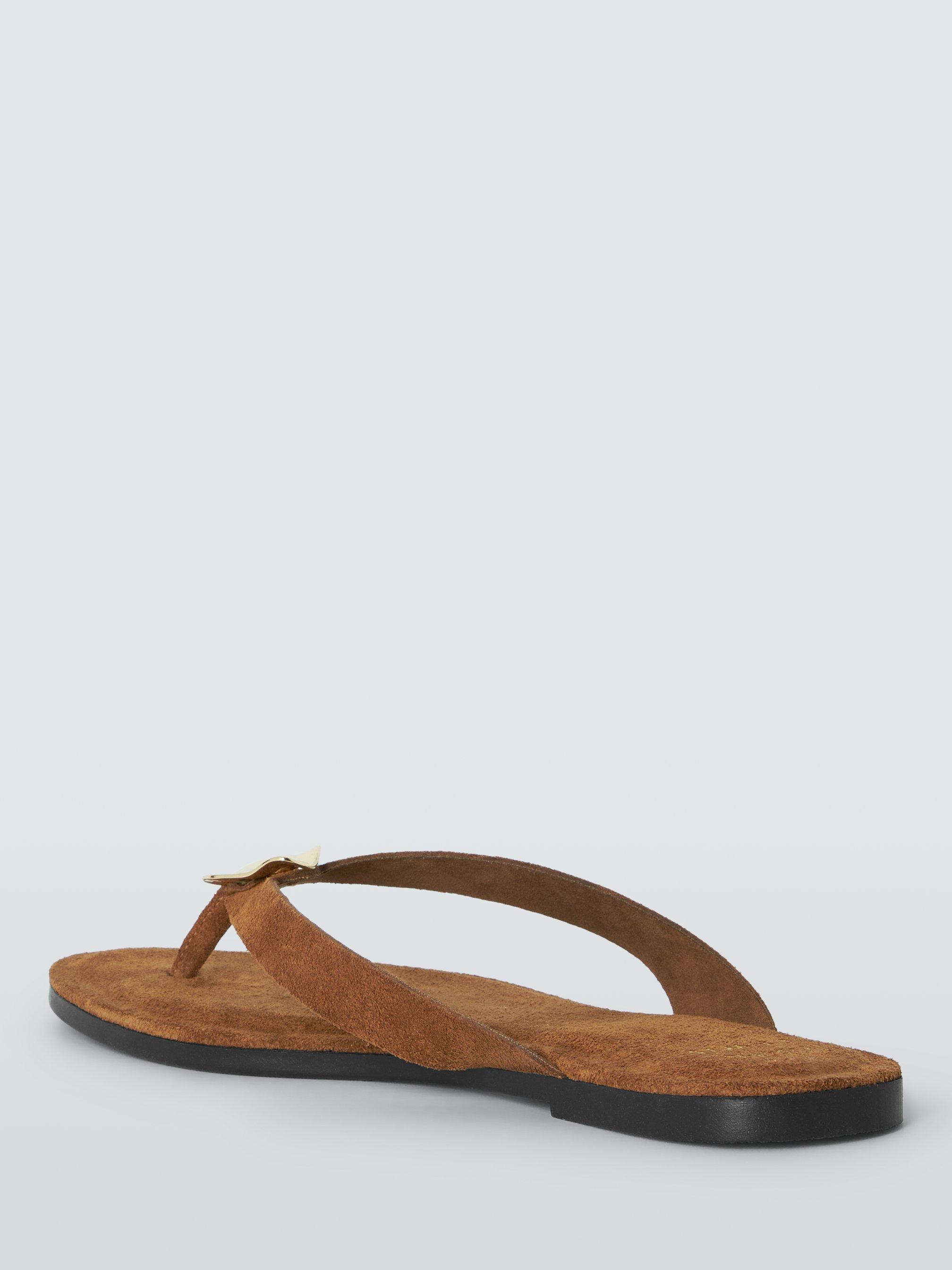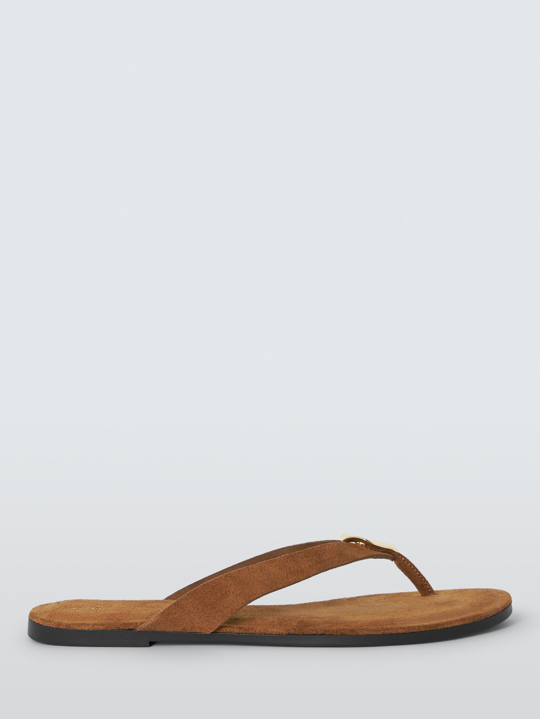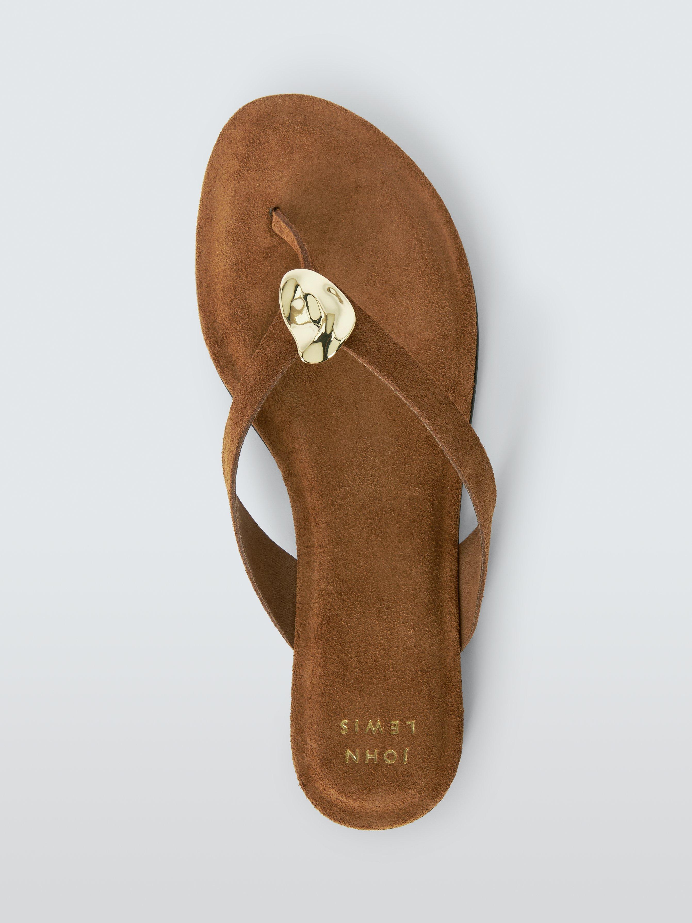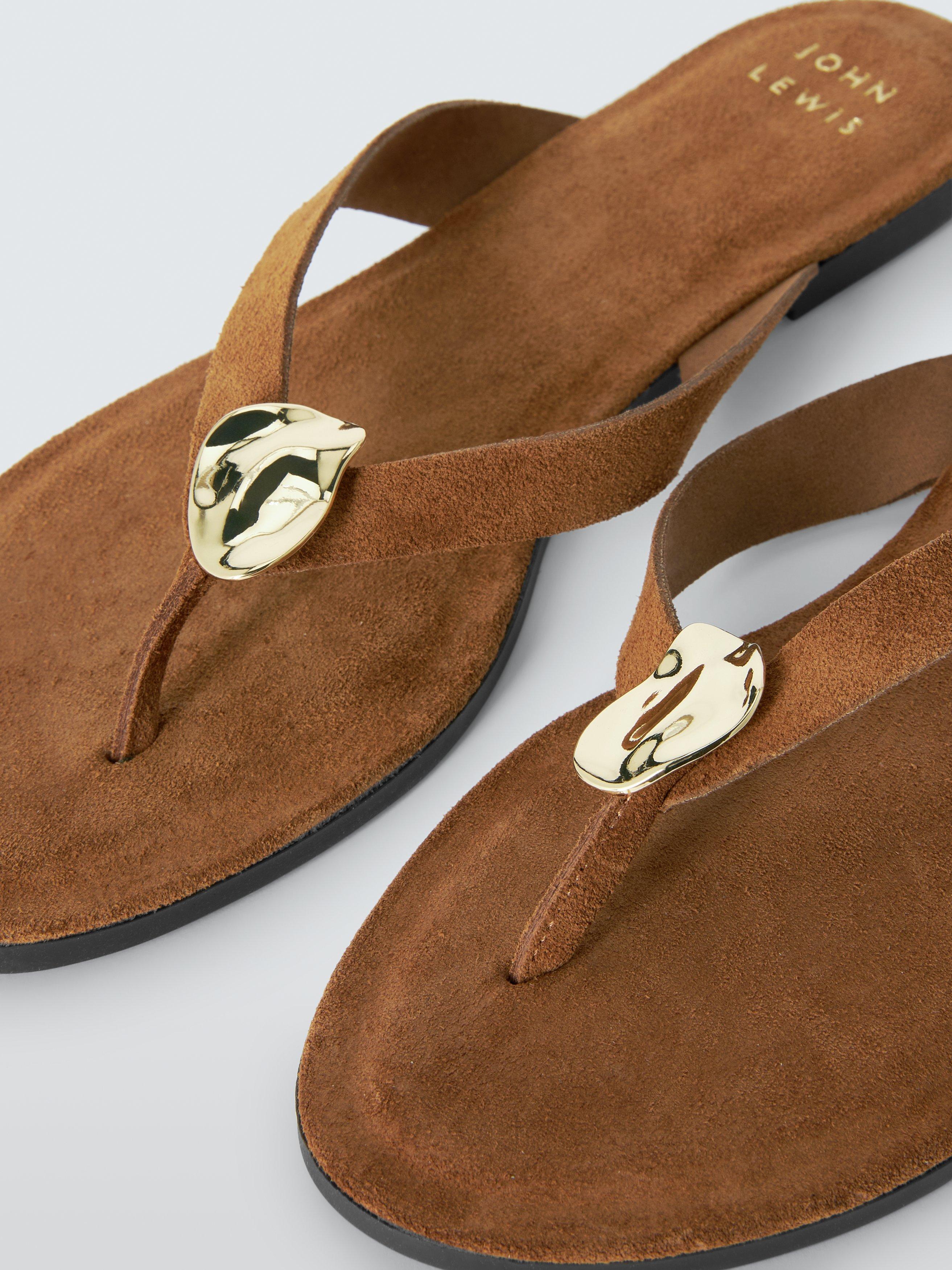 Step out in style with our Libby flat sandals, designed for us in Italy from soft brown suede. These sophisticated thongs feature distinctive polished gold metal hardware embellishment for a touch of glamour. A secure toe-post strap and low block heel provide all-day comfort, ideal for casual summer dressing.