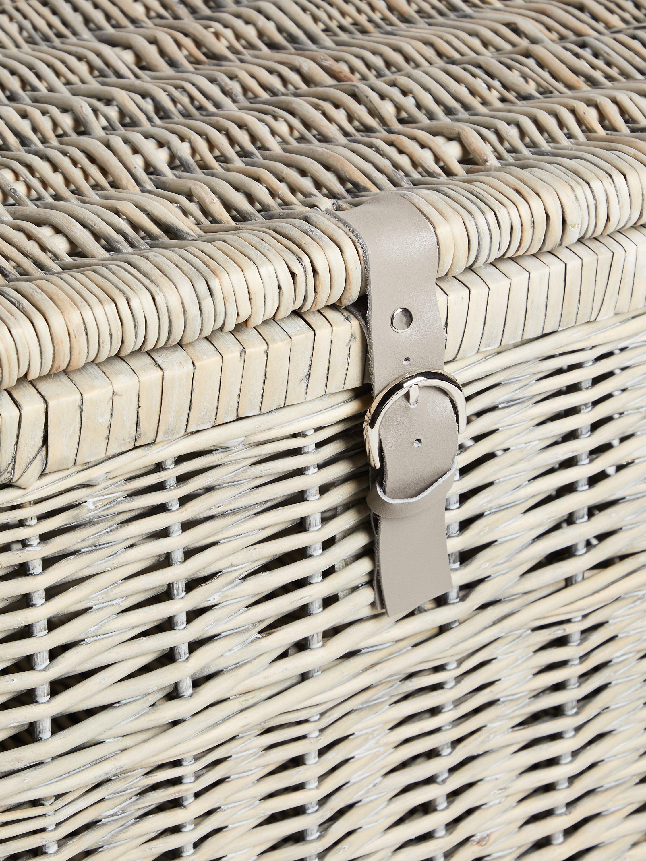 A grey-washed willow storage trunk with a leather fastening.
