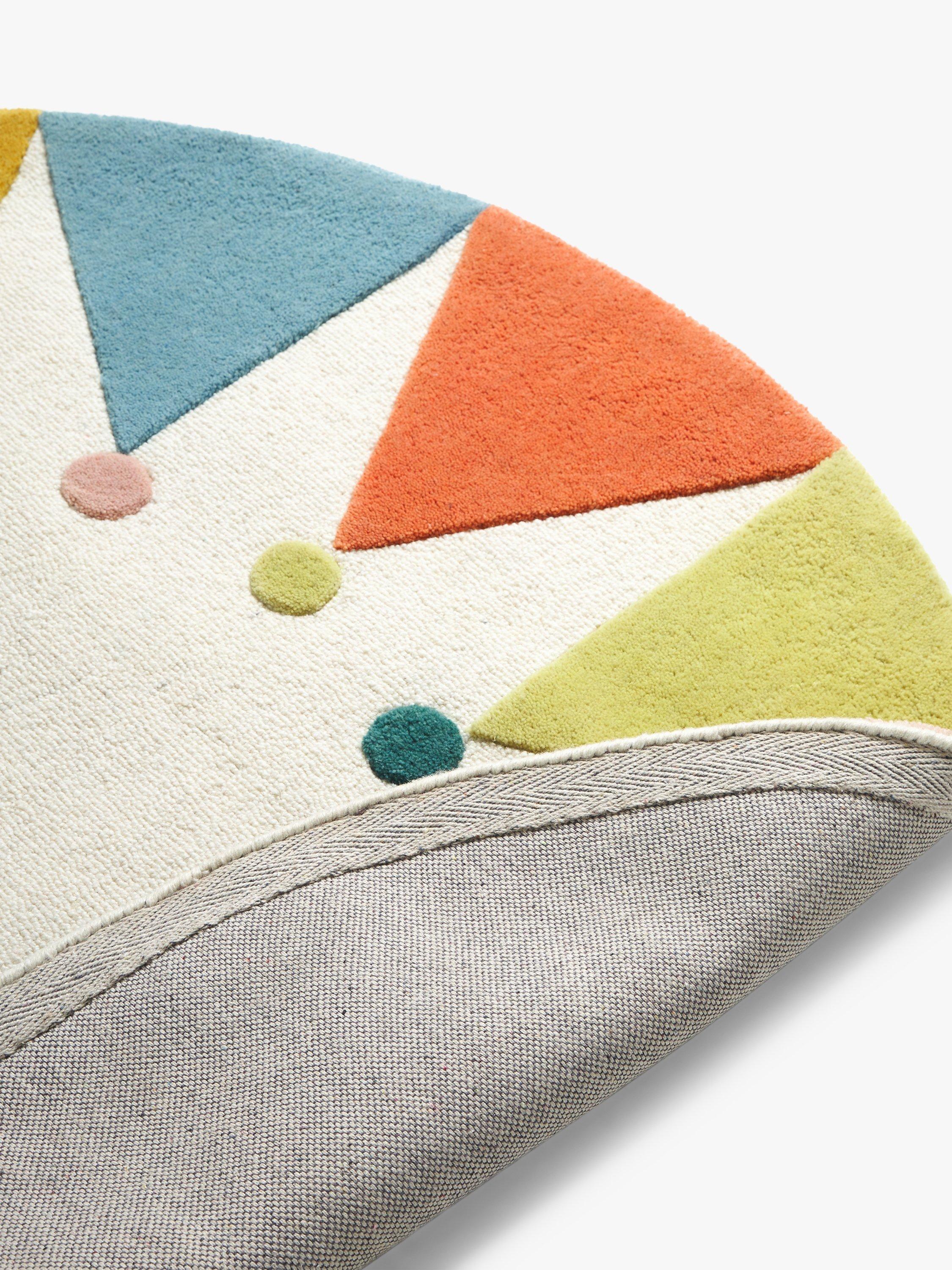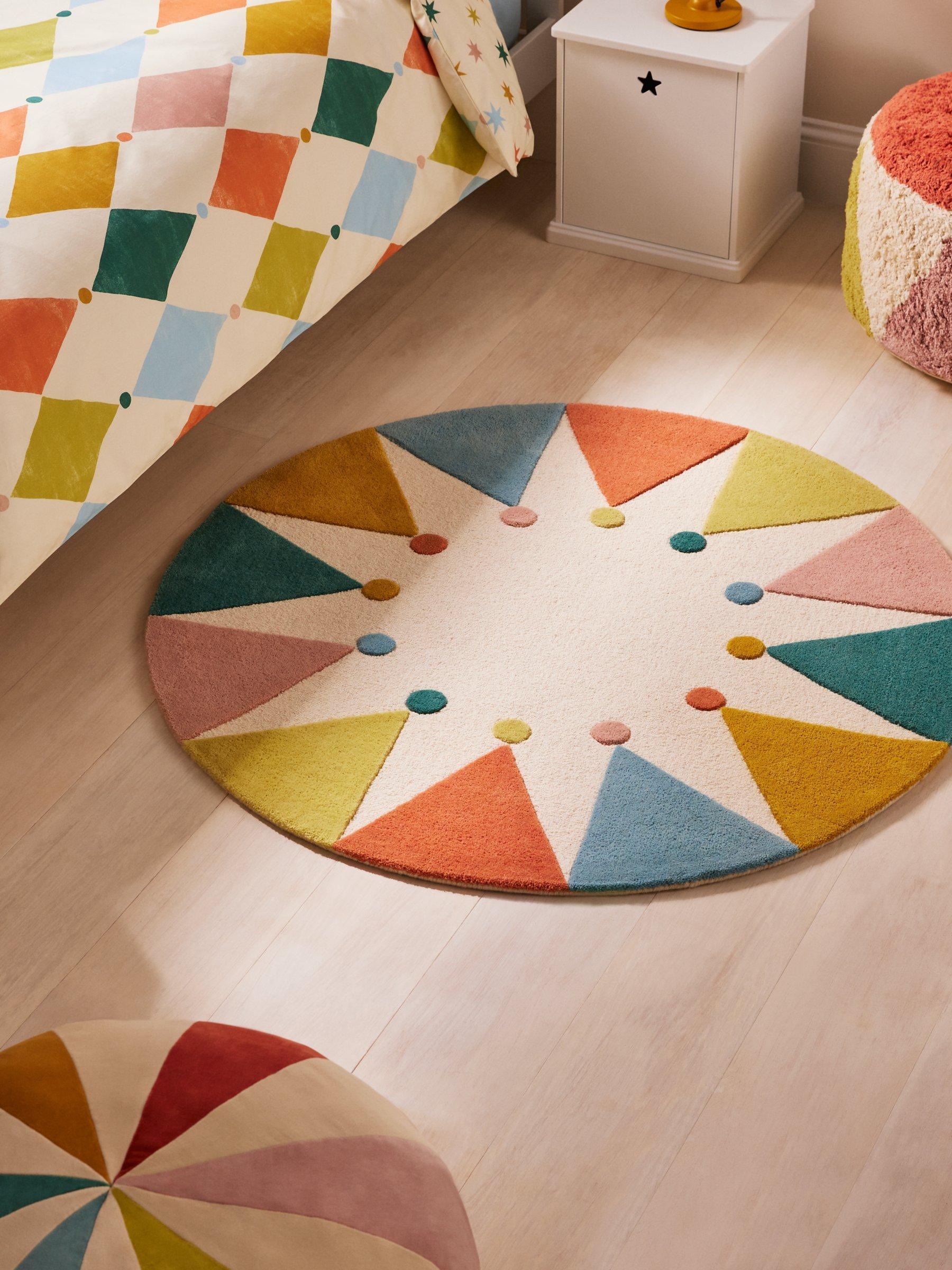 Bright and colourful, this circular rug features a carnival-inspired design. Made from pure wool, this hand-tufted rug will enliven any space.