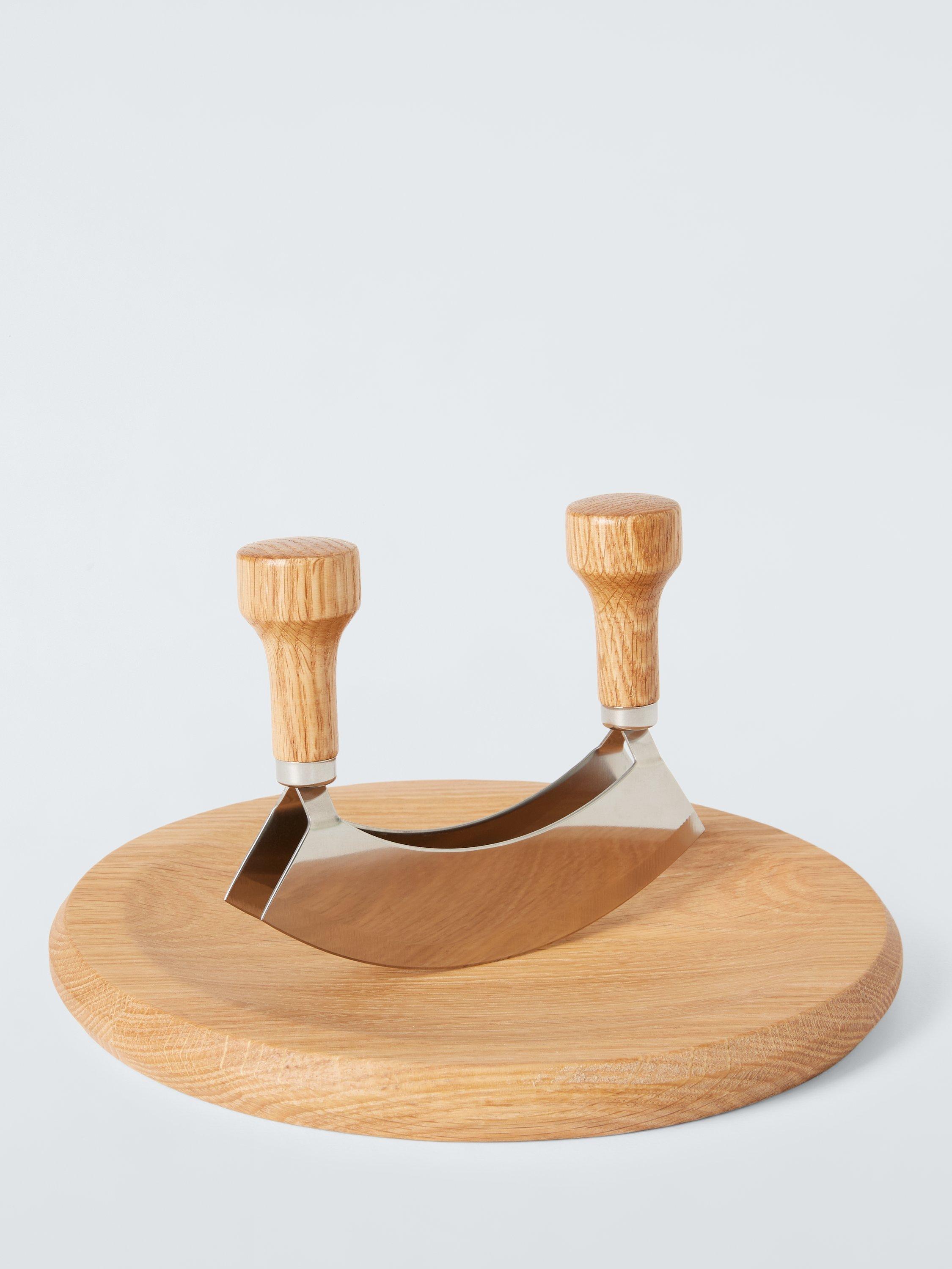 Mezzaluna with a curved stainless steel double blade, oak handles and oak chopping board. Use a simple rocking motion to quickly and finely chop garlic, herbs, onions and more.