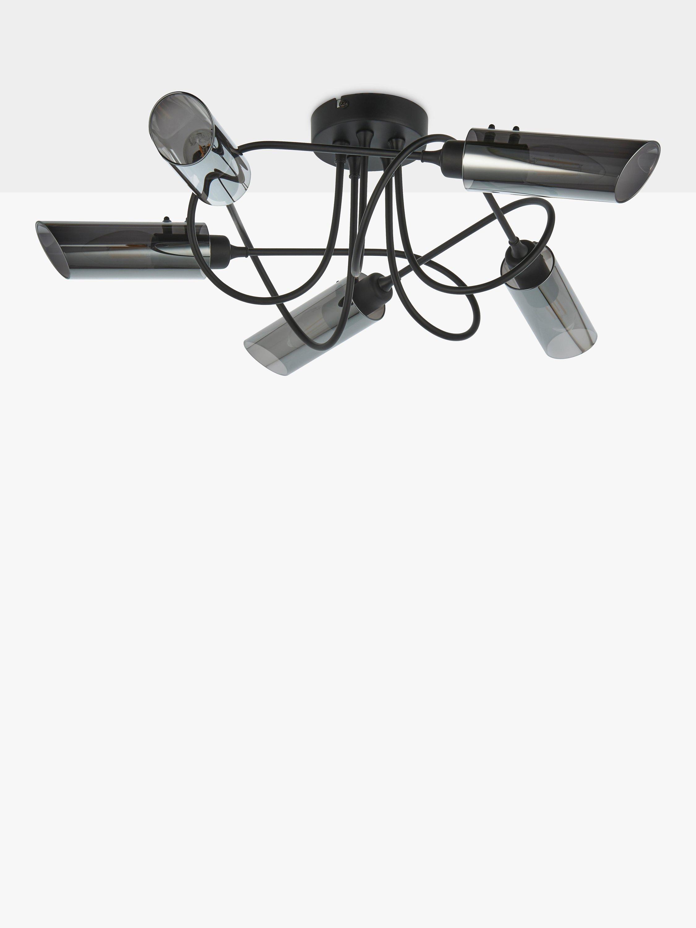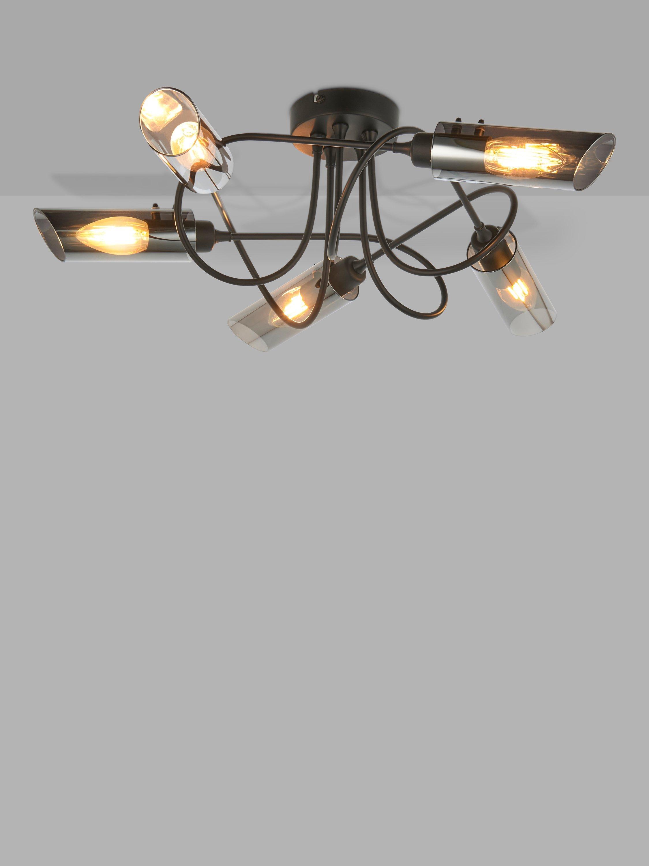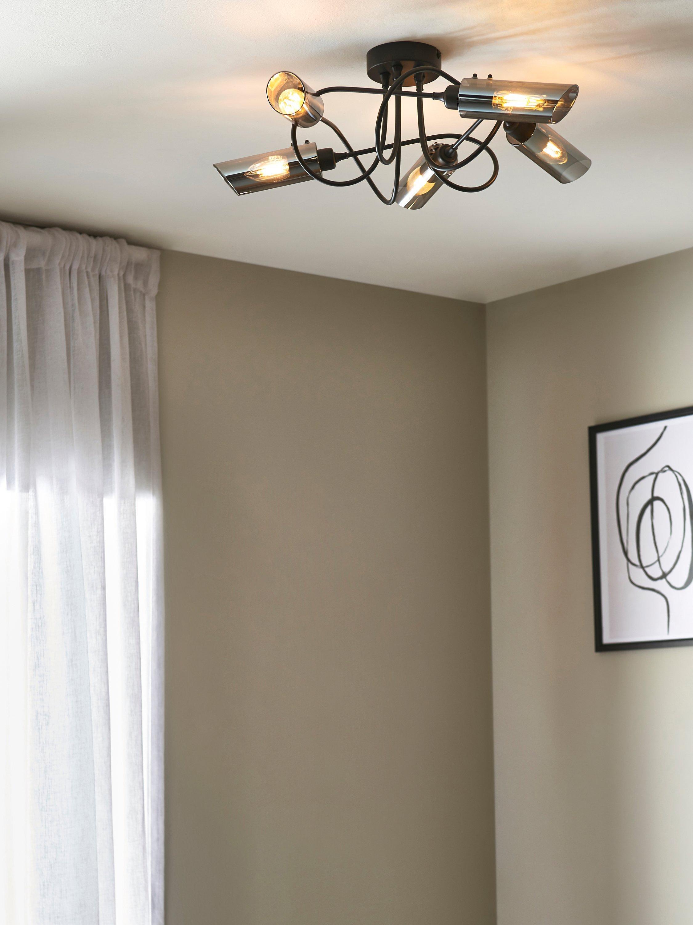 With five arms and a semi-flush design, this ceiling light will spread light around your room. We like the spiral shape of the arms which are finished in a contemporary matt black and feature smoke lustre shades, creating an ambient lighting effect. Ideal for rooms with a low ceiling.