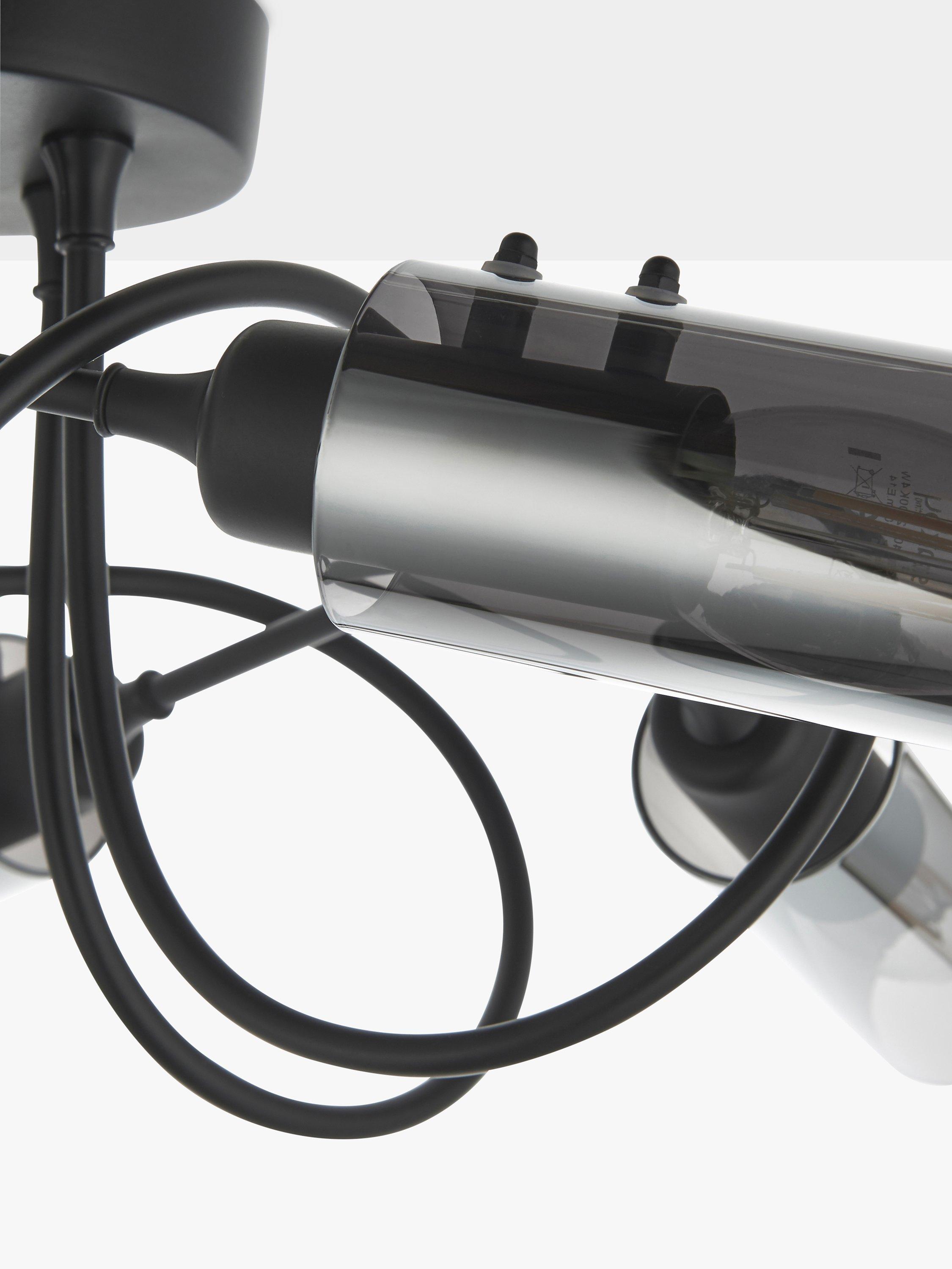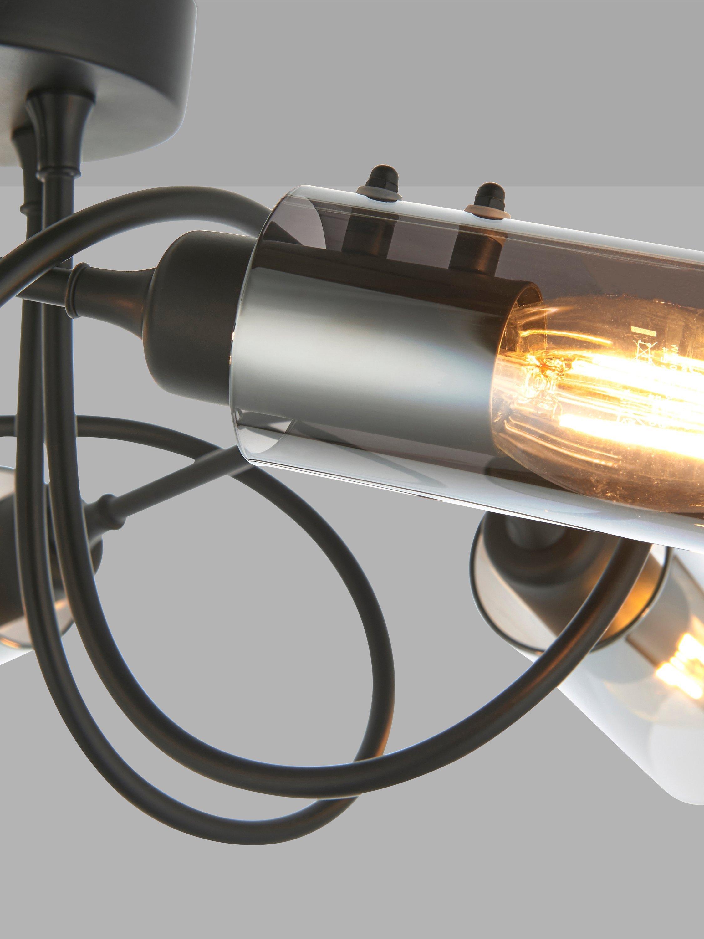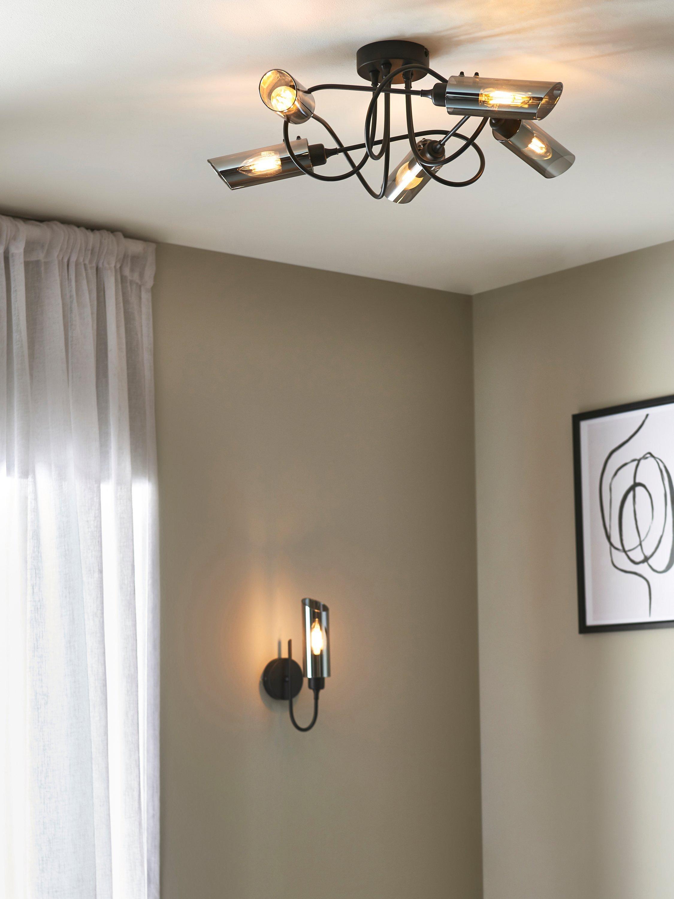 With five arms and a semi-flush design, this ceiling light will spread light around your room. We like the spiral shape of the arms which are finished in a contemporary matt black and feature smoke lustre shades, creating an ambient lighting effect. Ideal for rooms with a low ceiling.