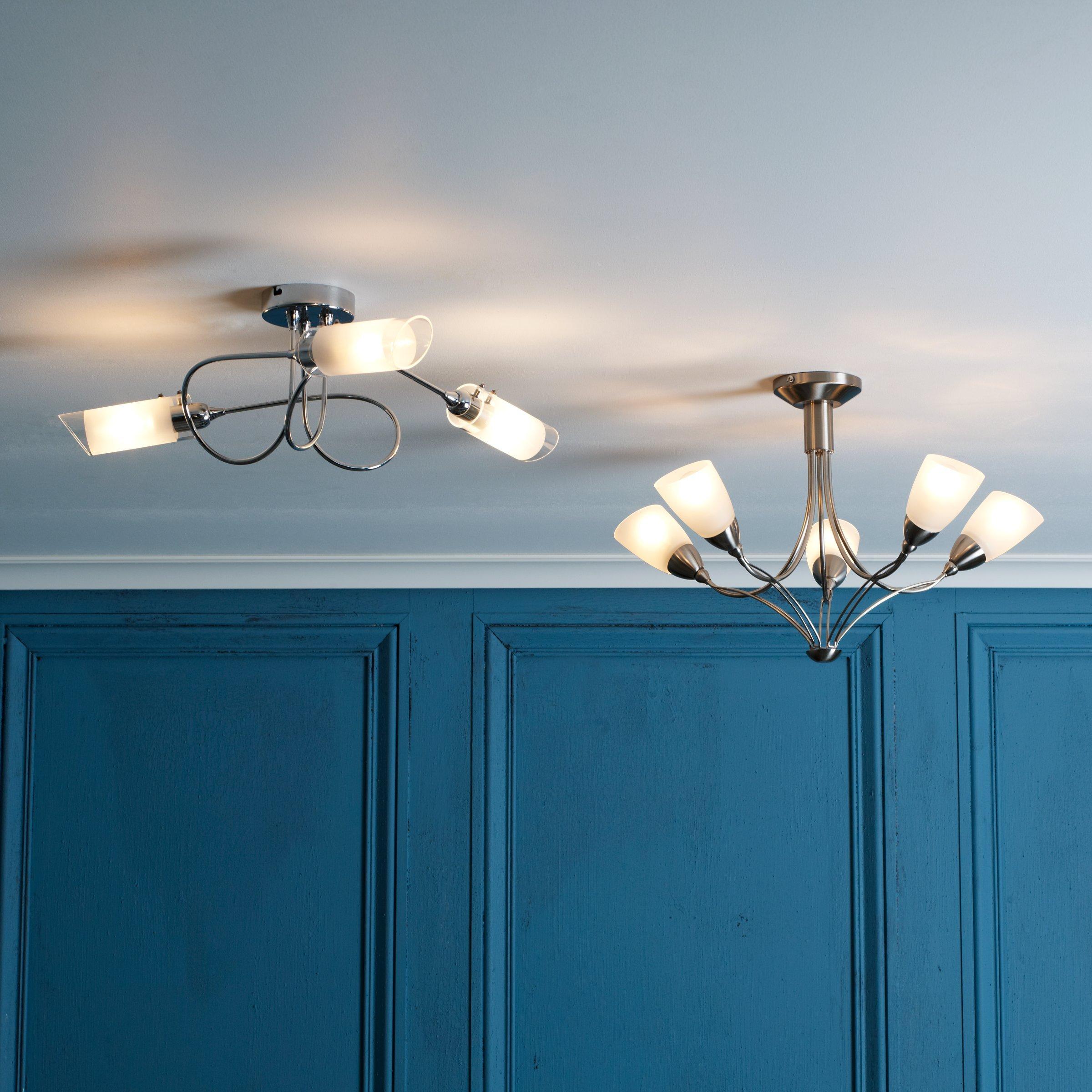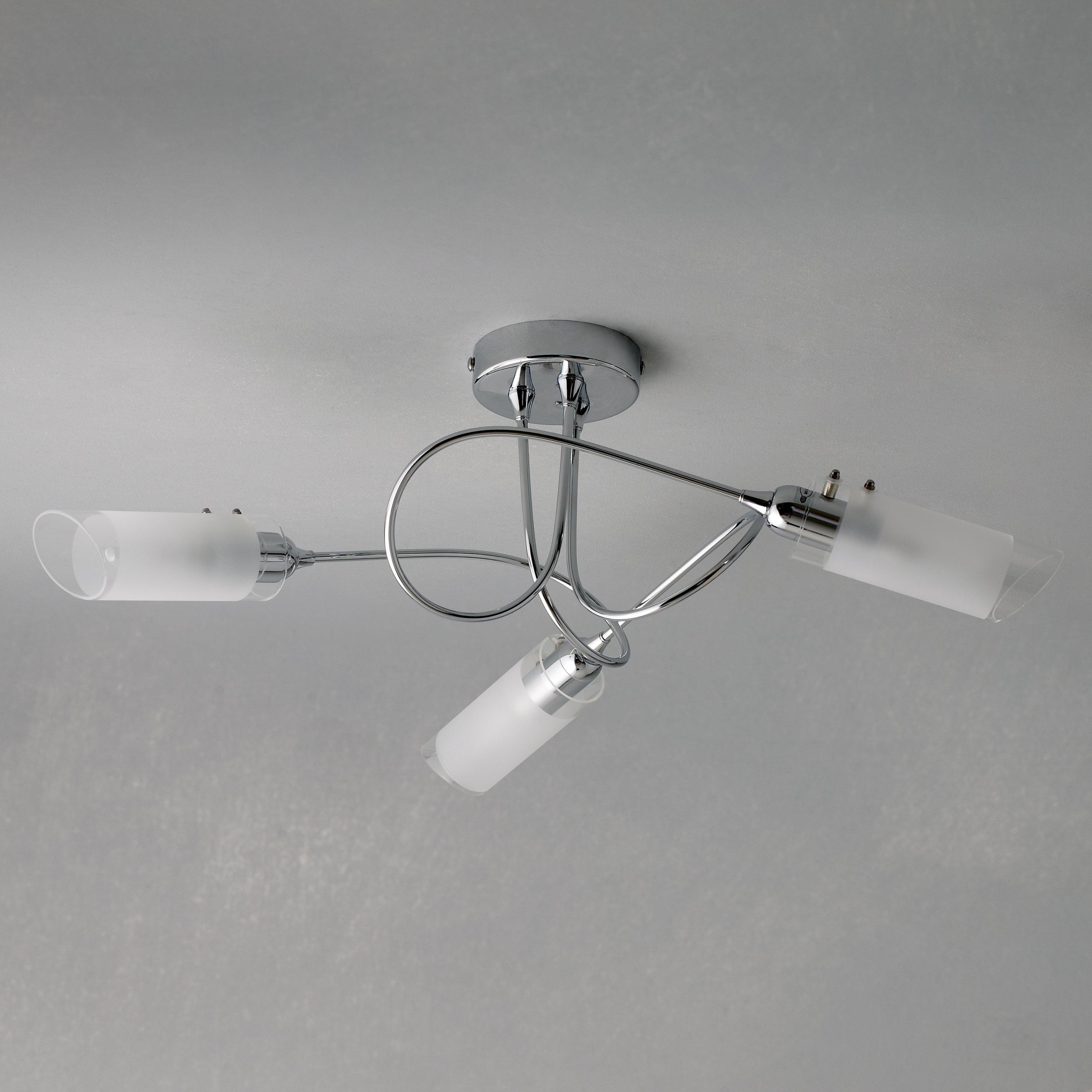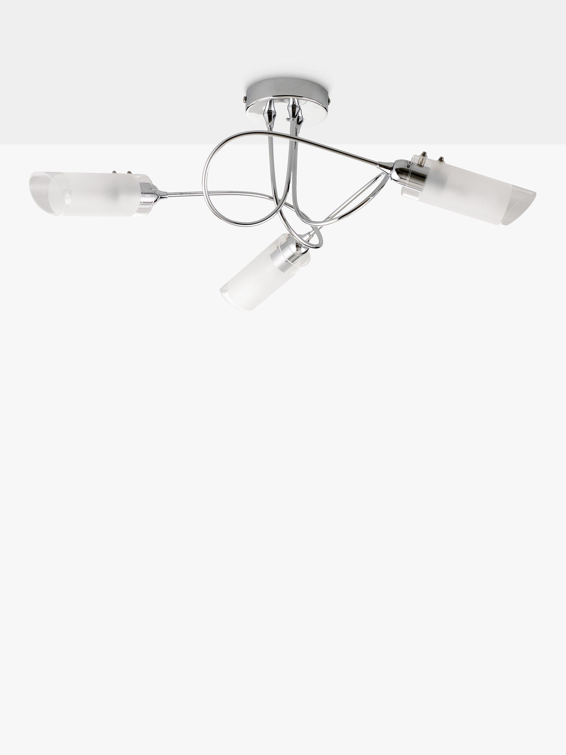With three arms and a semi-flush design, this ceiling light will spread light around your room. We like the spiral shape of the arms which are finished in a smart polished chrome and feature frosted shades for a more diffused lighting effect. Ideally installed in rooms with a low ceiling.