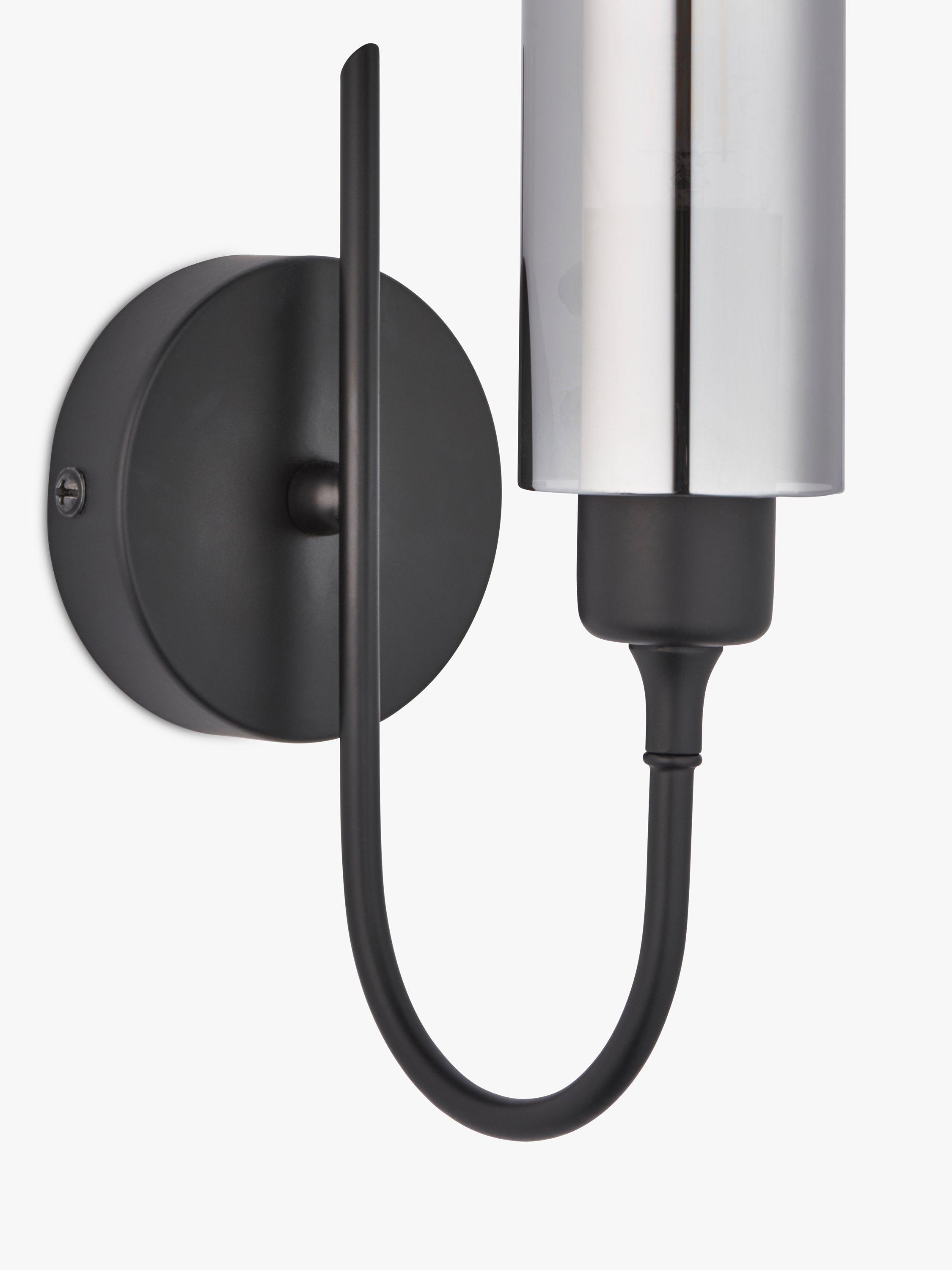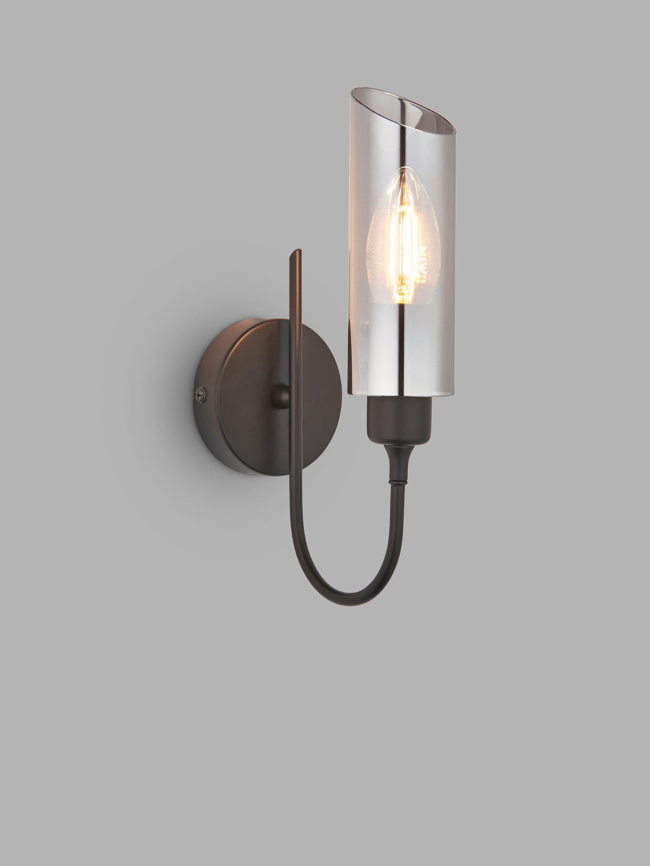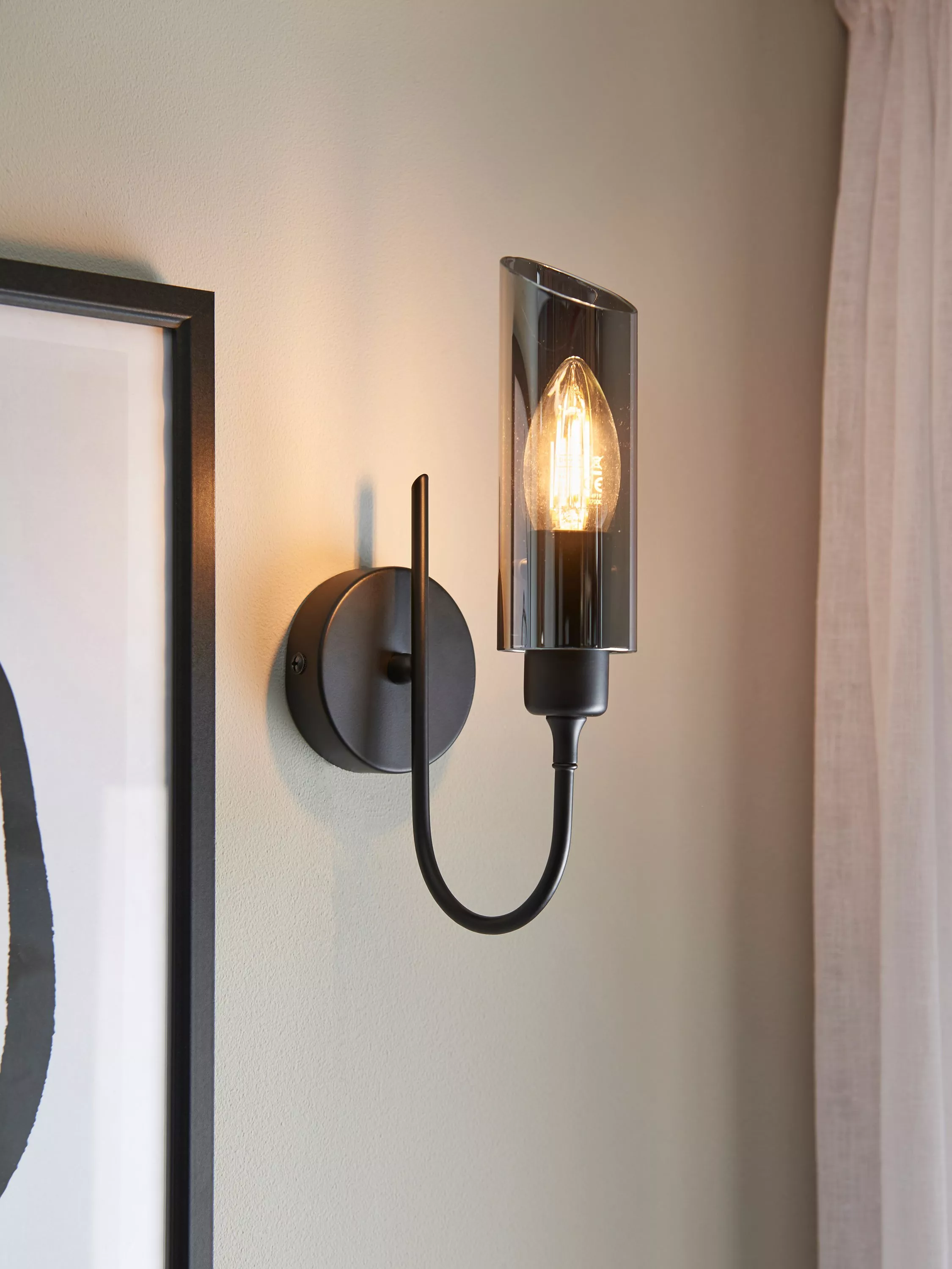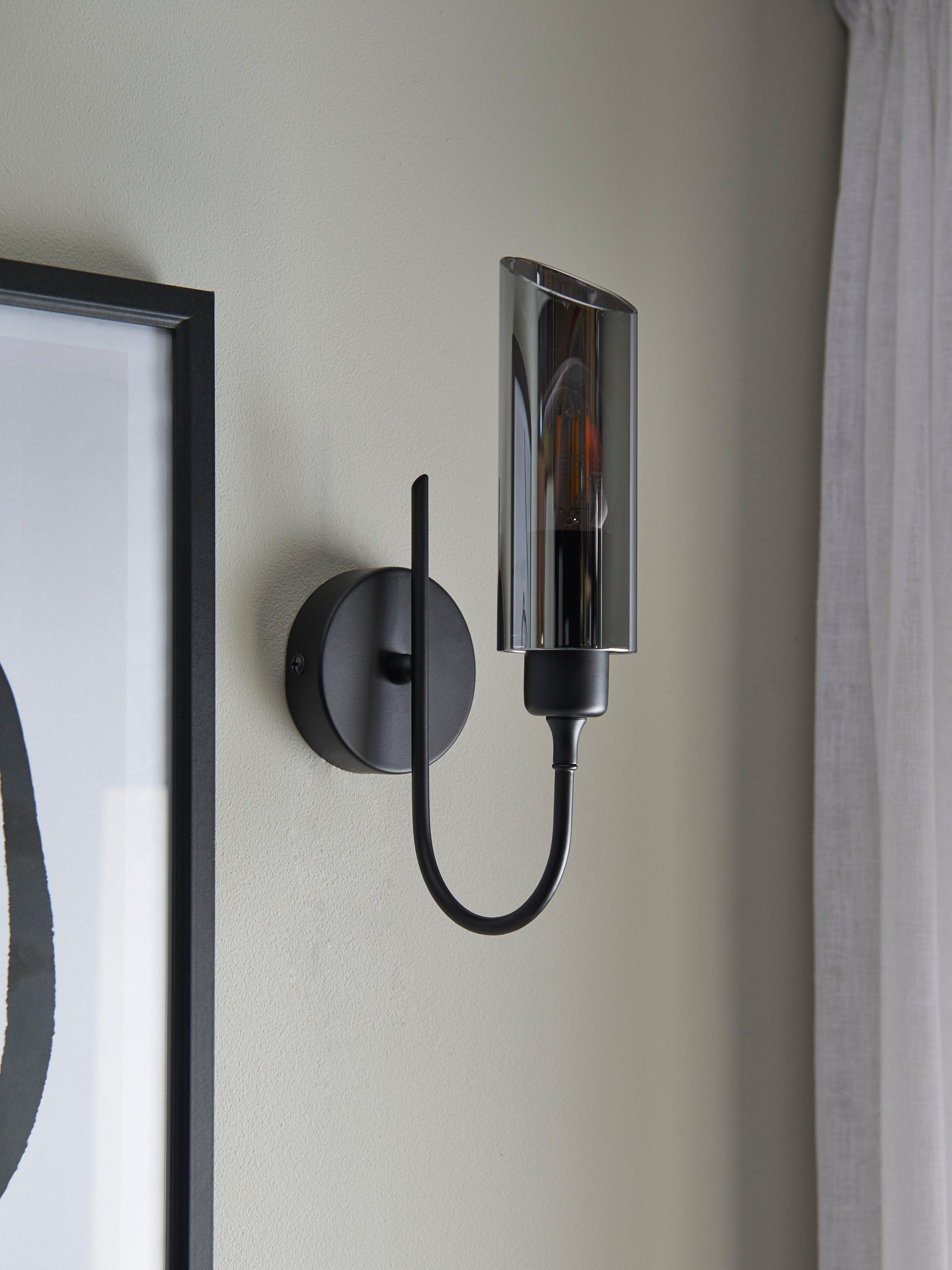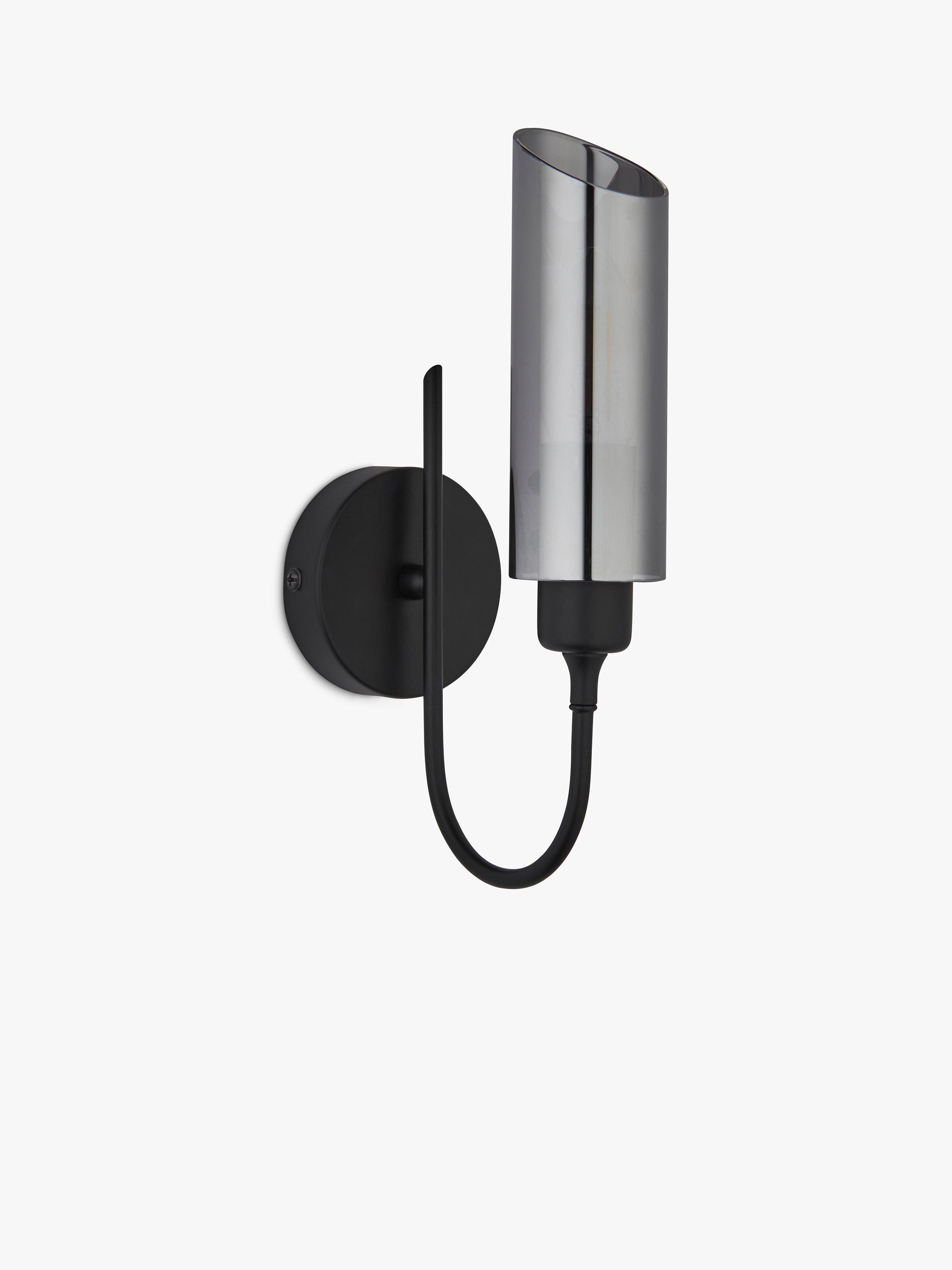 Refined simplicity, this single arm wall light features a smoke lustre glass shade on a modern matt black plate. Ideal for creating an inviting ambience in your space, at a great price.