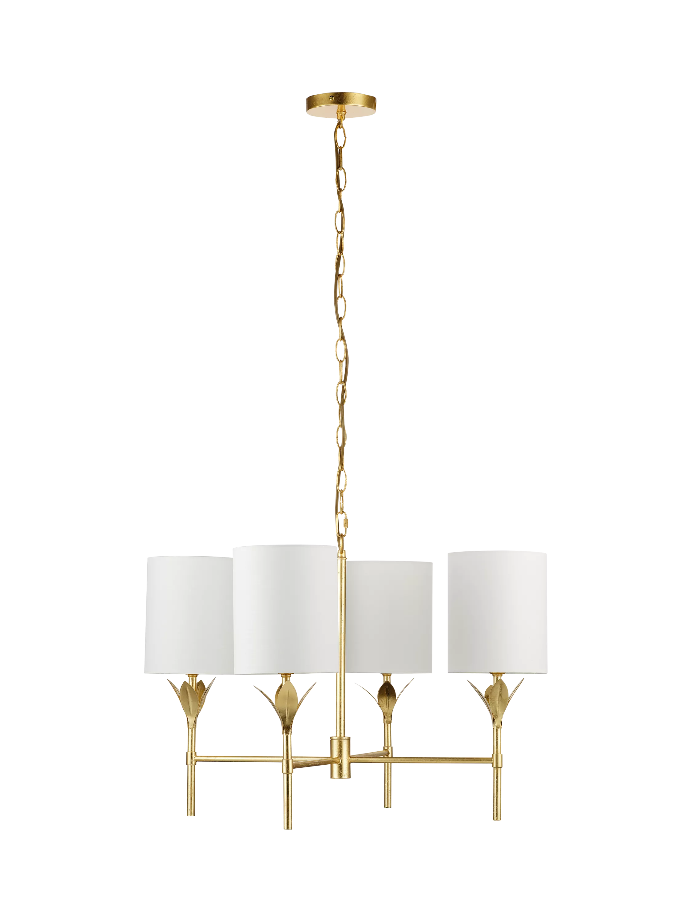 Add a touch of elegance to your space with this stunning chandelier. Featuring a crafted brass-finished metal frame with delicate leaf accents. This ceiling light perfectly updates a classic design with the soft light from four cylindrical white fabric shades. Works in any room.