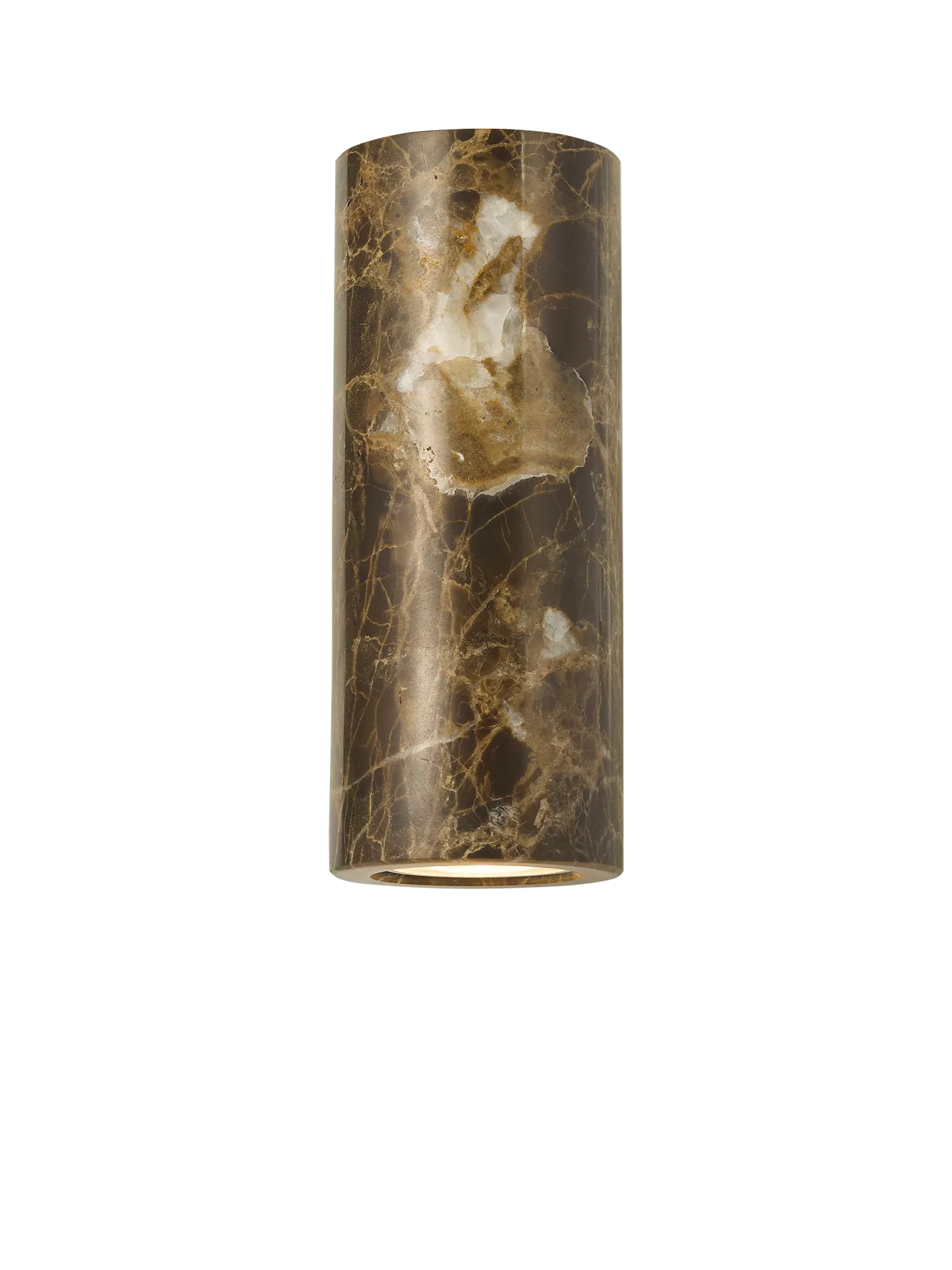 The Linea wall light showcases cylinder shaped natural marble and a contrasting metal back plate.