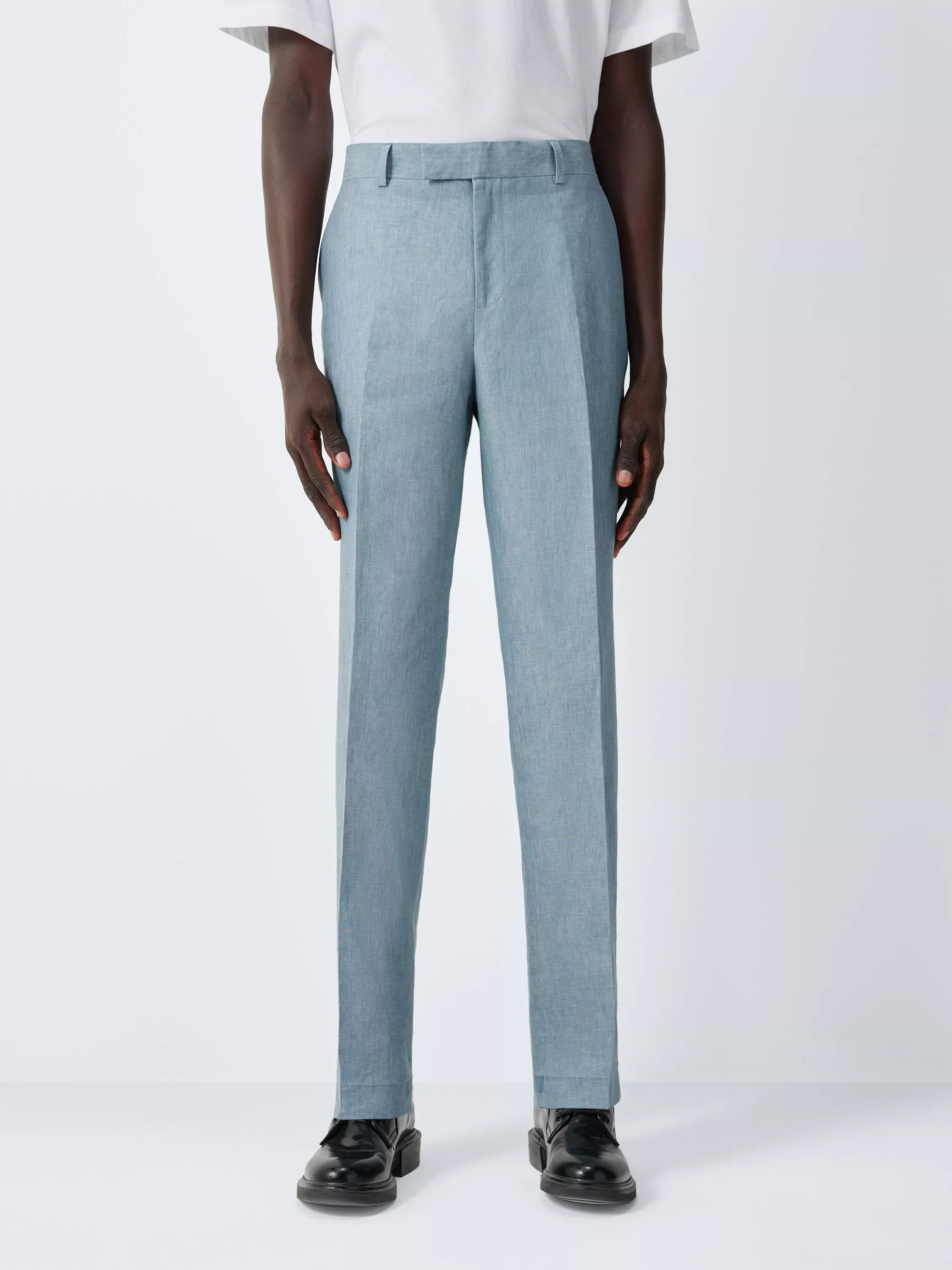 Tailoring touches include a waistband extension with hook-and-bar fastening. The trousers have a zip fly, side pockets and double jet back pockets with mock horn button fastenings. Team them with the matching linen suit blazer to complete the look.