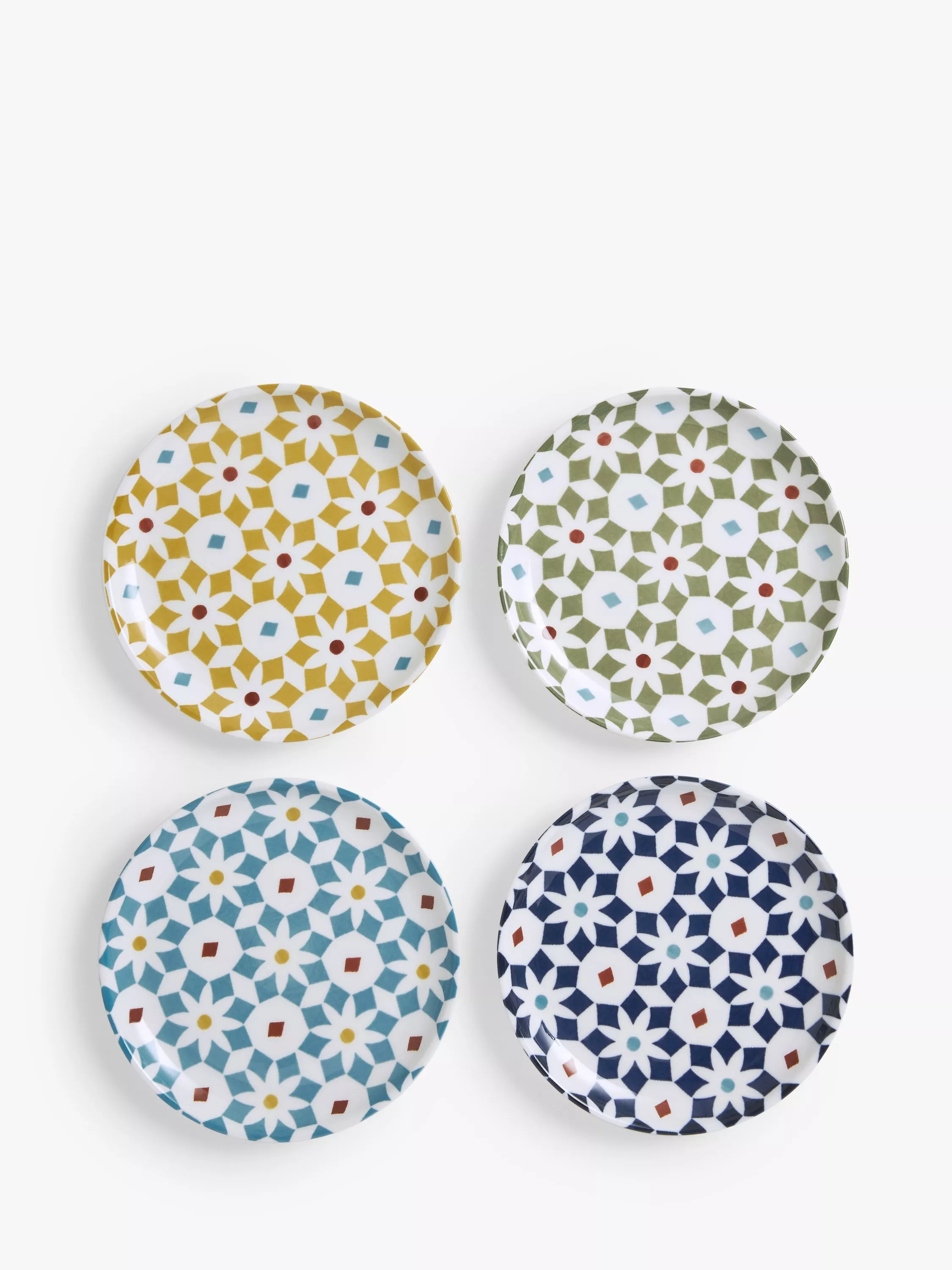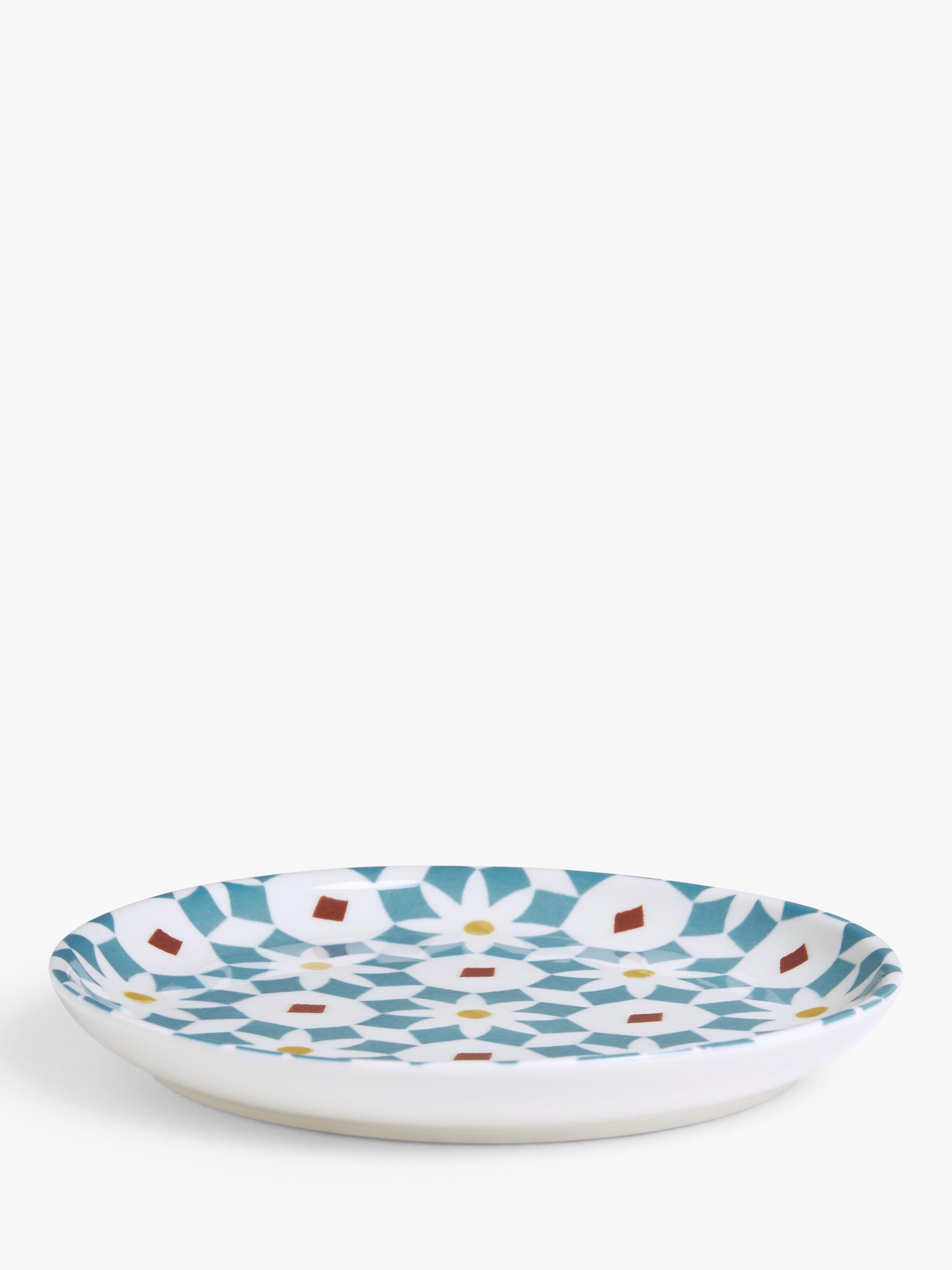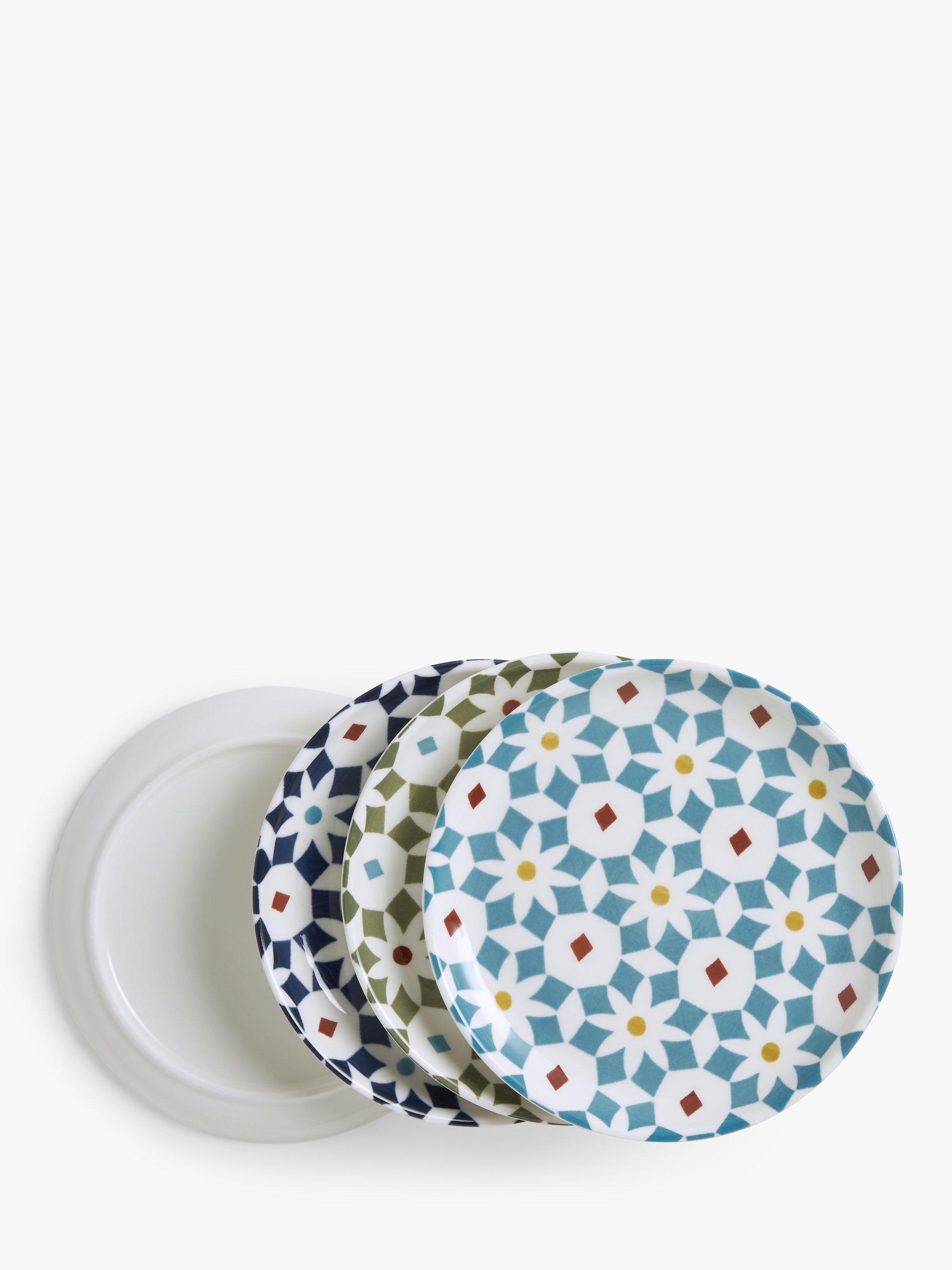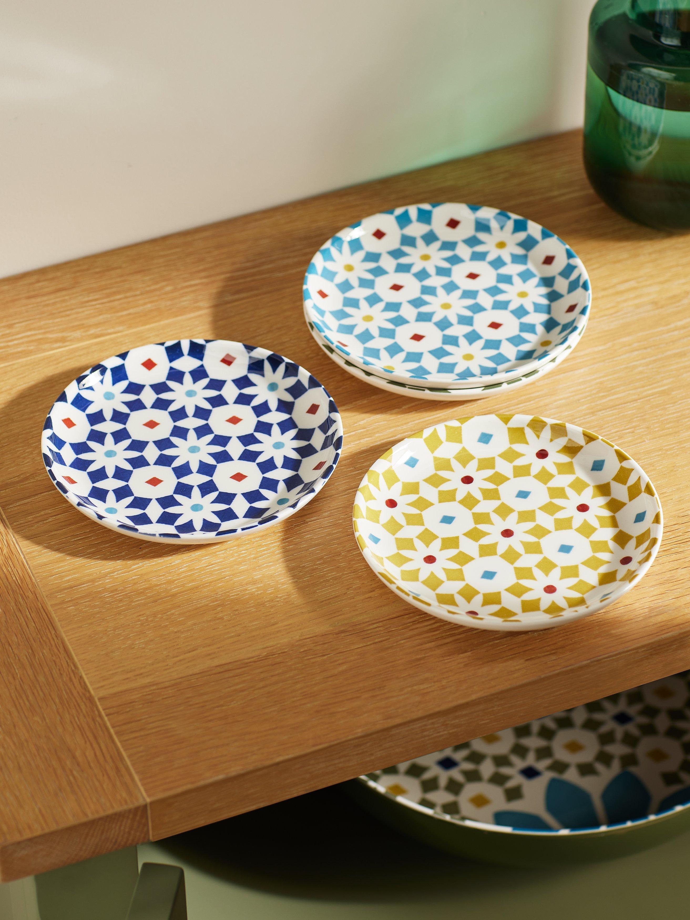 Four tapas plates in different colours, from our Lisbon range, inspired by the famous patterned tiles found throughout the city. Made of fine china, they're microwave, freezer and dishwasher safe.