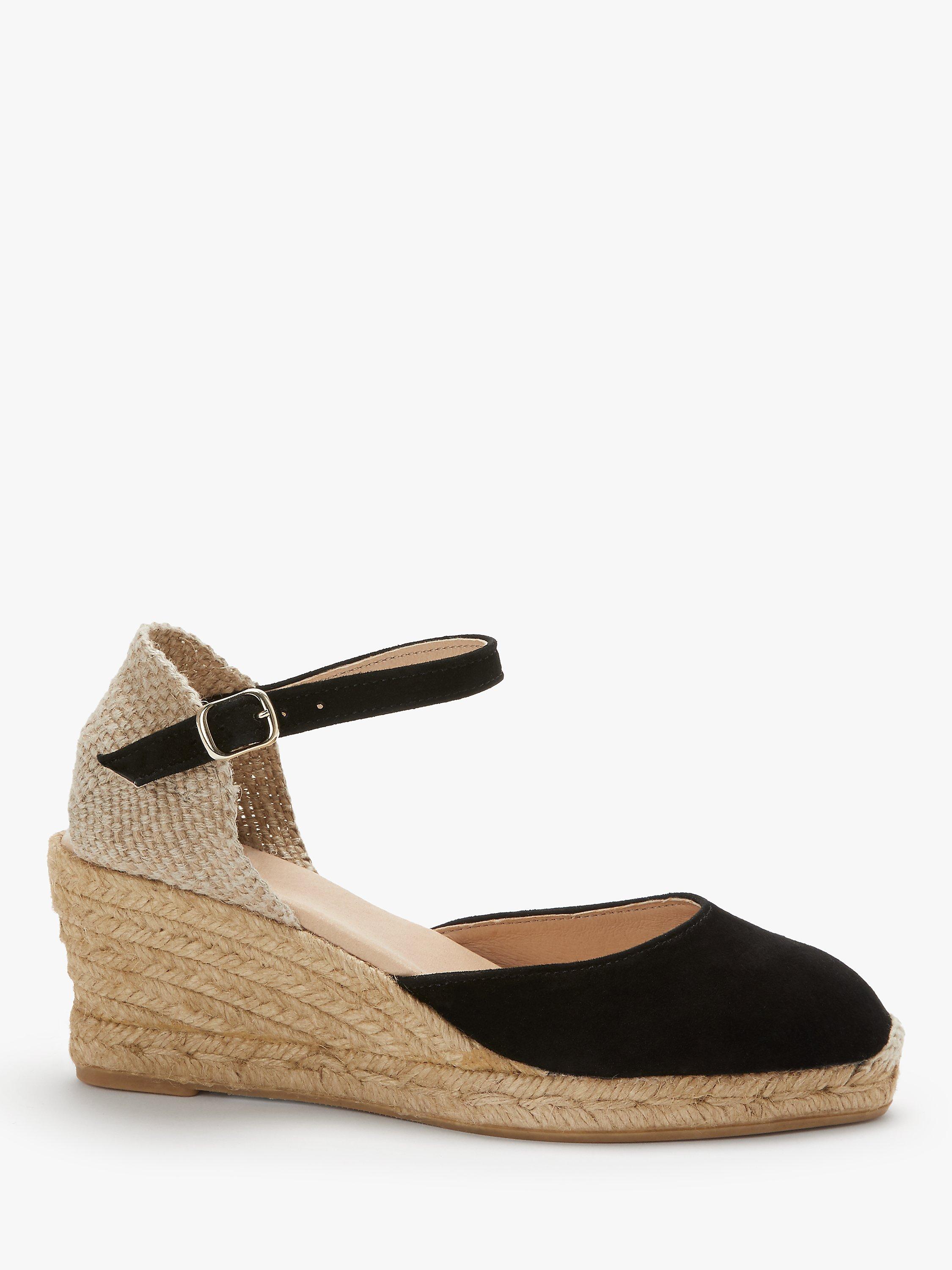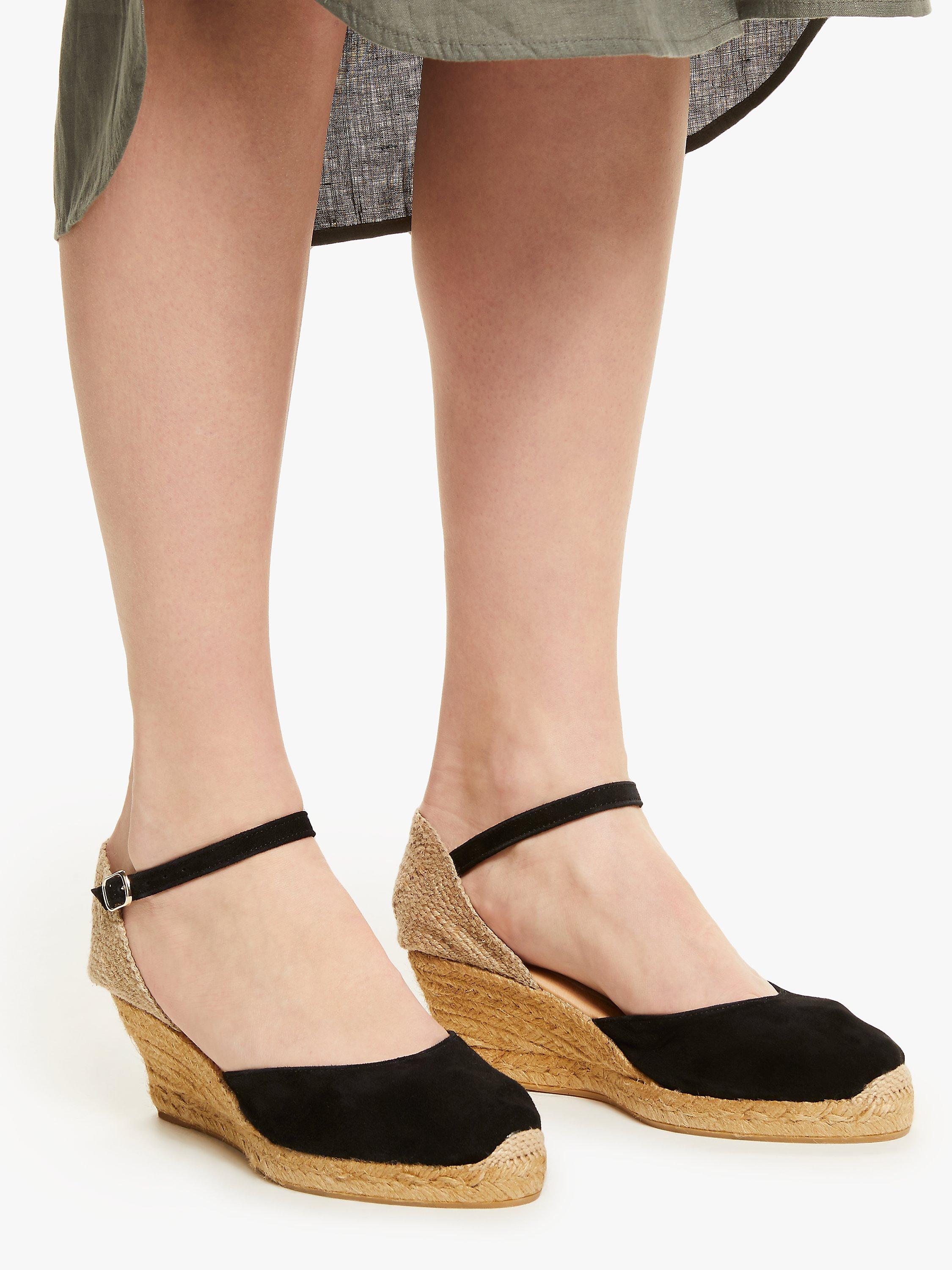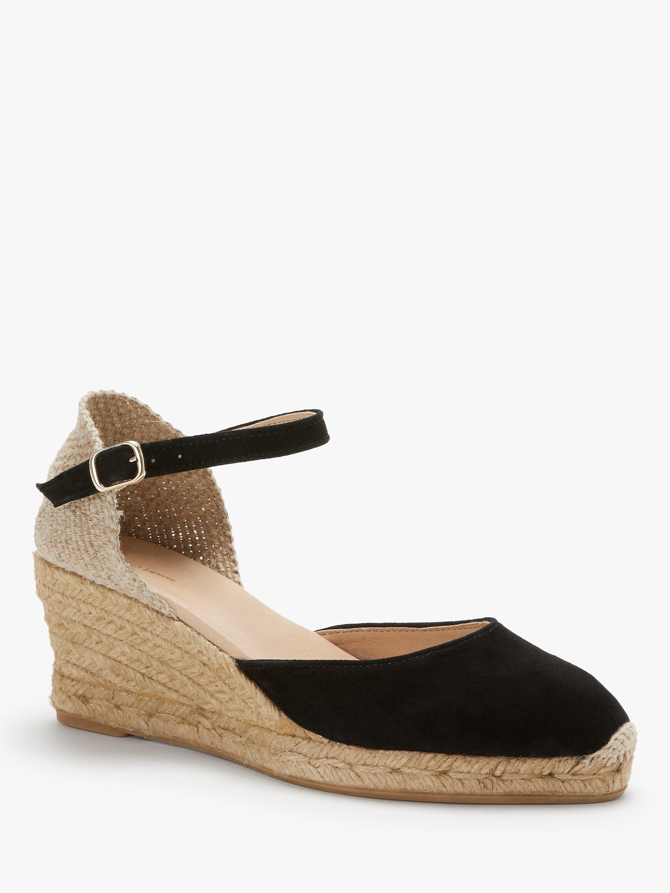 Made in Spain with a wedge sole and a closed toe, they're completed with an adjustable buckled ankle strap for a comfortable fit every time.