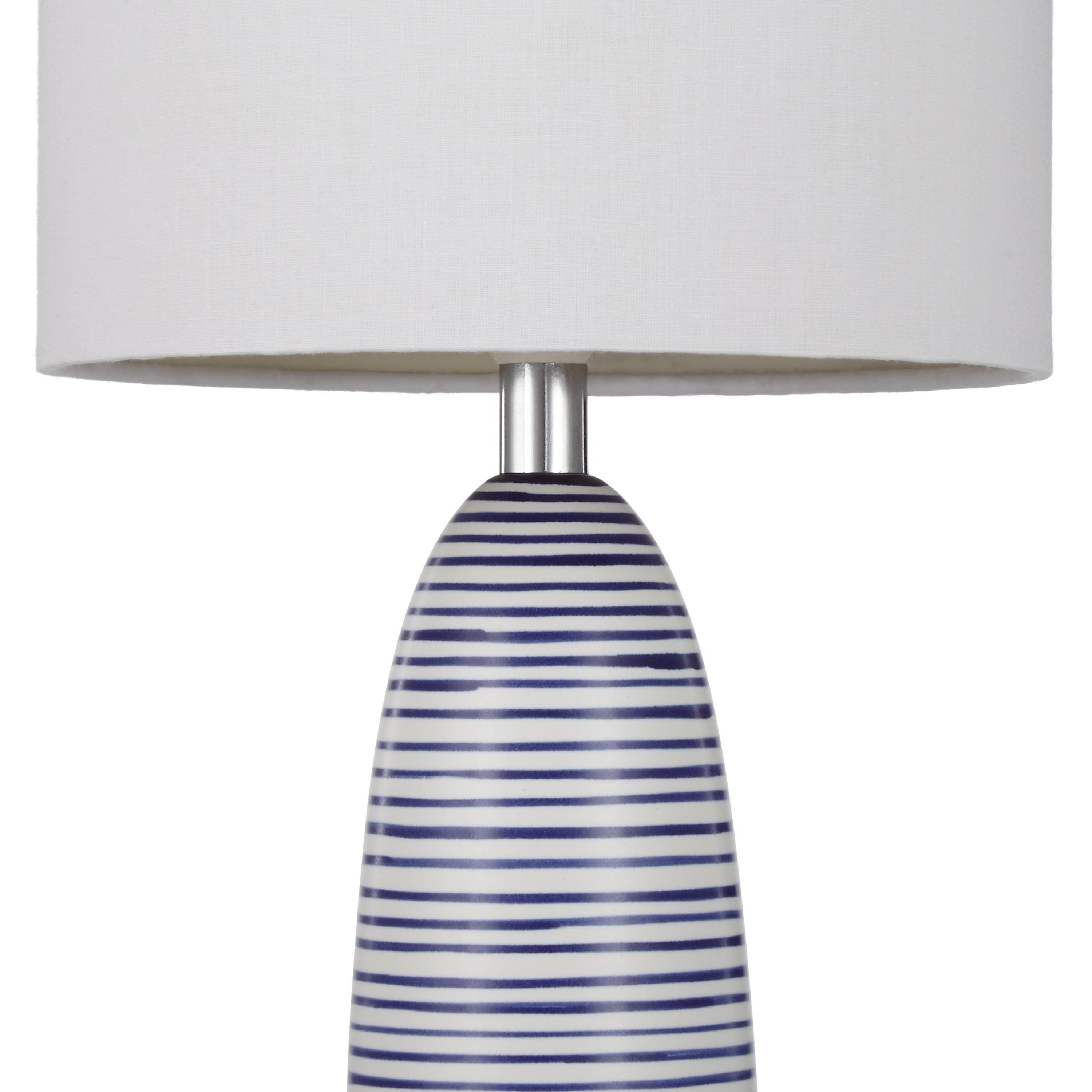 The ceramic base of this table lamp is hand-painted with stripes, so each one has a unique feel and fresh, coastal look. We've paired it with a fabric lampshade that enhances a warm glow of light, so you can set up the perfect ambience in your space.