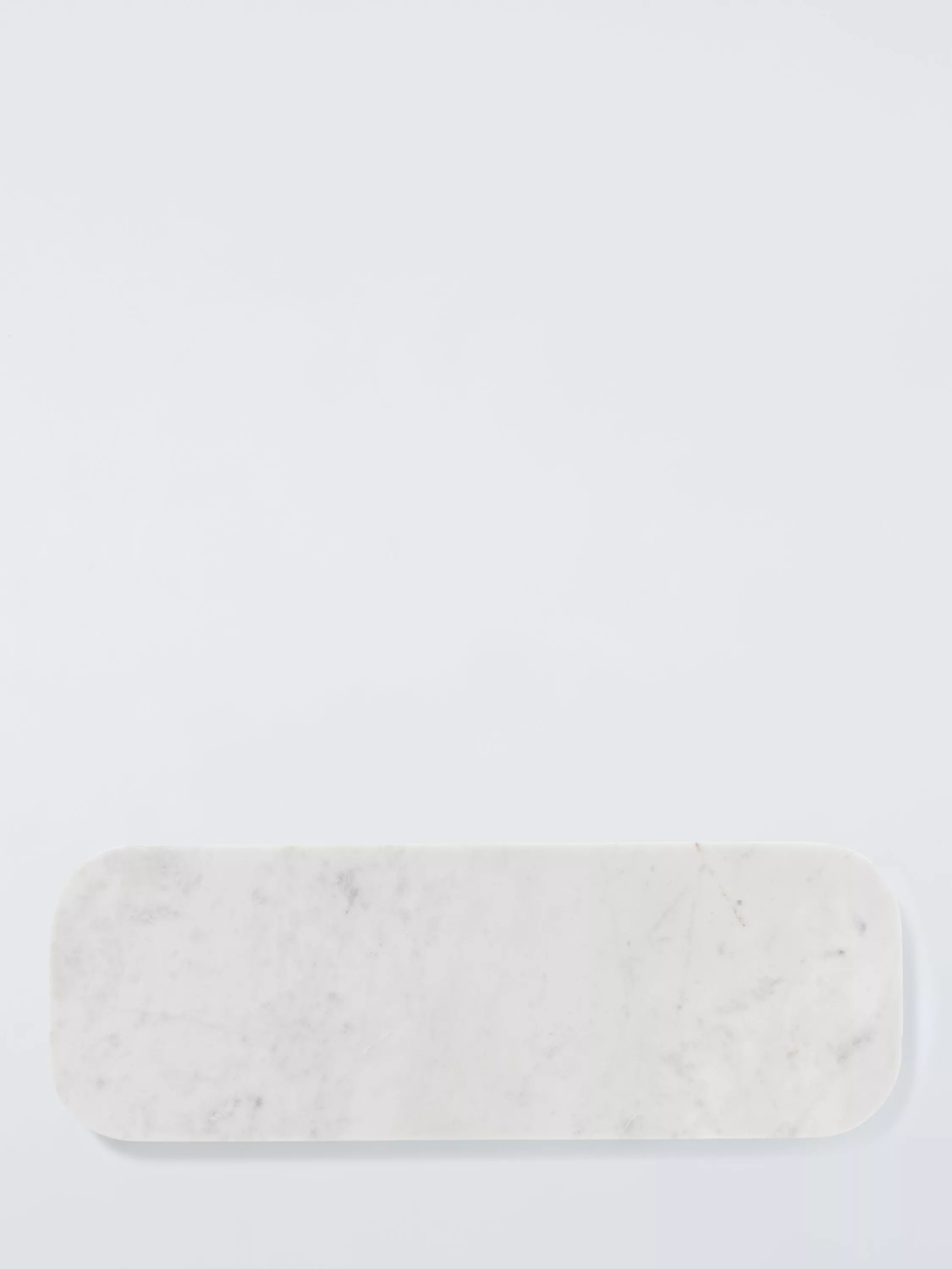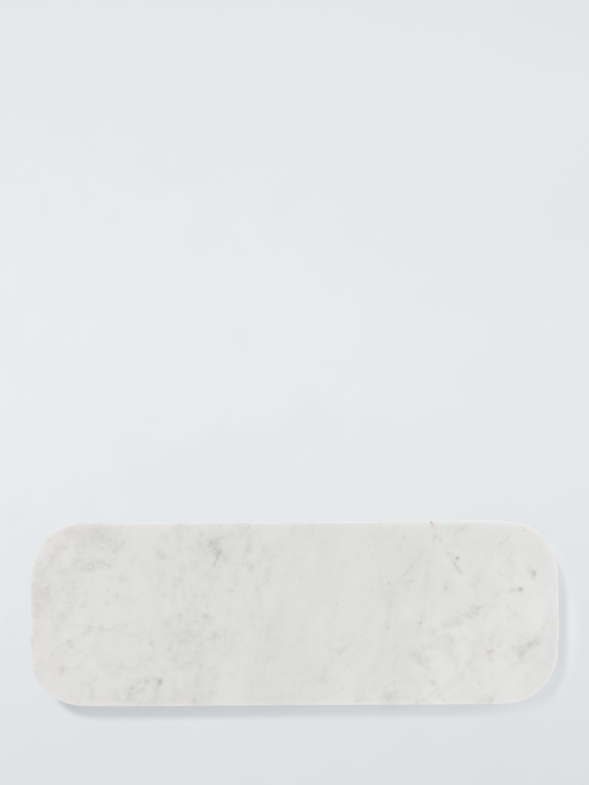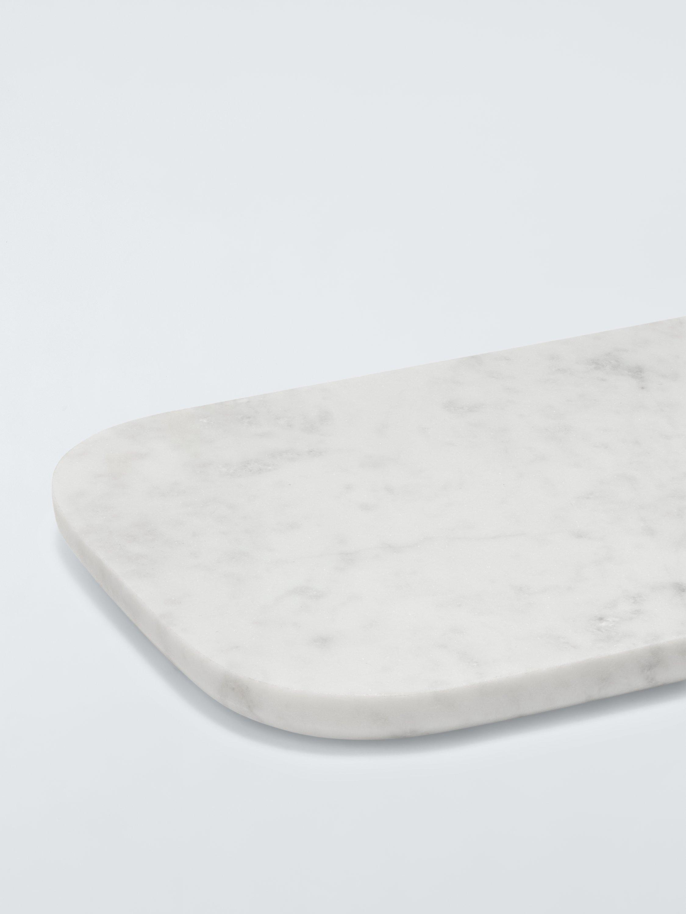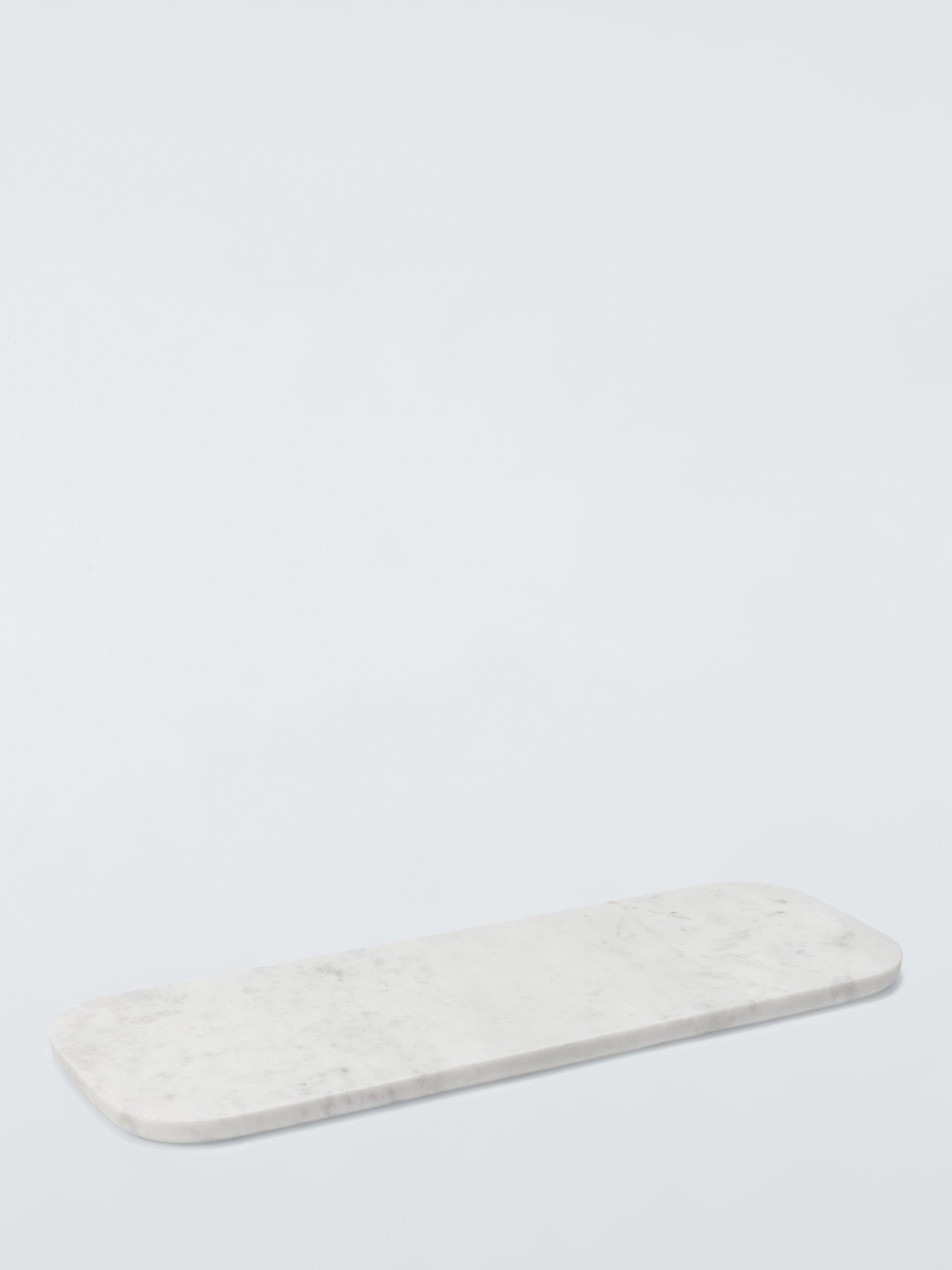 Handmade using traditional techniques, this long marble serving board has gently rounded edges for a softer look. The natural patterns and variations of the white marble make each one unique.