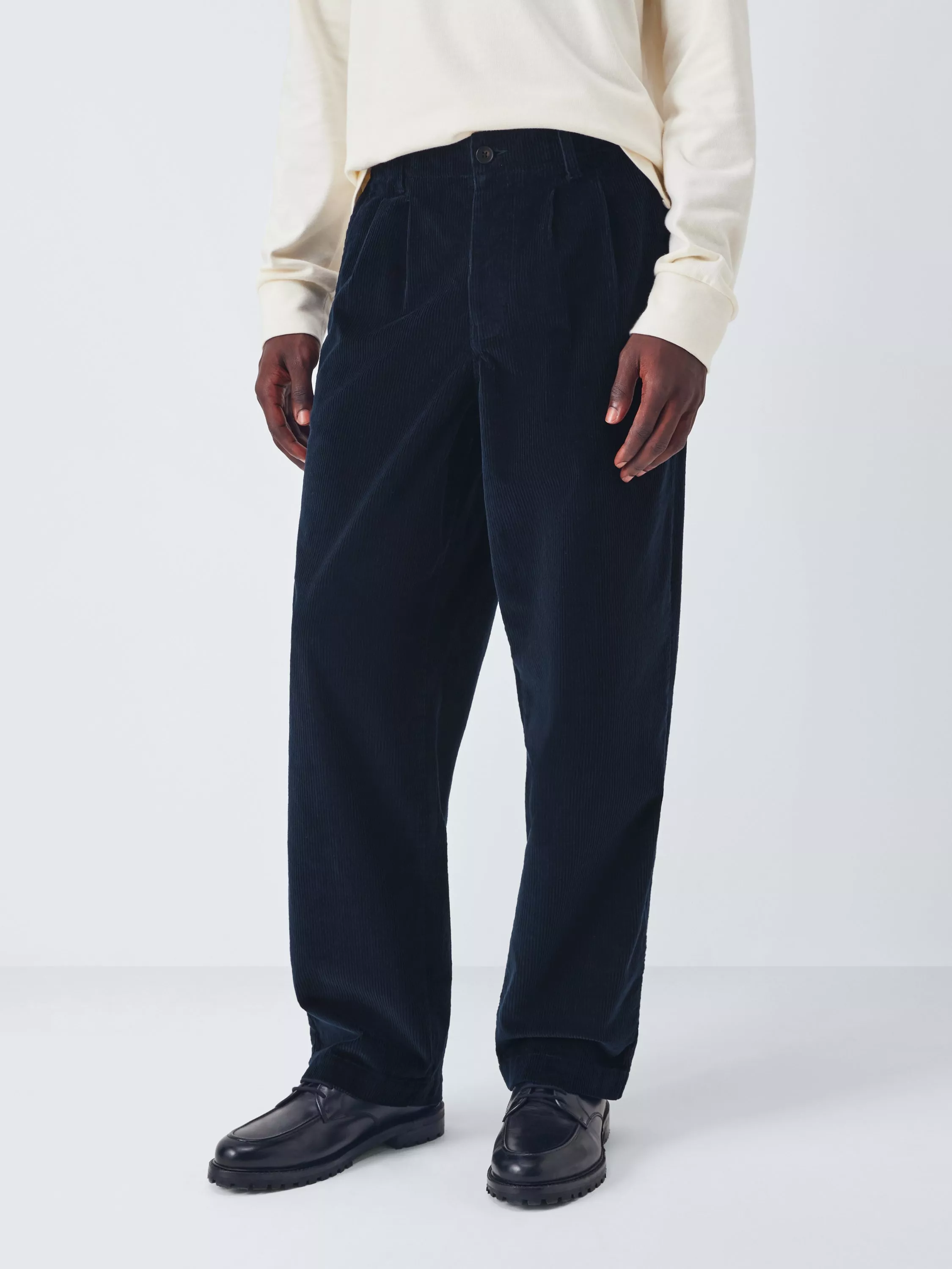 - A high rise, wide leg cord trouser, with double pleats at the front, button fly fastening, 2 side pockets, 2 jet back pockets and belt loops on waistband