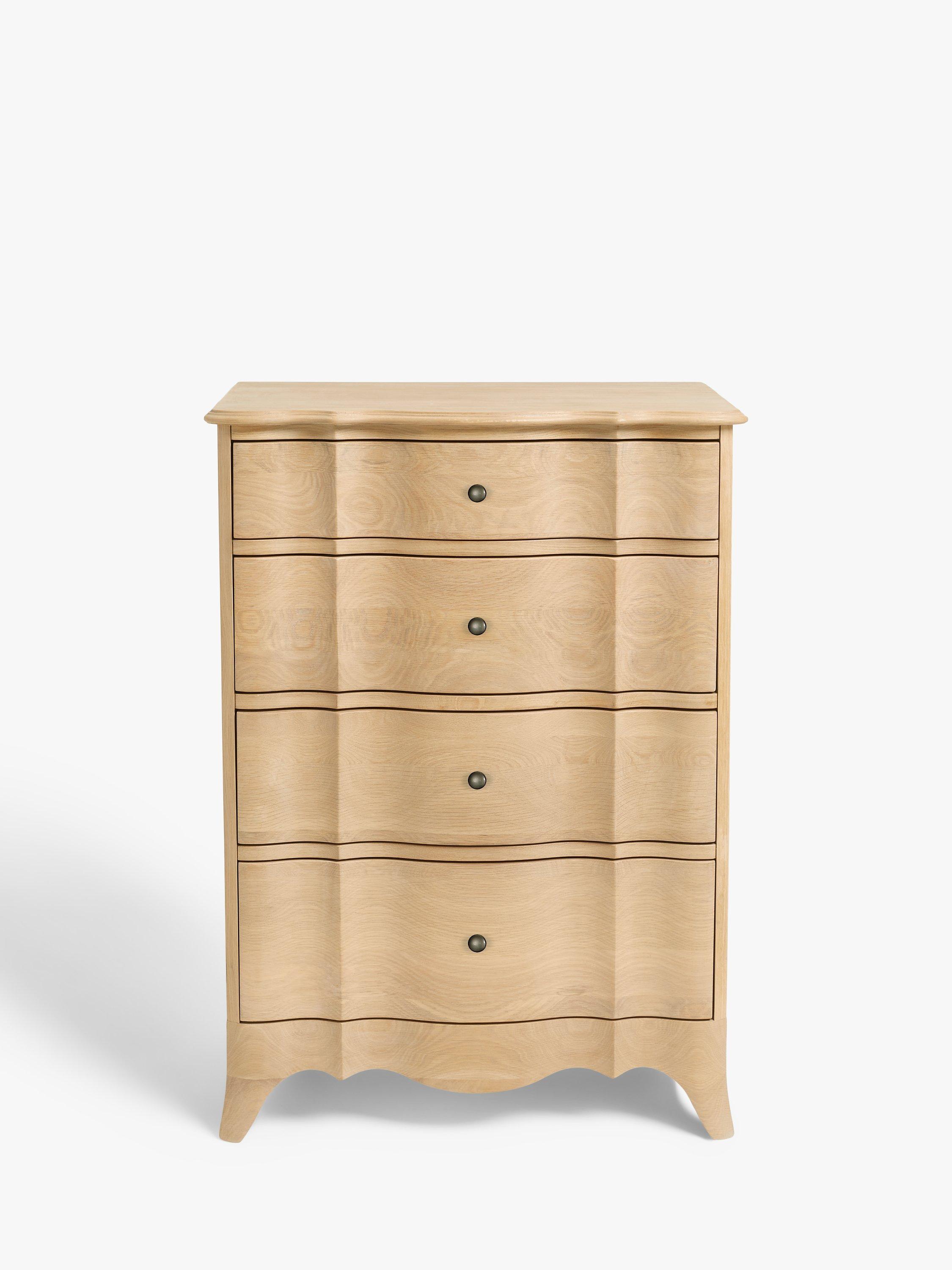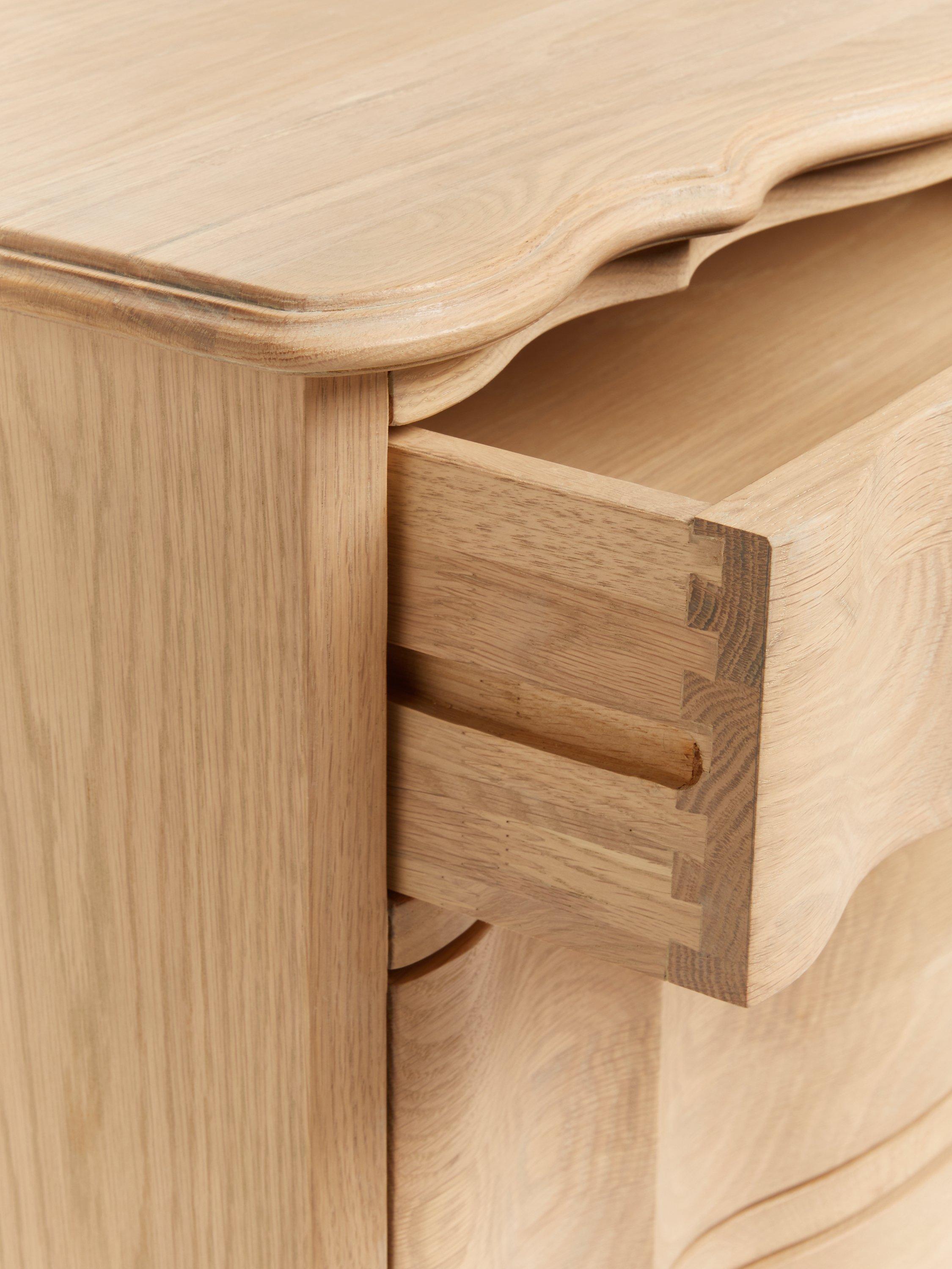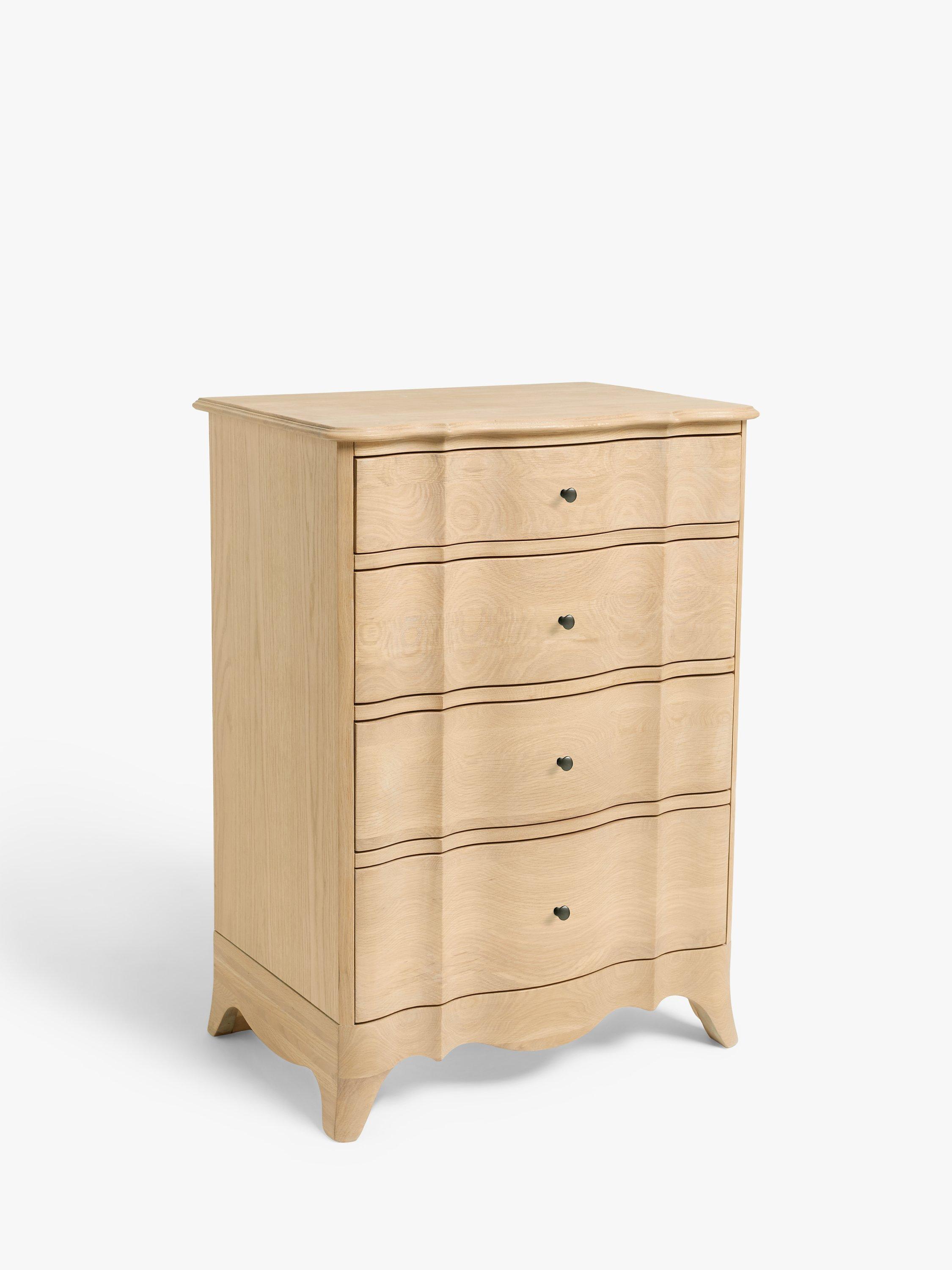 When nostalgic period designs become the inspiration for today's furniture, every detail counts. We've made this charming chest of drawers from white oak and finished it in a natural lacquer that highlights its unique grains and wood patterns. It's made using traditional joinery techniques, with turned legs and a decorative groove in the frame to honour its revival aesthetic. It's narrower in height than most chest of drawers which makes it a good choice for smaller bedrooms, and of course thanks to four drawers, storage won't be a problem.