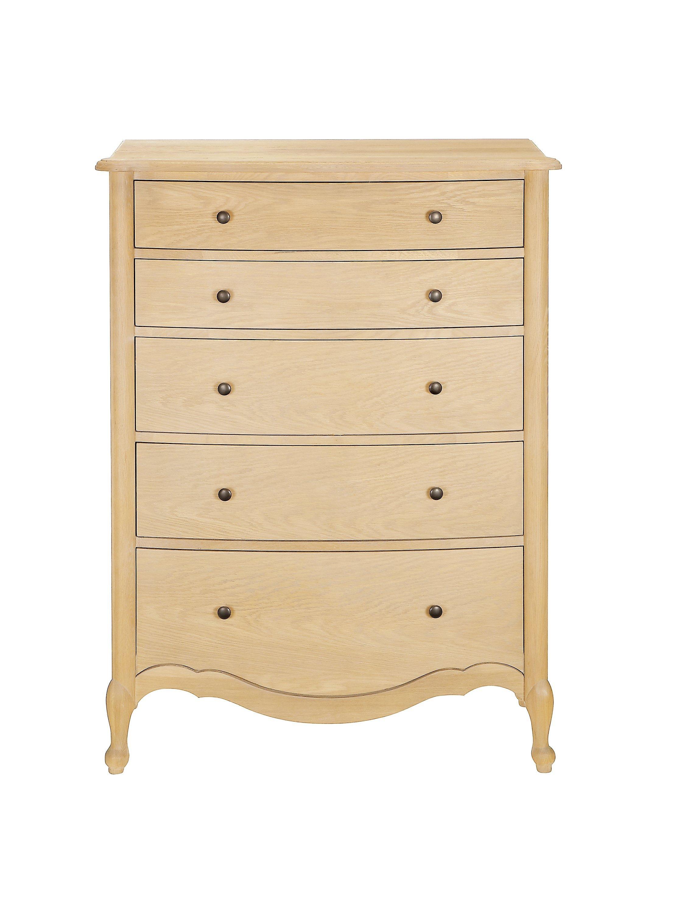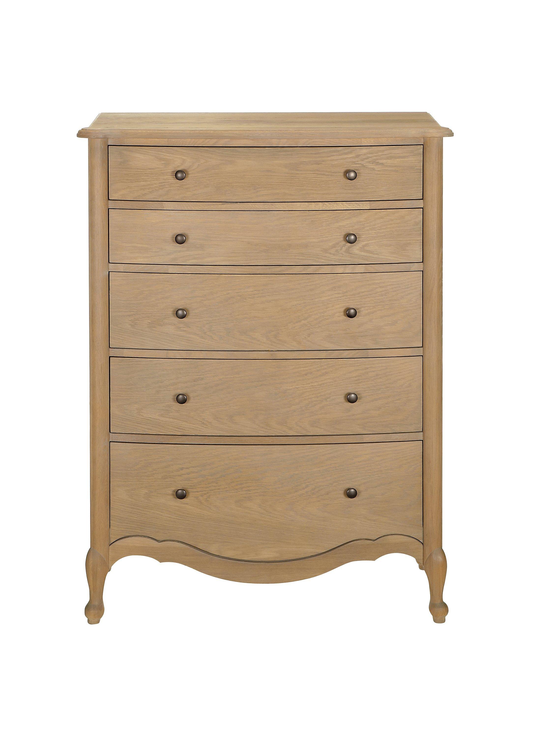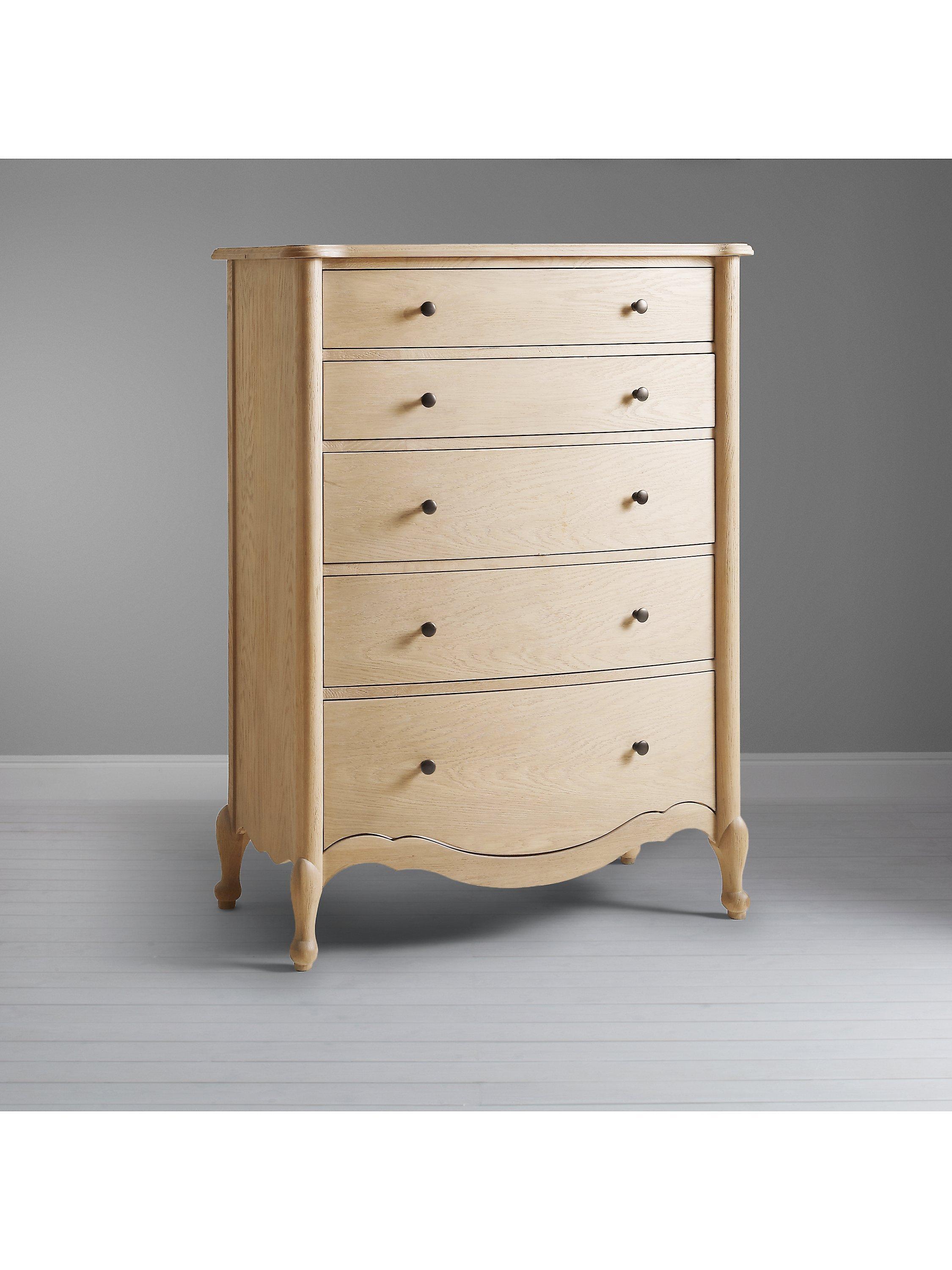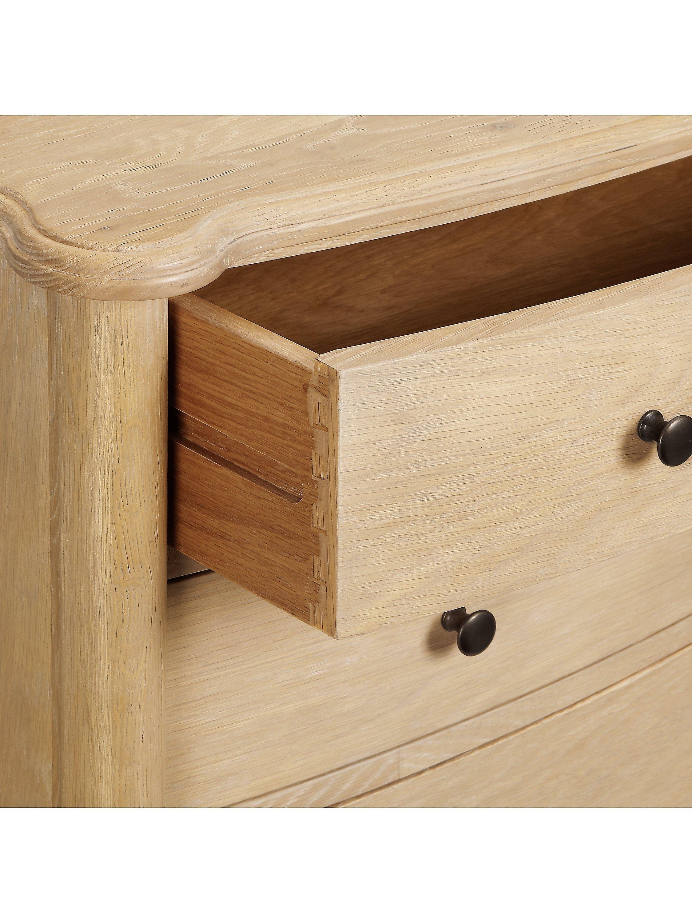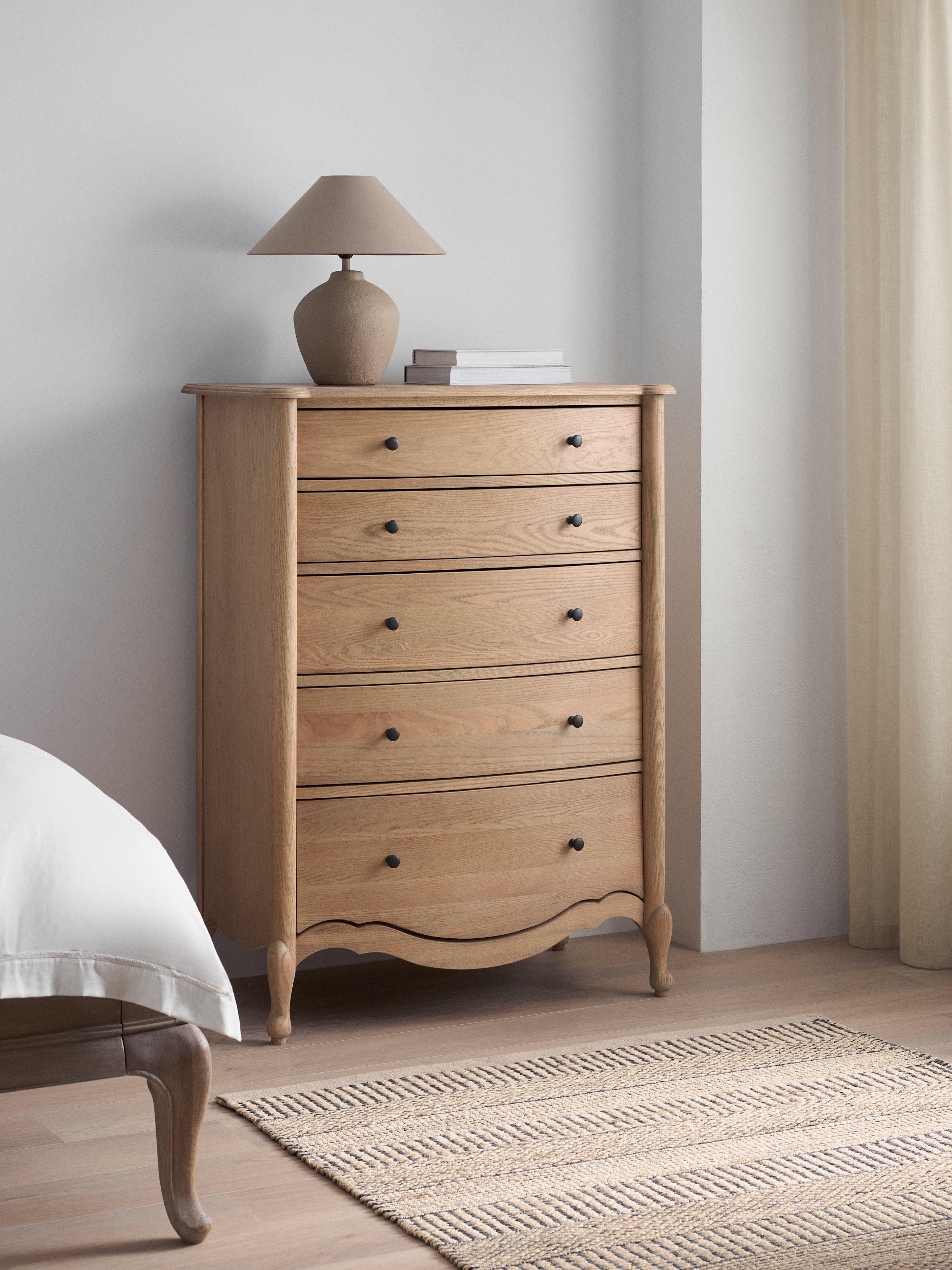 When nostalgic period designs become the inspiration for today's furniture, every detail counts. We've made this charming chest of drawers from white oak and finished it in a natural lacquer that highlights its unique grains and wood patterns. It's made using traditional joinery techniques, with turned legs and a decorative groove in the frame to honour its revival aesthetic. It's taller in height than most chest of drawers which makes it a good choice in bedrooms with limited space and of course thanks to five drawers which gradually increase in depth, storage won't be a problem.