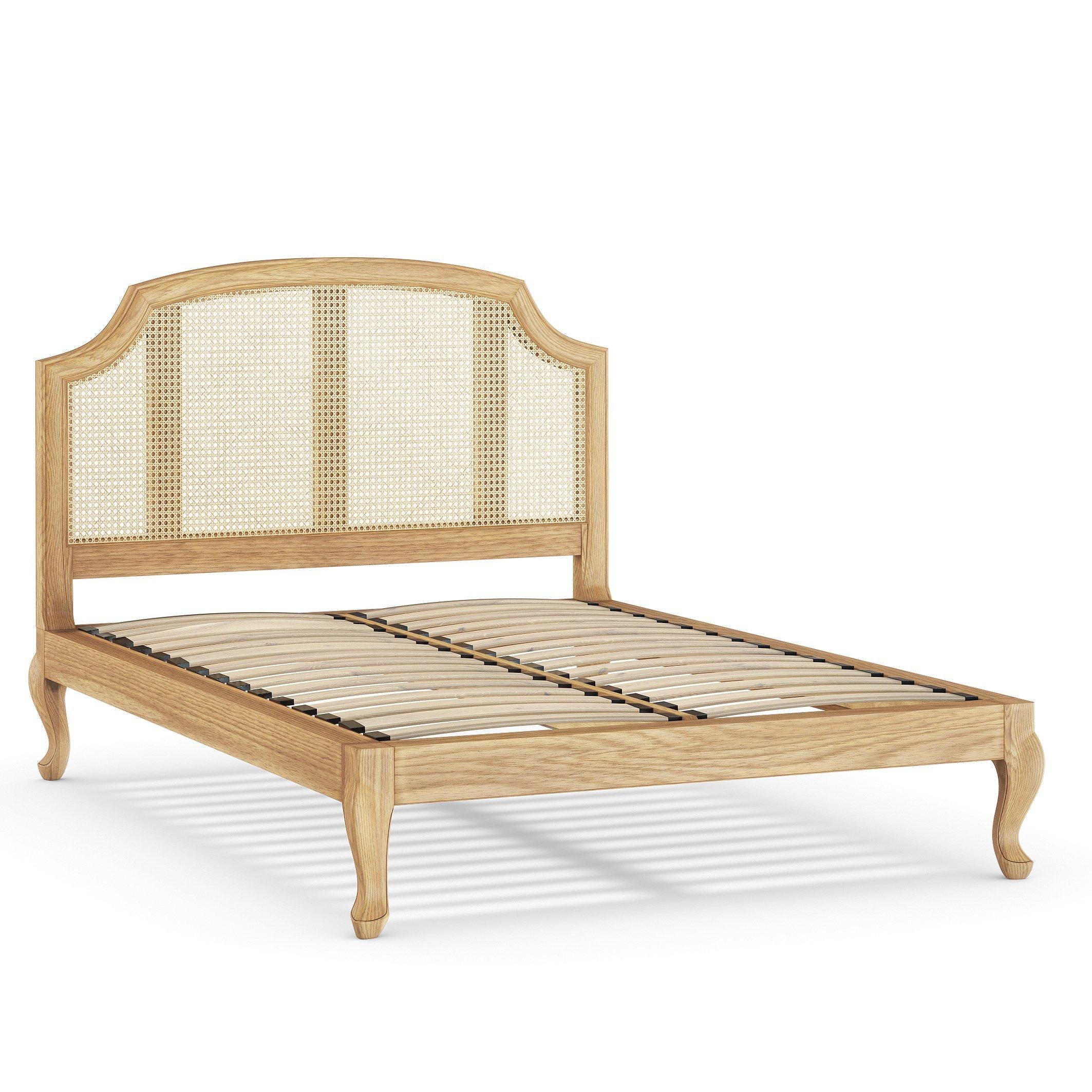 Solid oak, woven rattan, timeless design. This bed frame honours the retro revival in all the right ways. It's finished in a natural lacquer that highlights the authentic pattern and grains of the wood and the shapely rattan headboard gives it a fresh and more modern finish. Complete with supportive sprung slats in the base, dress this bed with a quality mattress and irresistible bed linens and it will be so hard to resist.