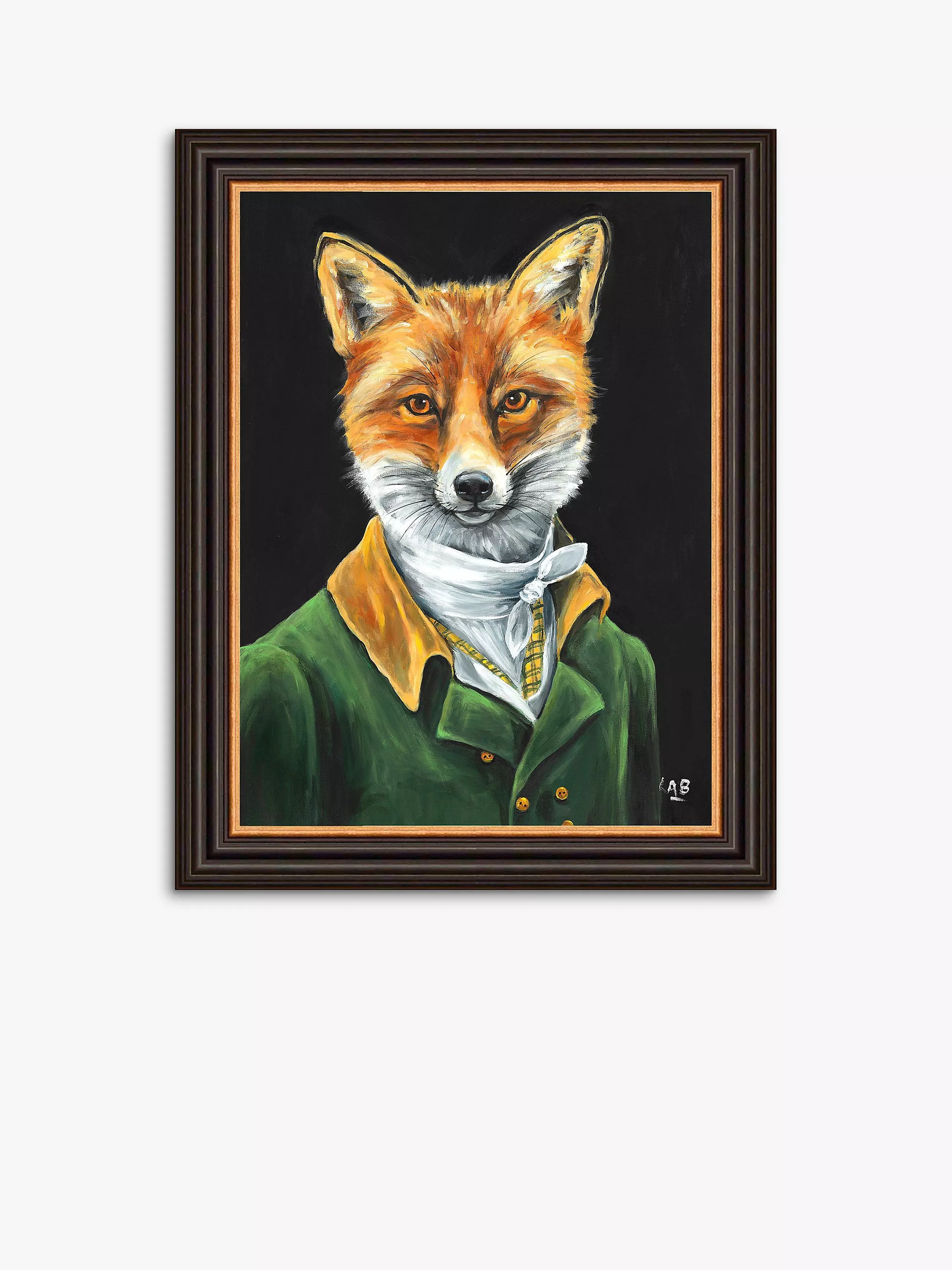 A dapper fox dressed to the nines, by artist Louise Brown. This print is unglazed with an artist's acrylic gel texture applied by hand. It has a classic black and gold-toned frame, ready to hang on your wall.