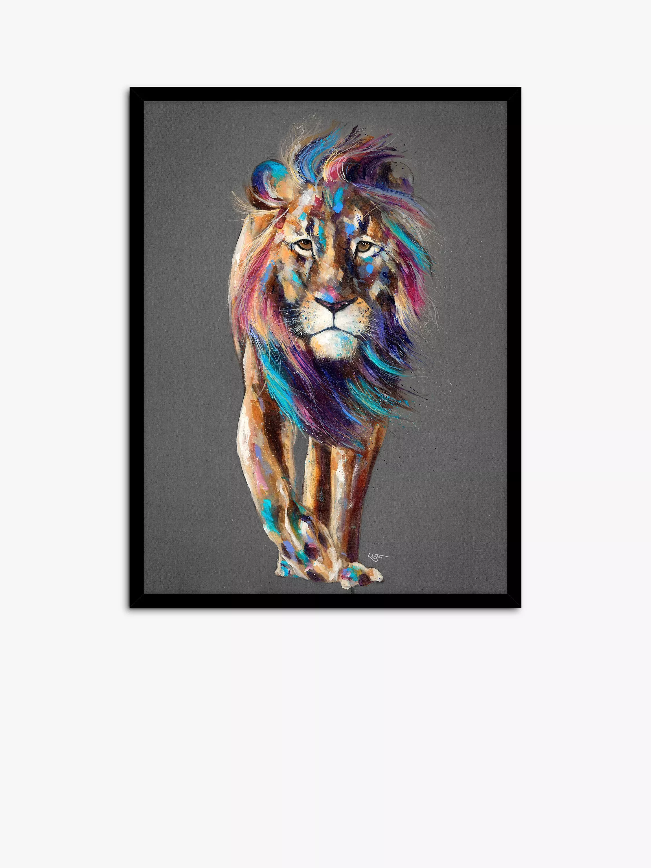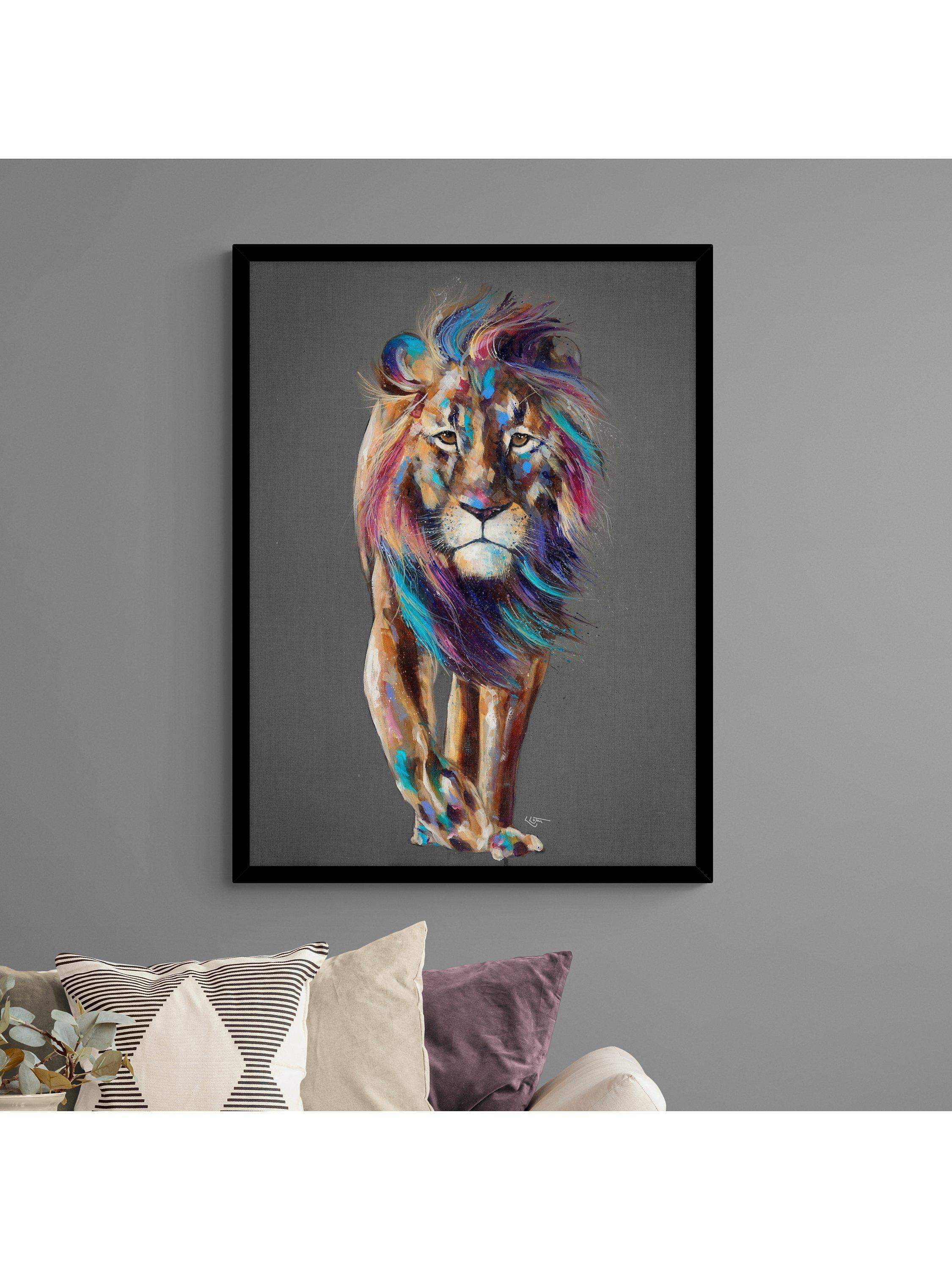 'Pride' by artist Louise Luton is a contemporary take on a majestic lion using bold colours. This unglazed print is presented in a frame, ready to hang on your wall.