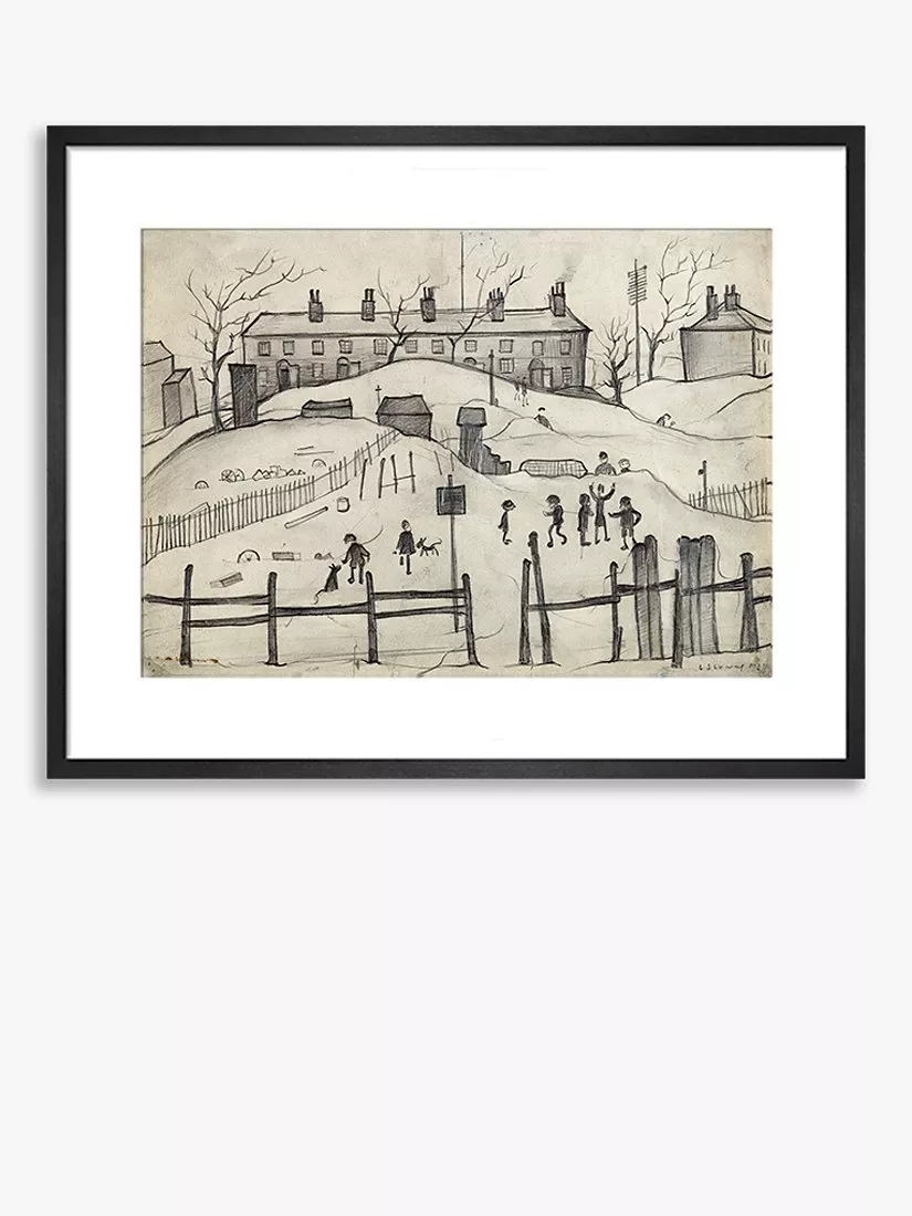 A reproduction of Lowry's 1937 work 'Houses in Broughton'. This archival giclee print has a cotton core mount in a handmade and hand-finished solid ash wood frame.