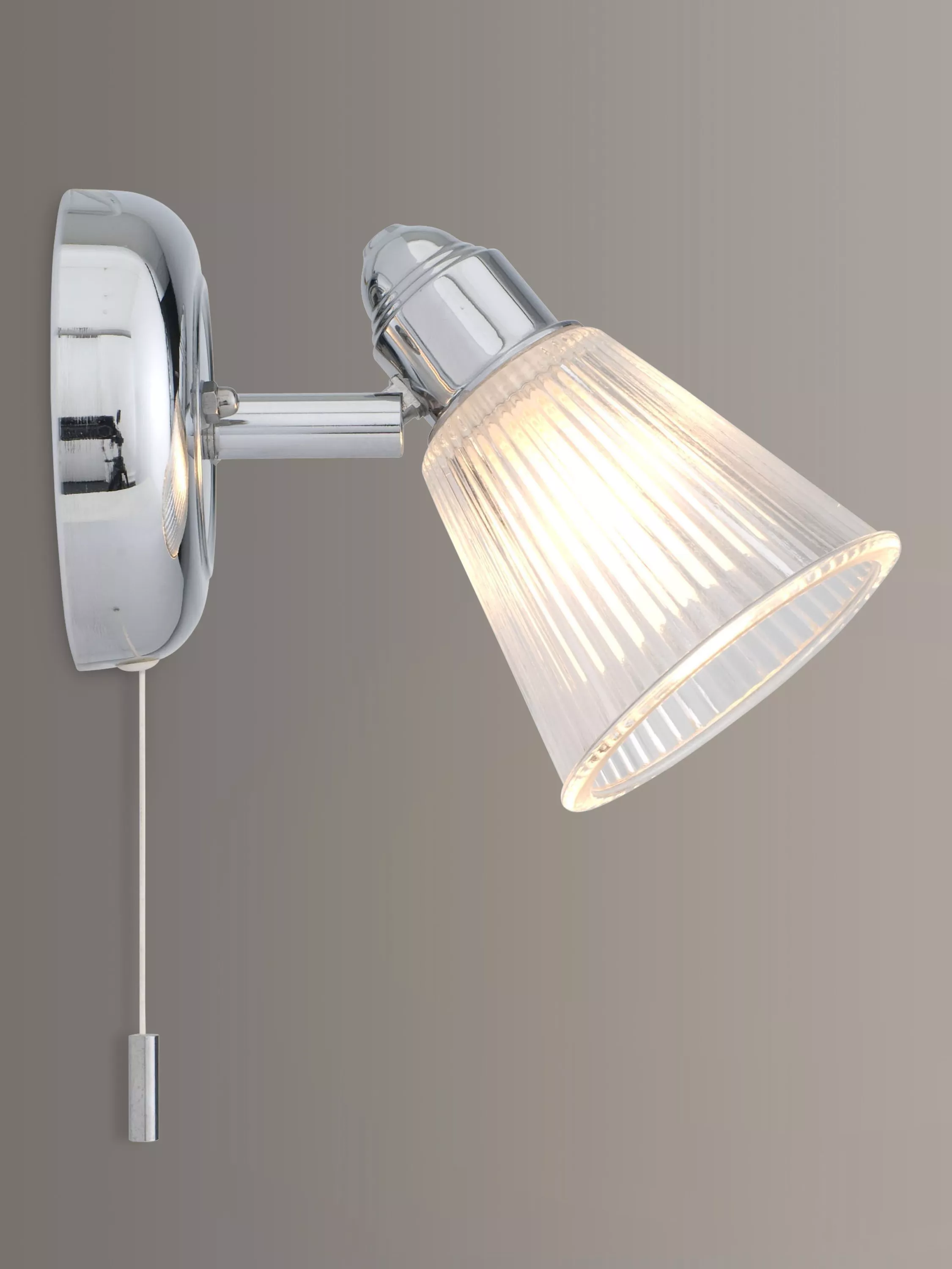 This bathroom wall light has a ribbed glass shade and chrome finish. IP44. Suitable for use in bathroom zone 1, kitchens and other rooms aound the house.