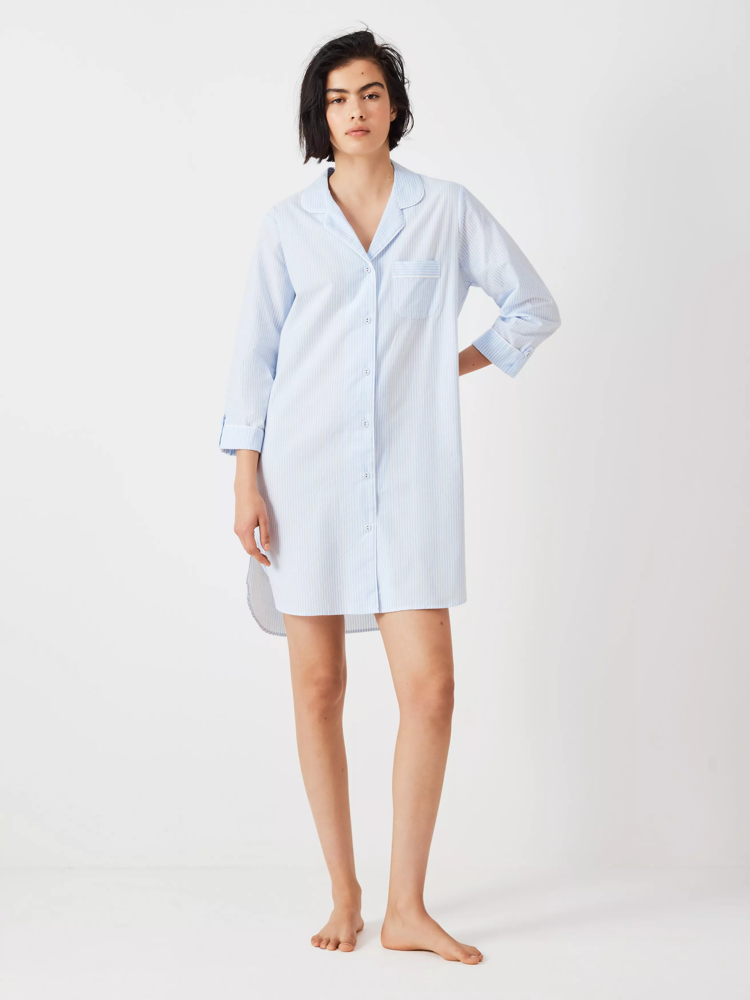 Our yarn dyed woven stripe nightshirt is made from pure cotton with a soft, comfortable feel. We've elevated the shape with a curved, split hem for a relaxed fit and added piping along the placket for a premium touch. An easy sleep shirt to slip on, we've included fold-up sleeves which you can adjust and fasten to your comfort.