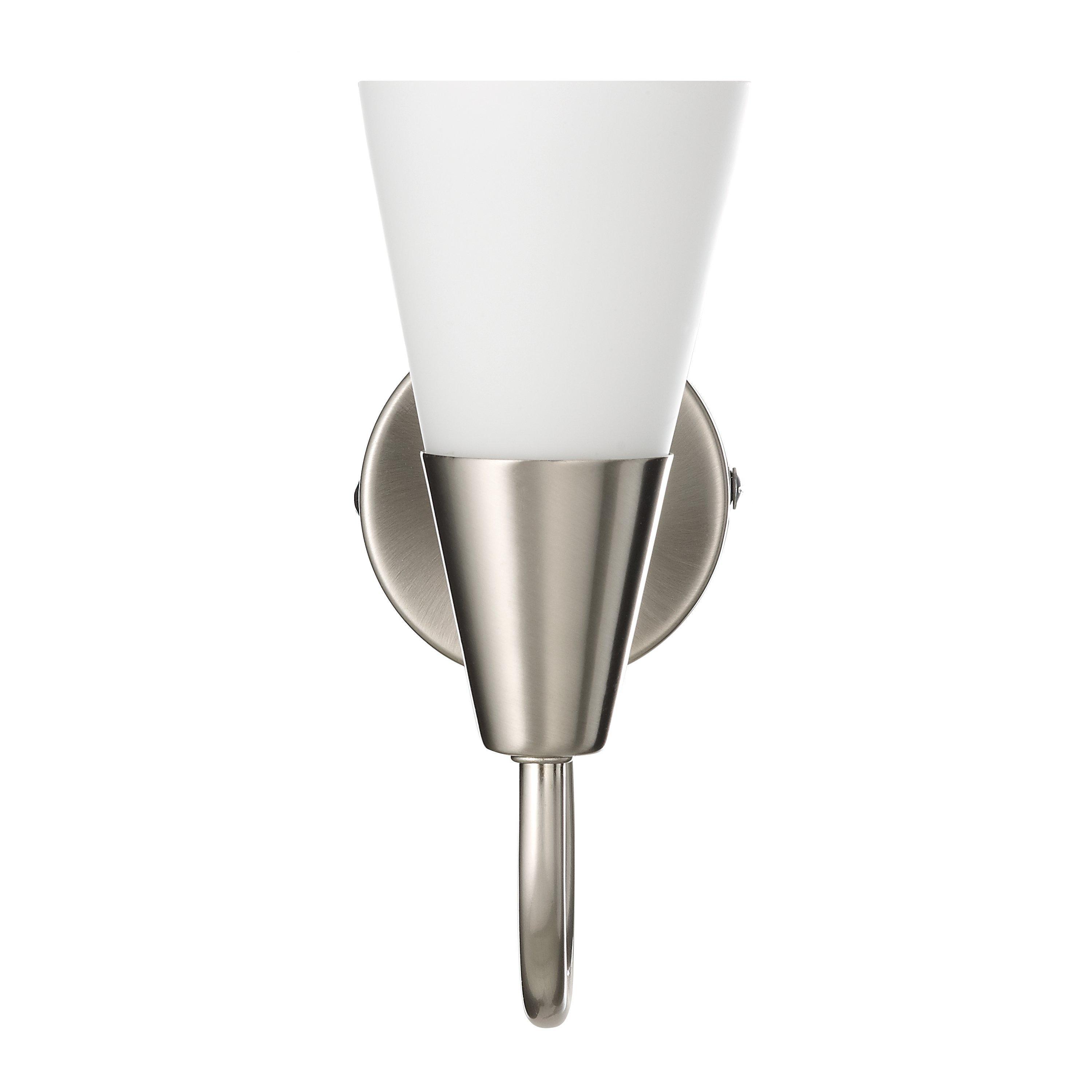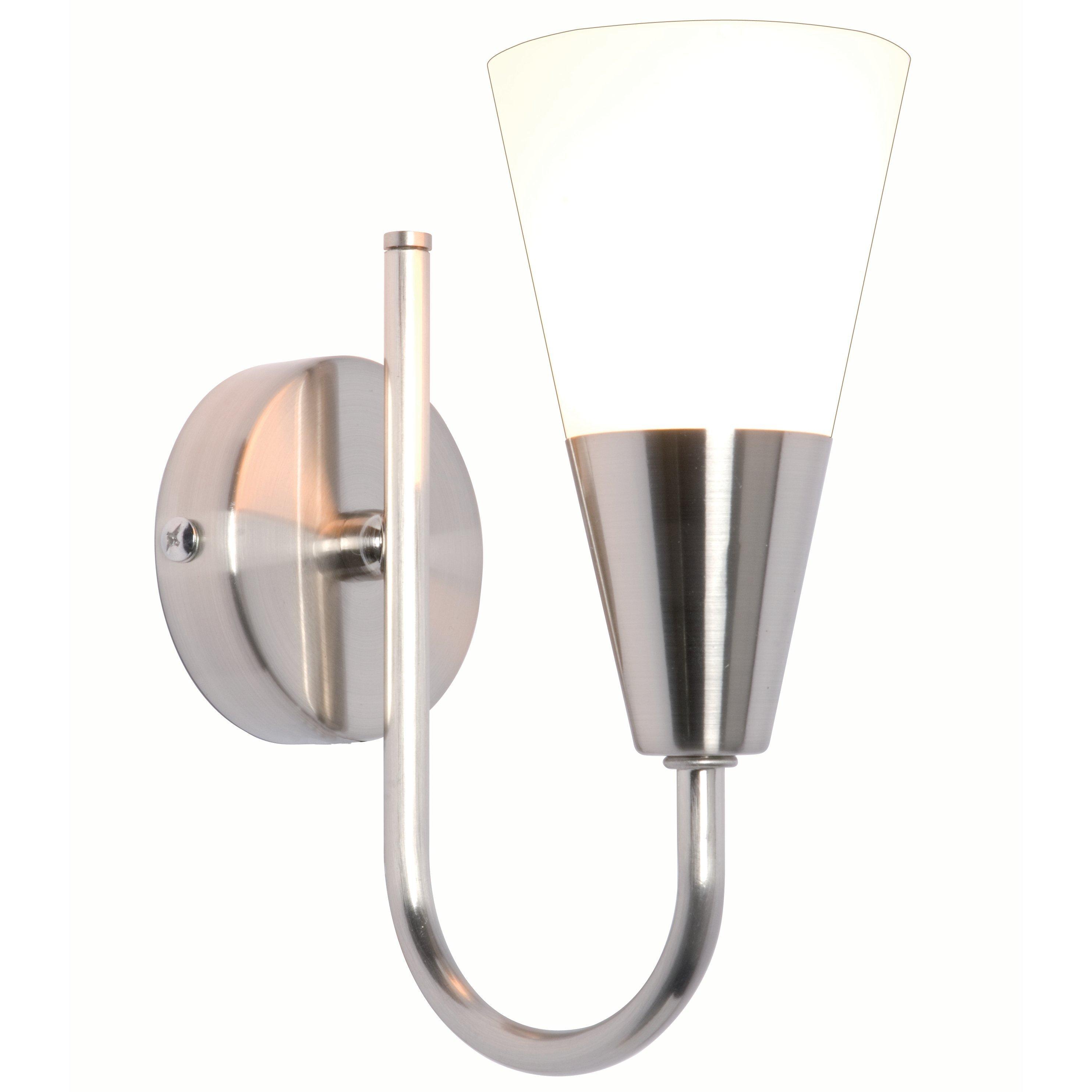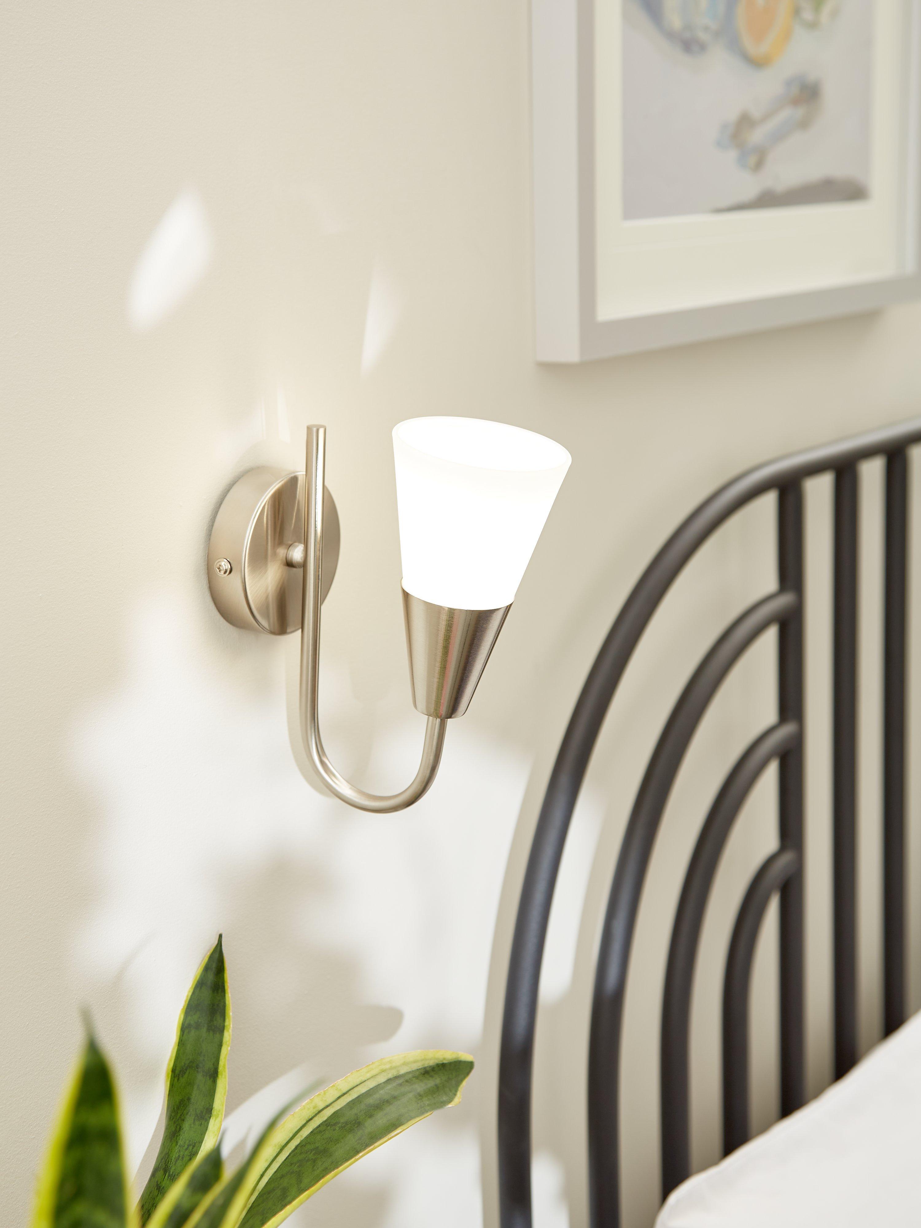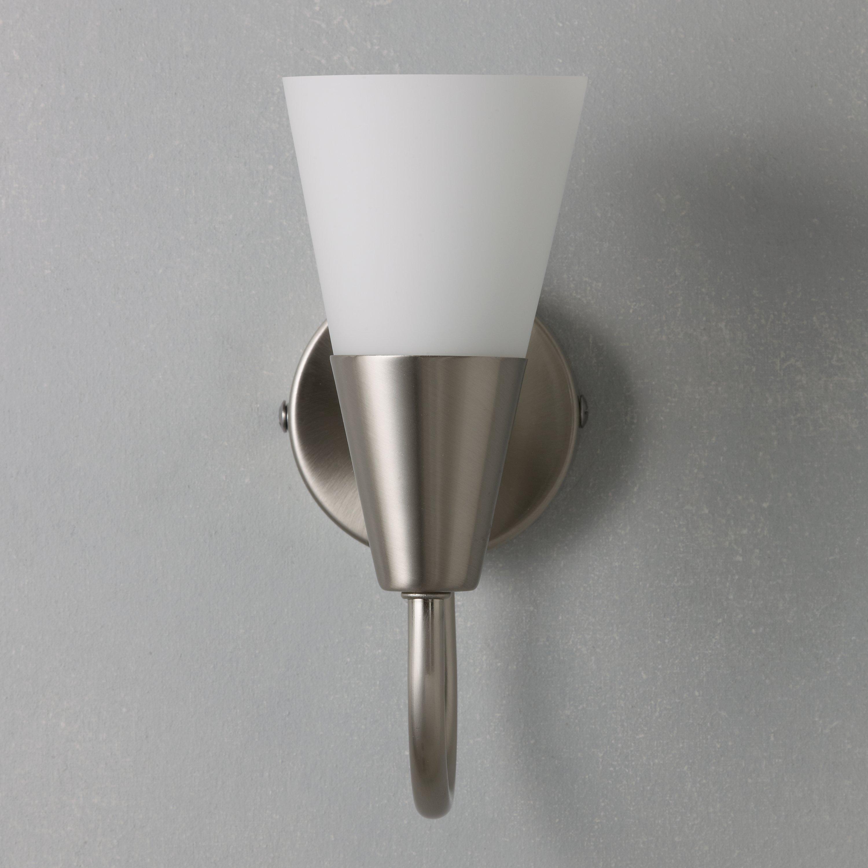 This excellent value, single-arm wall light is made with a frosted glass, cone-shaped shade, creating a warm wash of light. Available in a choice of finishes.