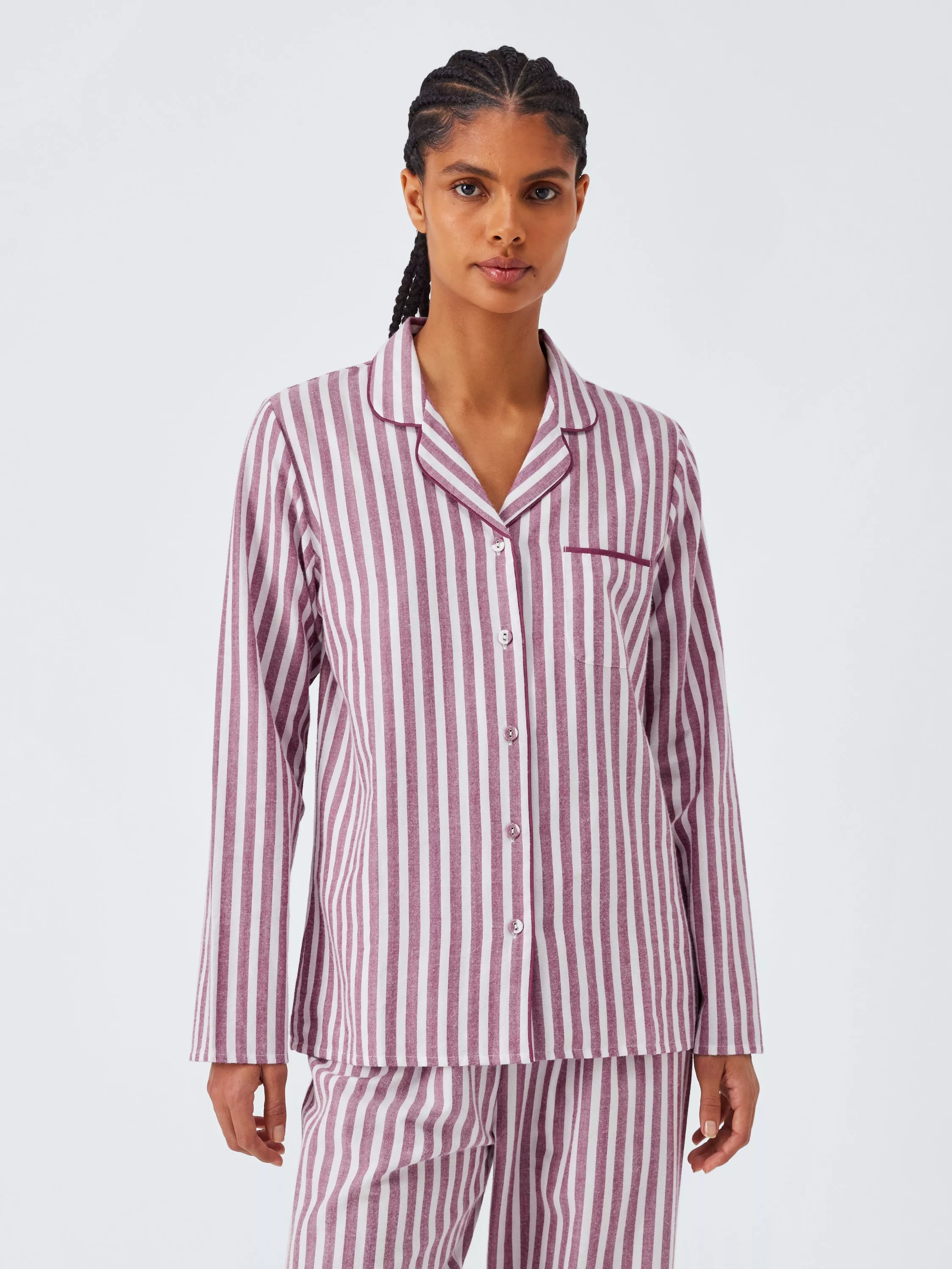 A pure cotton pyjama set in a classic, block stripe. The shirt has a revere collar and fabric-covered buttons, whilst the bottoms have an elasticated waistband.