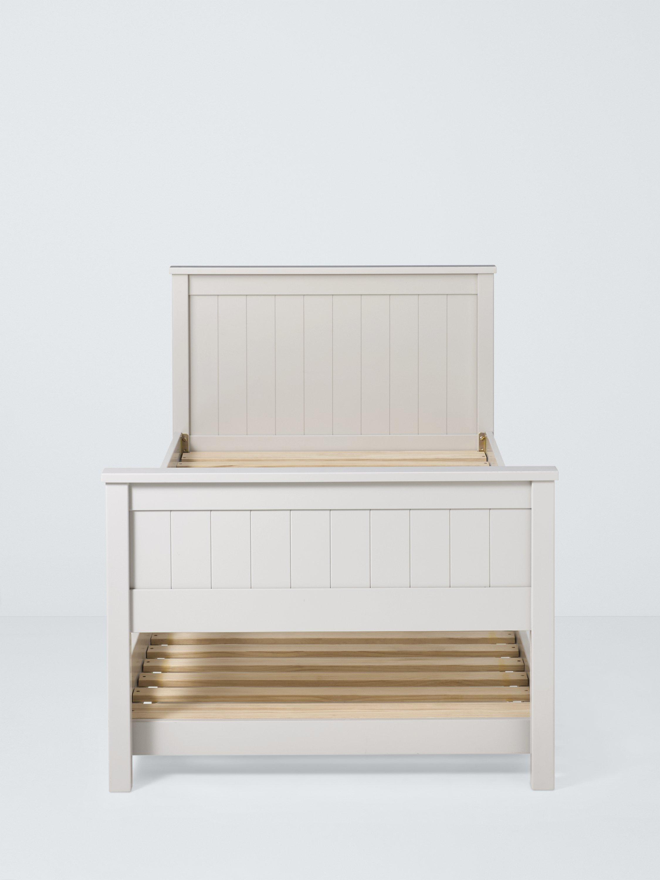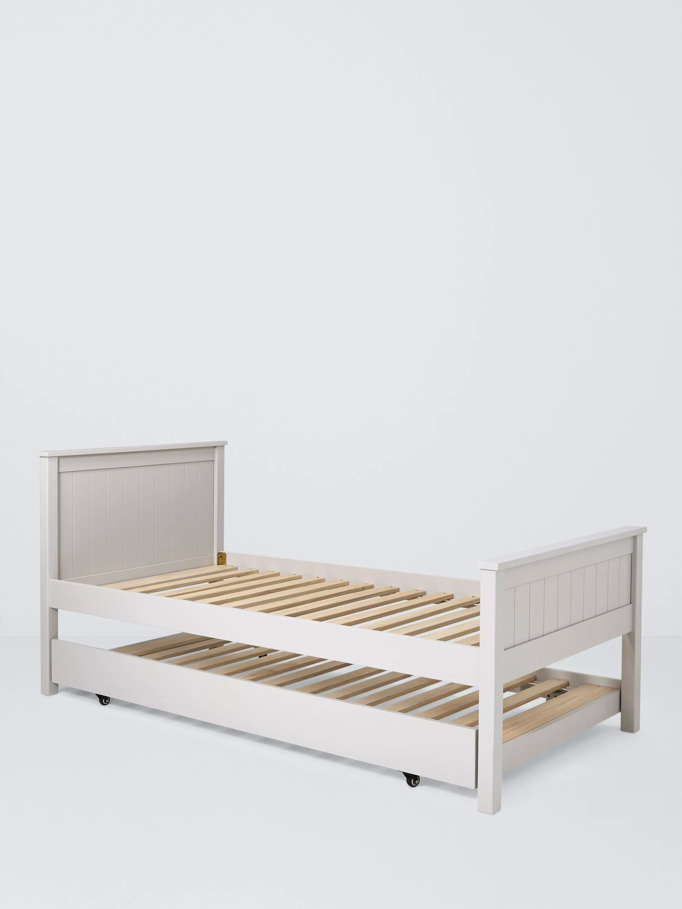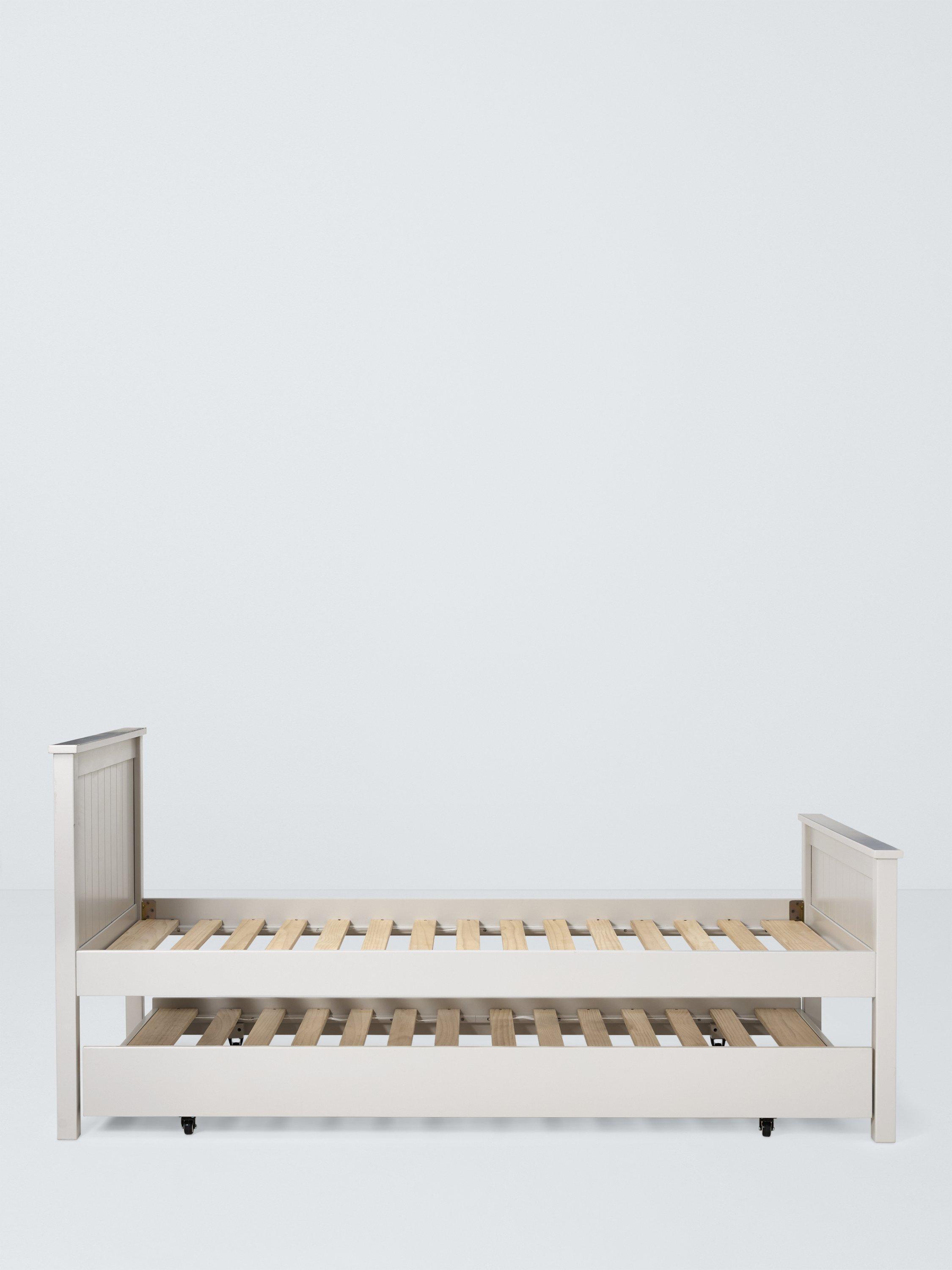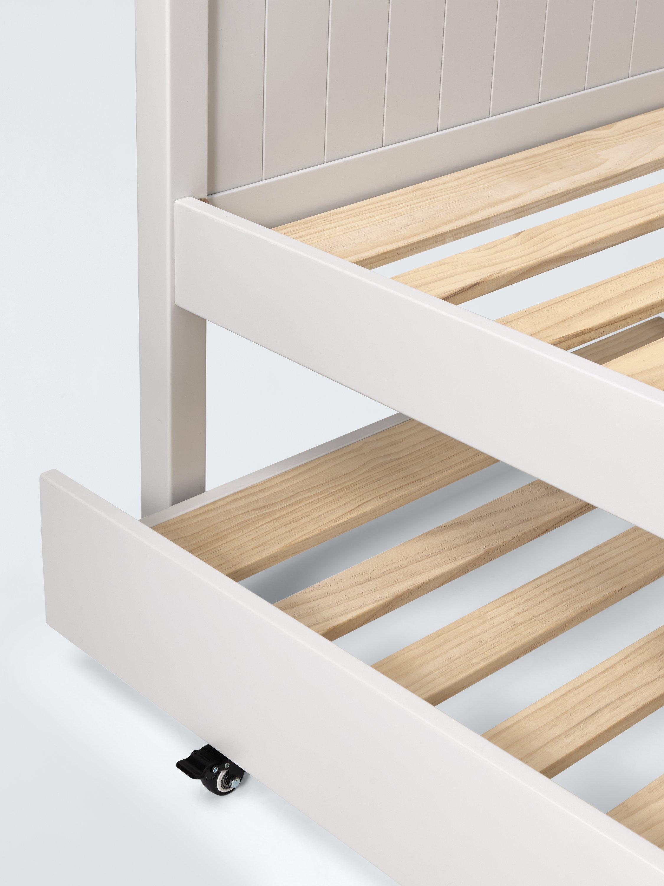 We've designed our Lyra bed frame with a trundle drawer for easy-access storage. Made from hard-wearing pine wood and with solid slats, the bed base provides a firm foundation for your mattress. With its smart panel detailing on the headboard and footend, it has a classic and enduring style.
