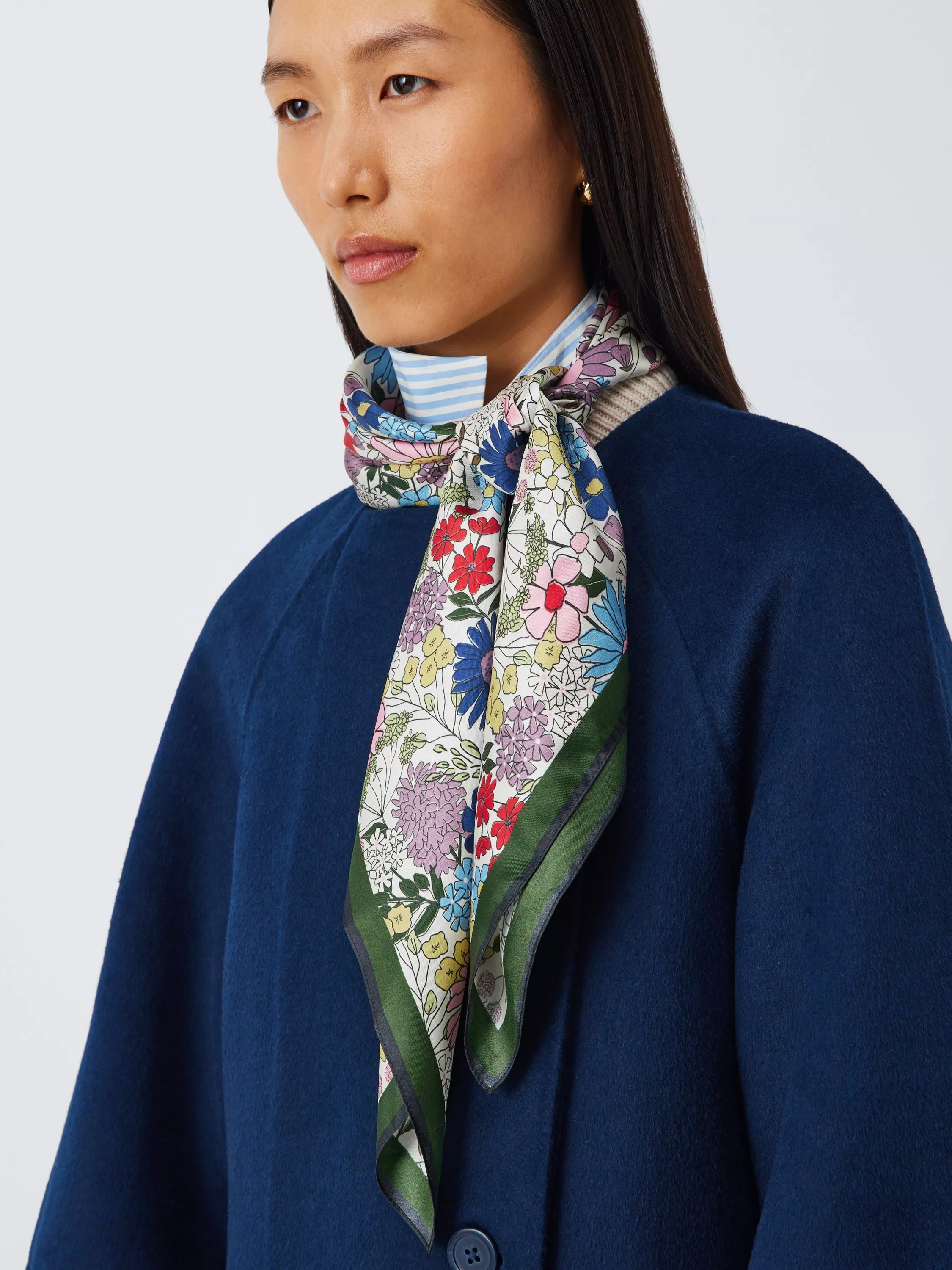 Finish your look or give the perfect gift with a pure silk scarf. A square, floral design with a solid border.
