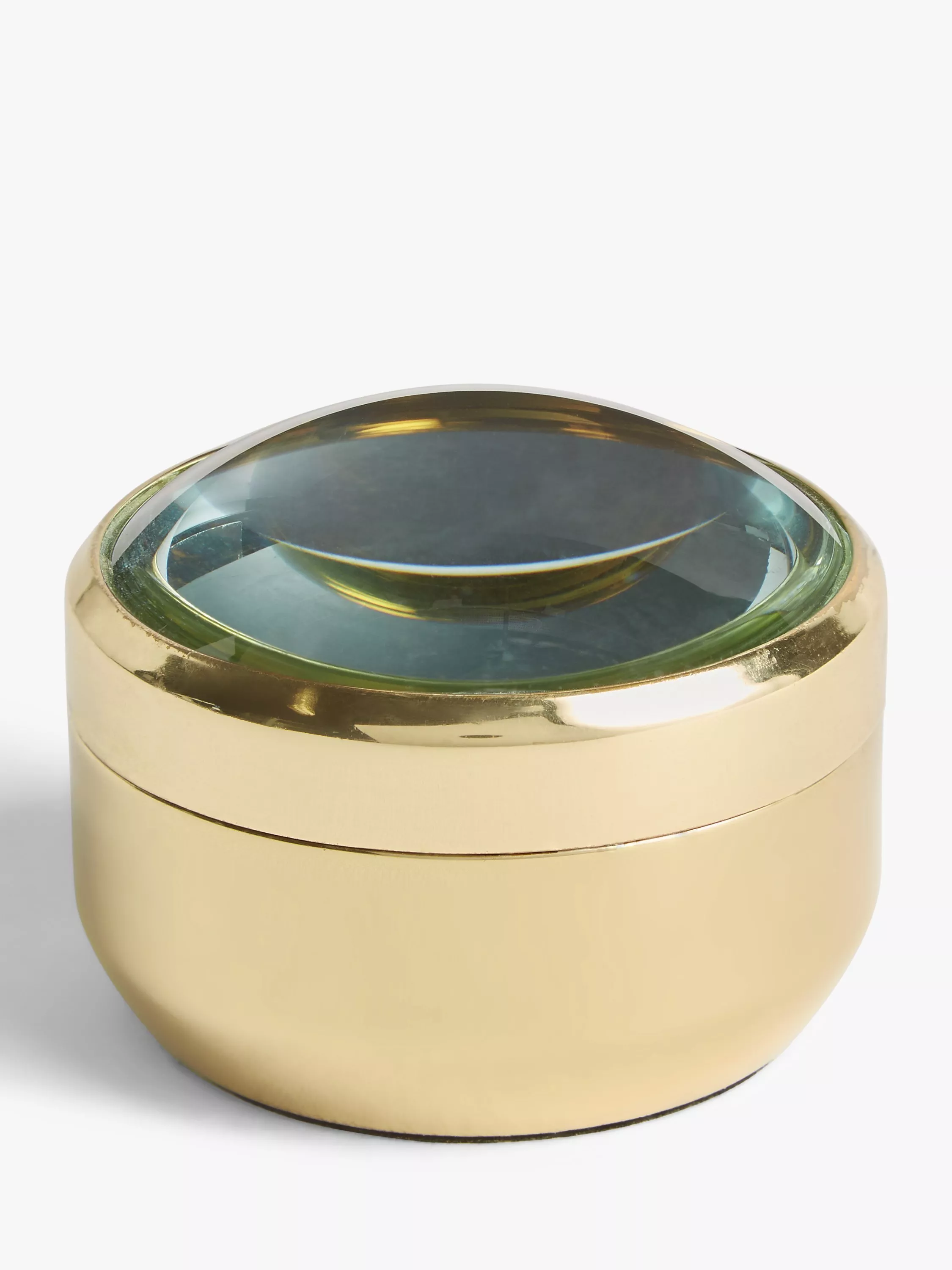 In gorgeous gold-toned brass, the lid of this pot is a magnifying glass creating a unique way for you to store your favourite bits and bobs.
