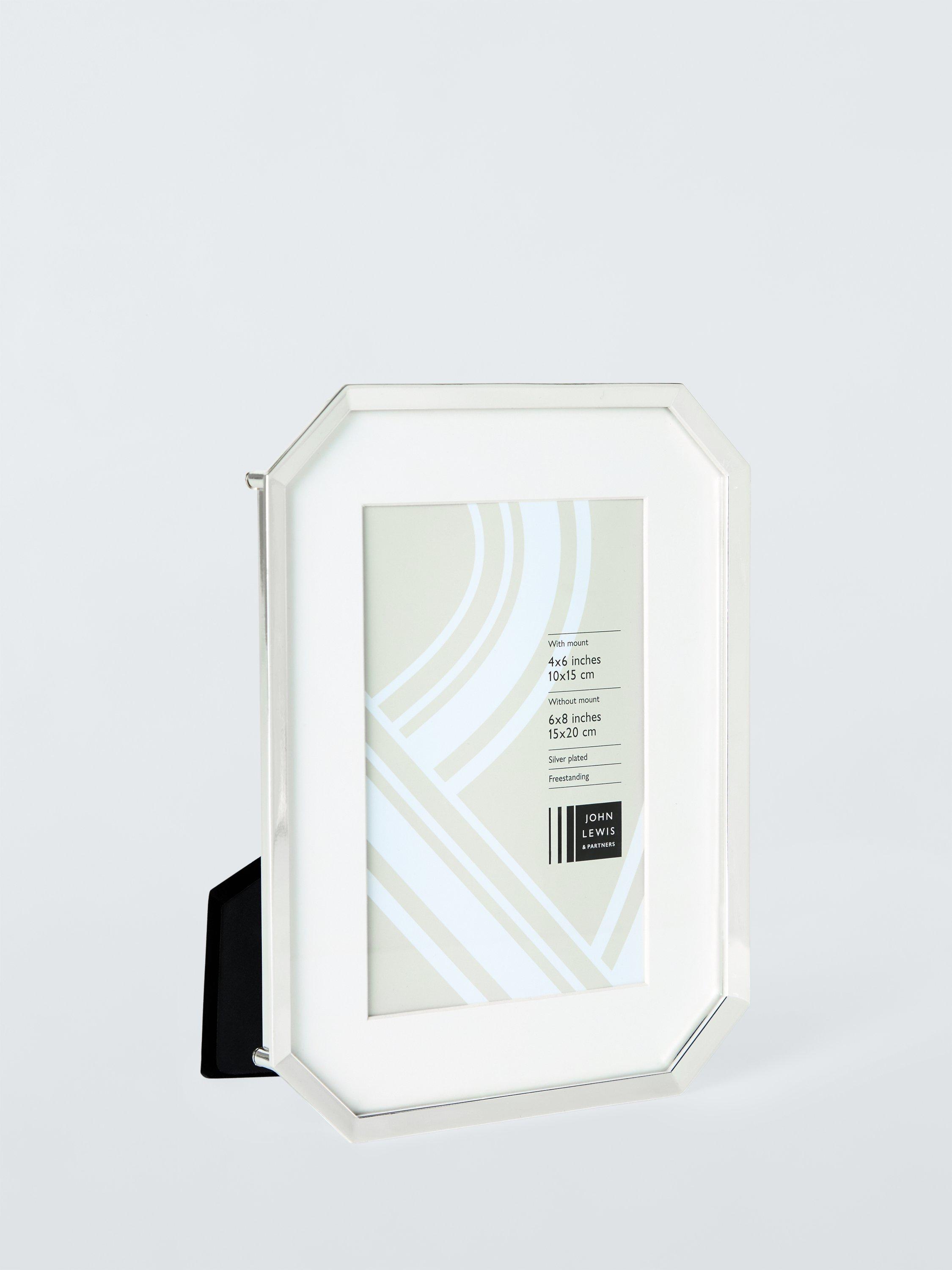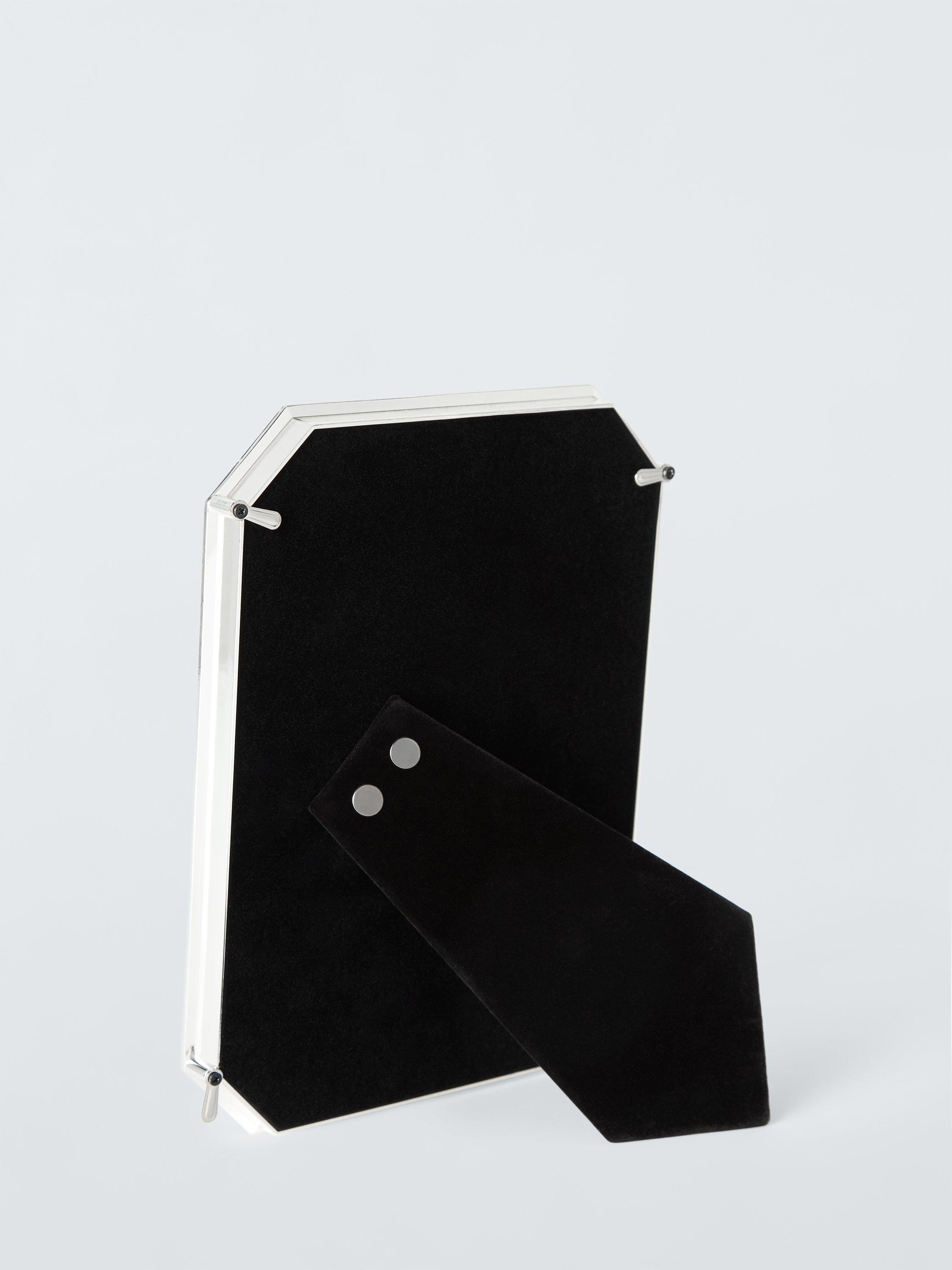 Timeless freestanding photo frame with cut-off corners. Made of silver-plated die-cast metal with a soft backing. Can be displayed vertically or horizontally.