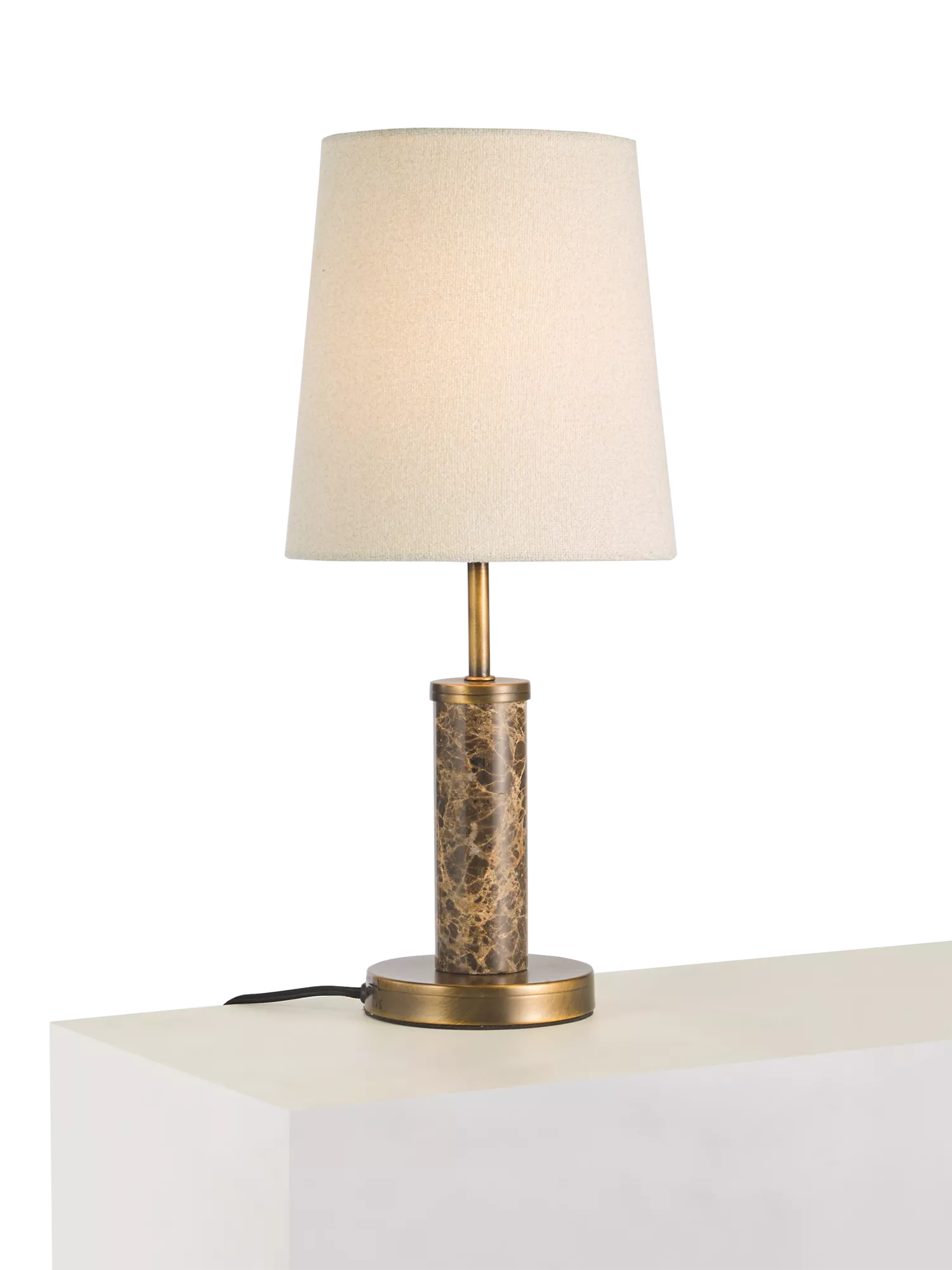Genuine marble, with its beautiful and unique natural patterns, creates a striking look on the base of our Malcolm table lamp, finished with antique bronze metal accents. The soft cream boucle style fabric shade adds a textural contrast to this sophisticated table lamp. Designed in a versatile size that can be used all around your home.