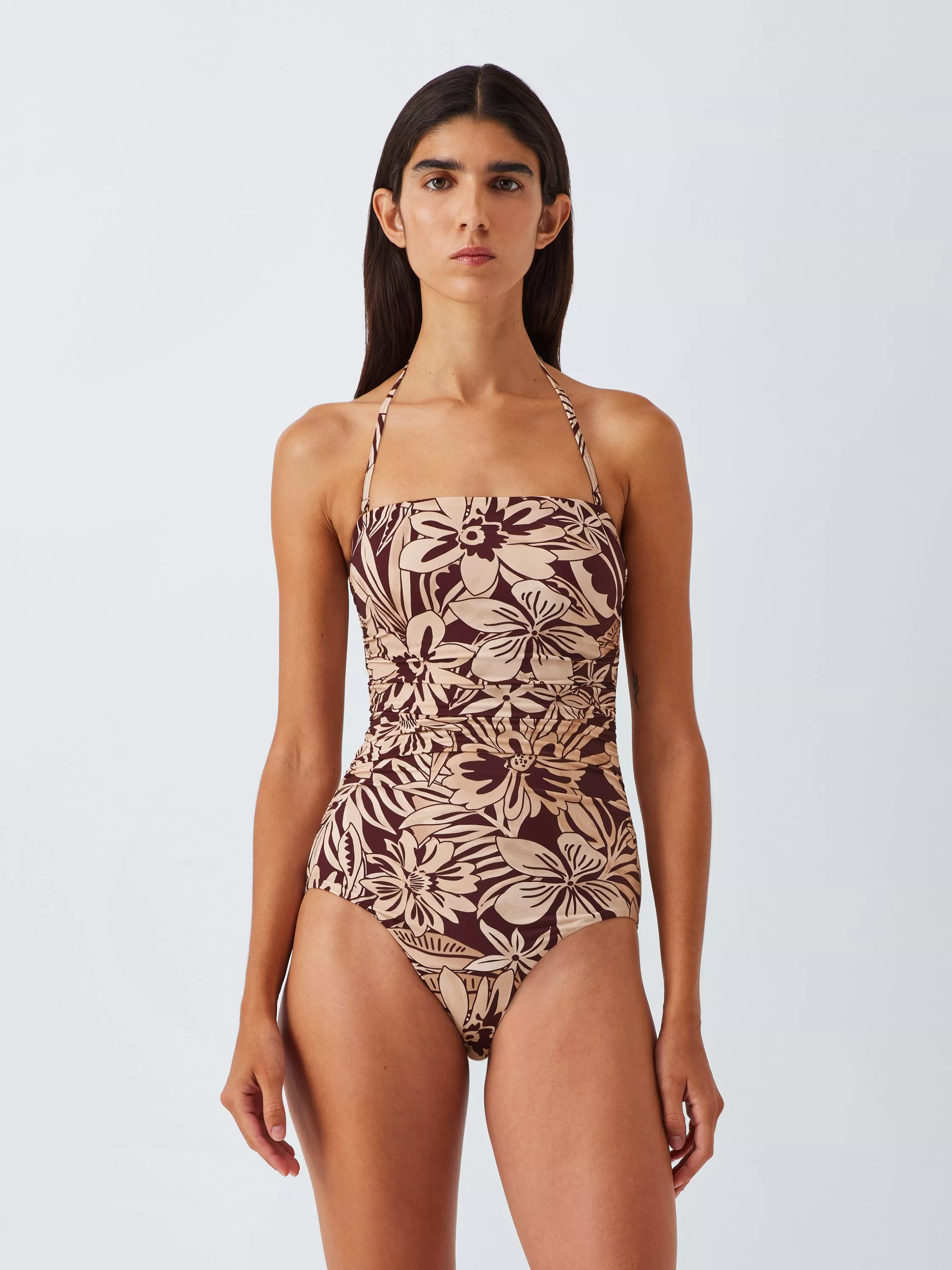 A fully lined swimsuit with detachable straps to switch the style between halterneck and bandeau. Ruching across the front flatters the tummy area.