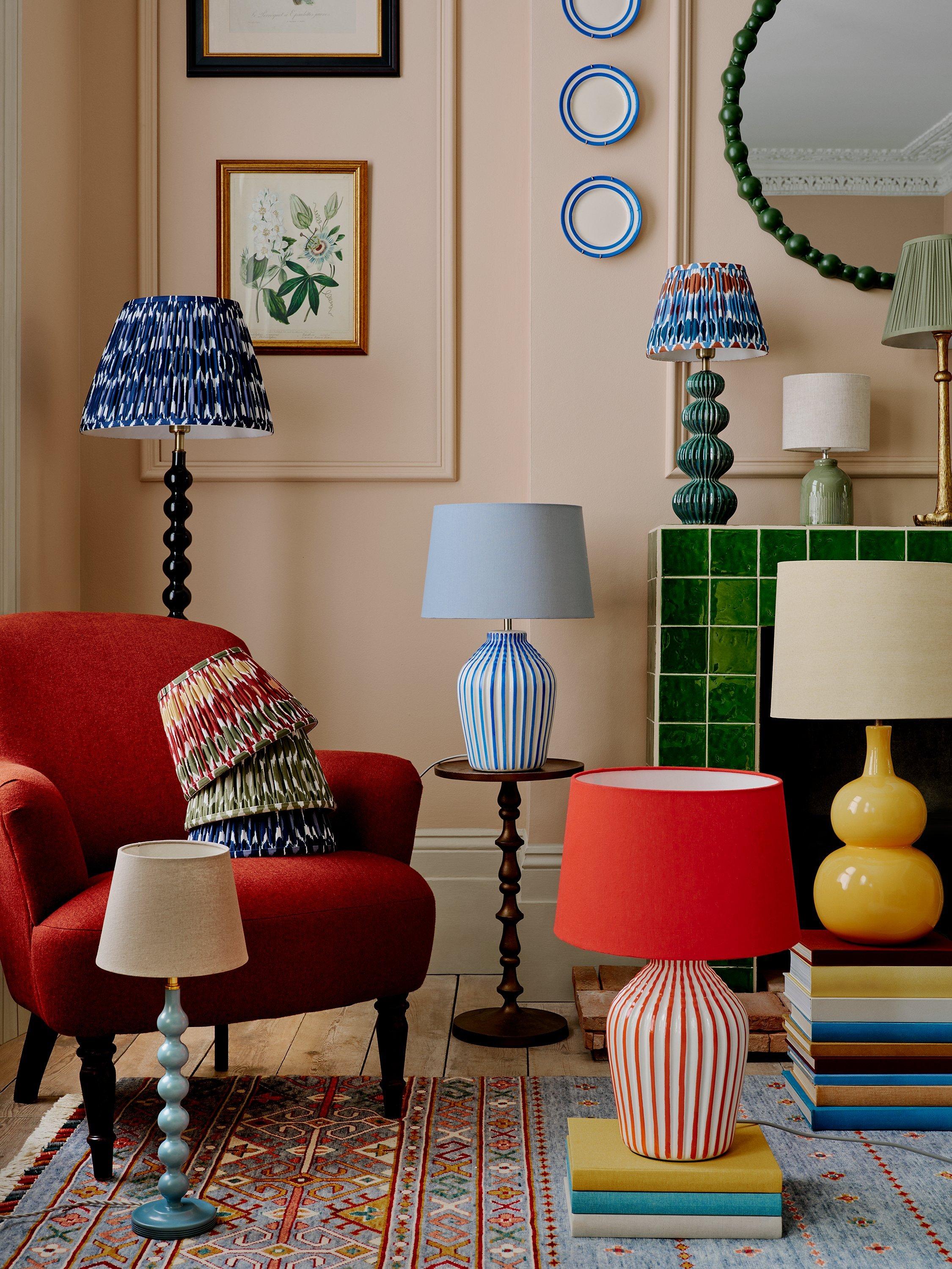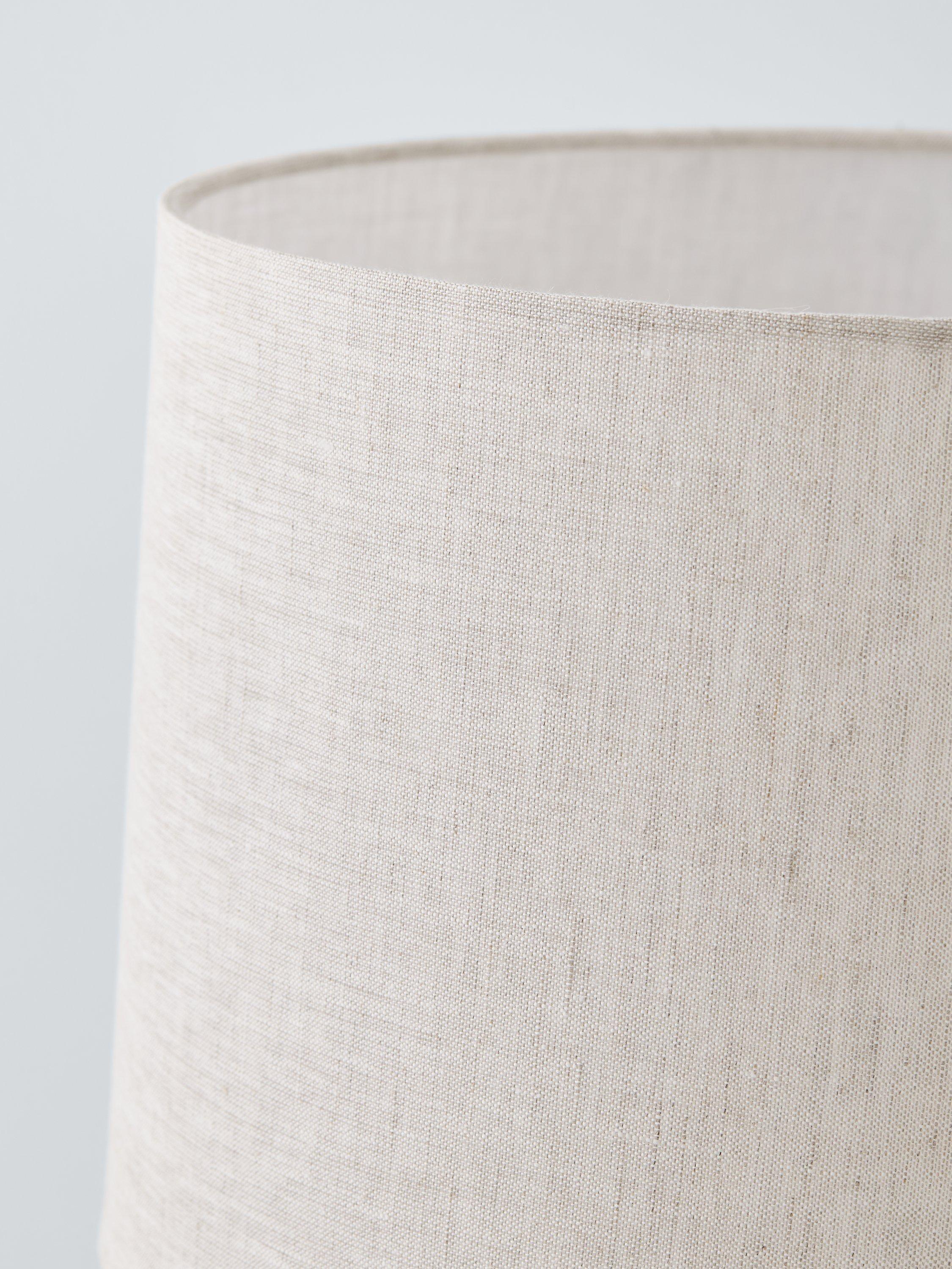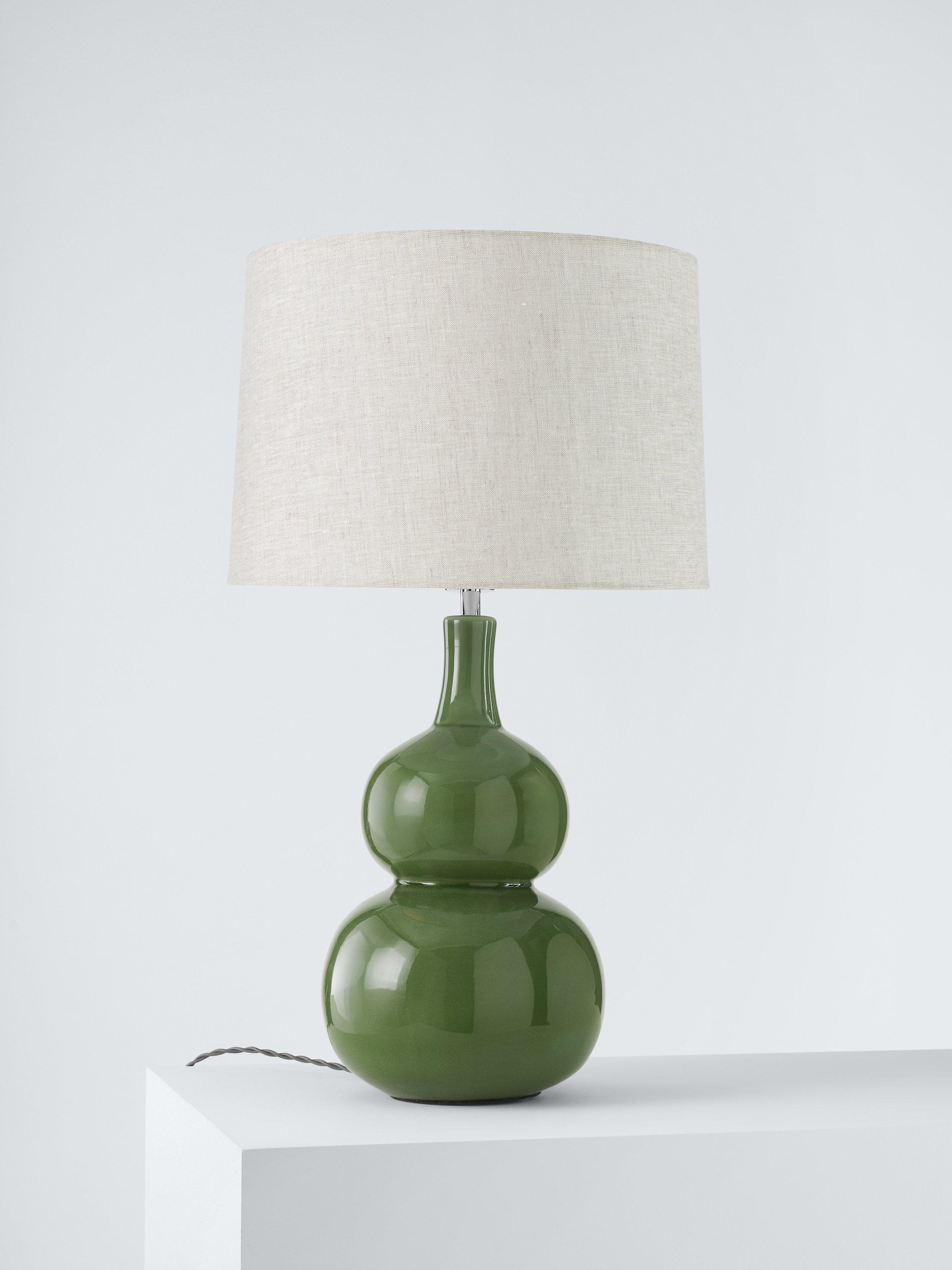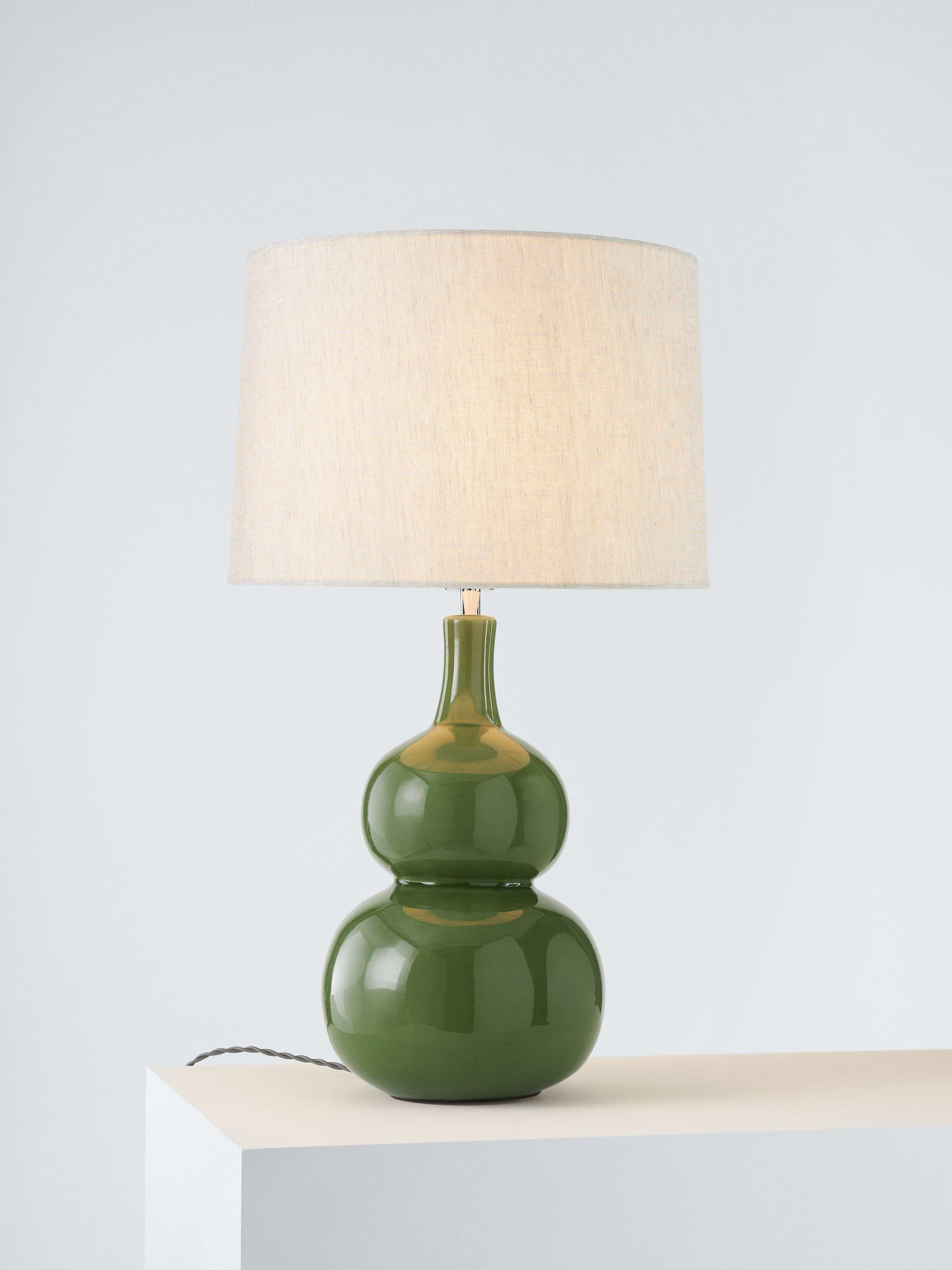 This table lamp has an organic flowing shape which is finished in a distinctive highly glossed, lush green, glaze with a subtle crackle. The shade is made from linen in a drum shape and finished off with a fabric cable in soft grey. One LED bulb is required.