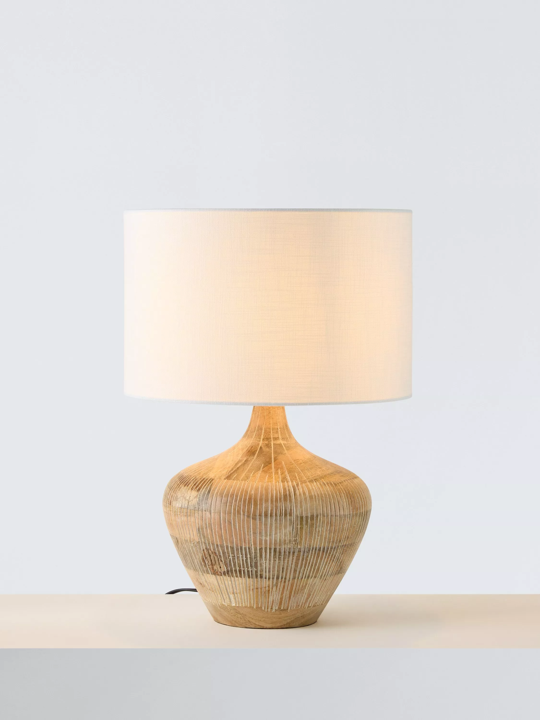 A curved, elegant shape, this contemporary table lamp has a wooden base with vertical lines adding texture, hand-etched by artisans in India. Complemented by a fabric drum shade in a subtle whitewash that keeps the focus on the mango wood base with its varying natural tones.