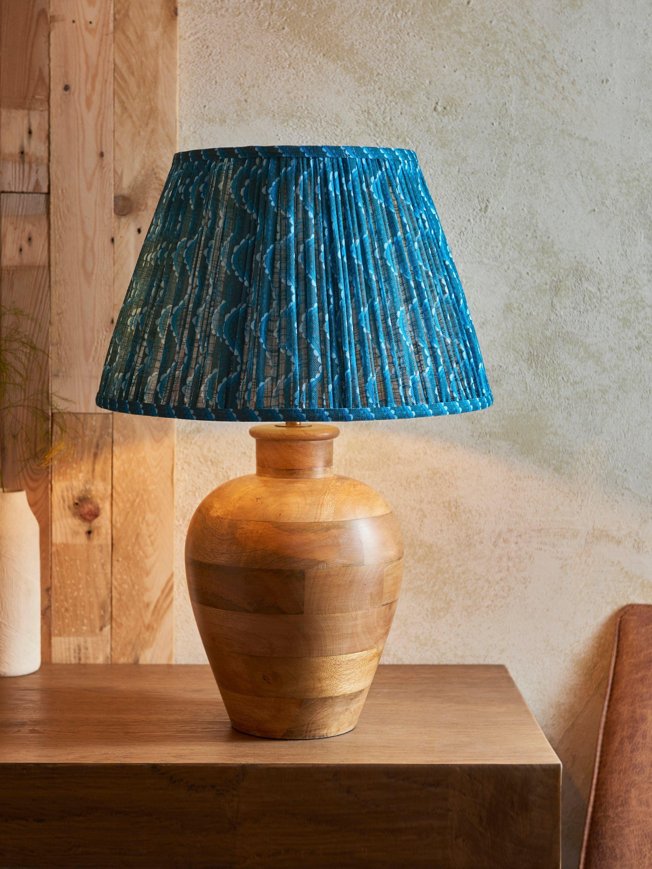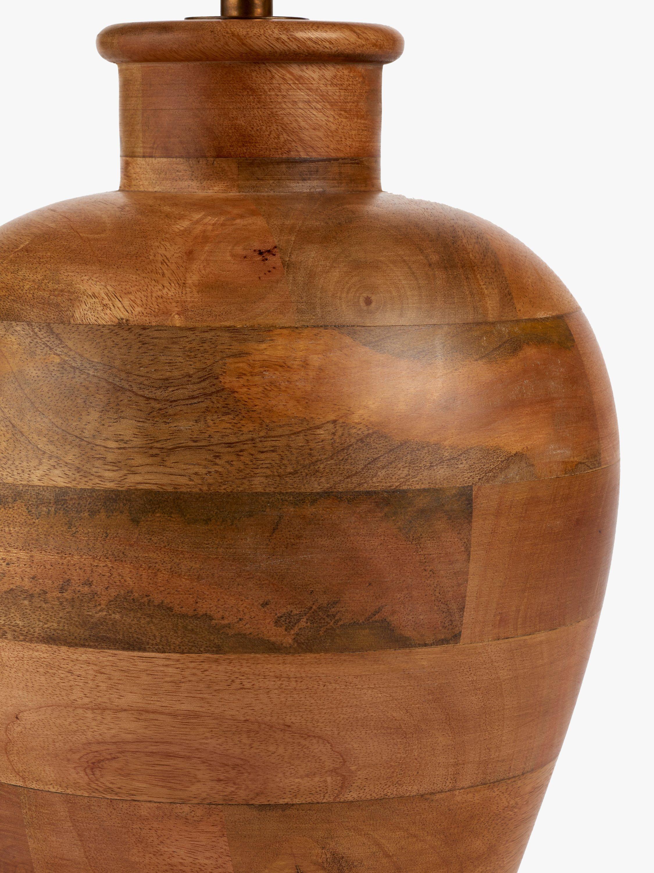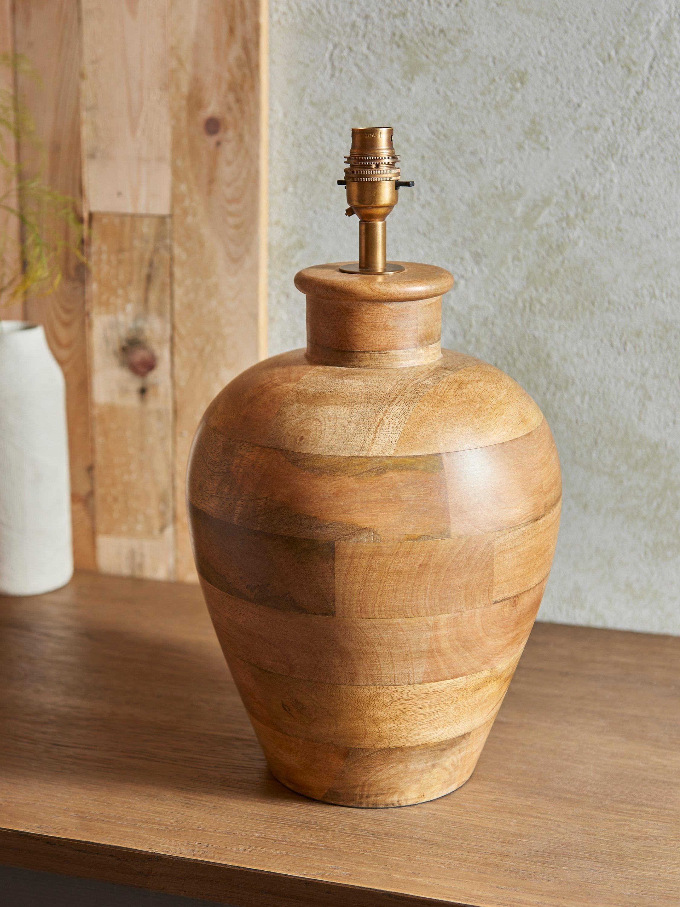 This sculpted lamp base is made from solid mango wood. Its warm tones and unique wood grains, together with its rounded shape will add a calming, natural look to your space. And it means that each base is completely unique. We'd pair it with a linen lampshade to complete the look.