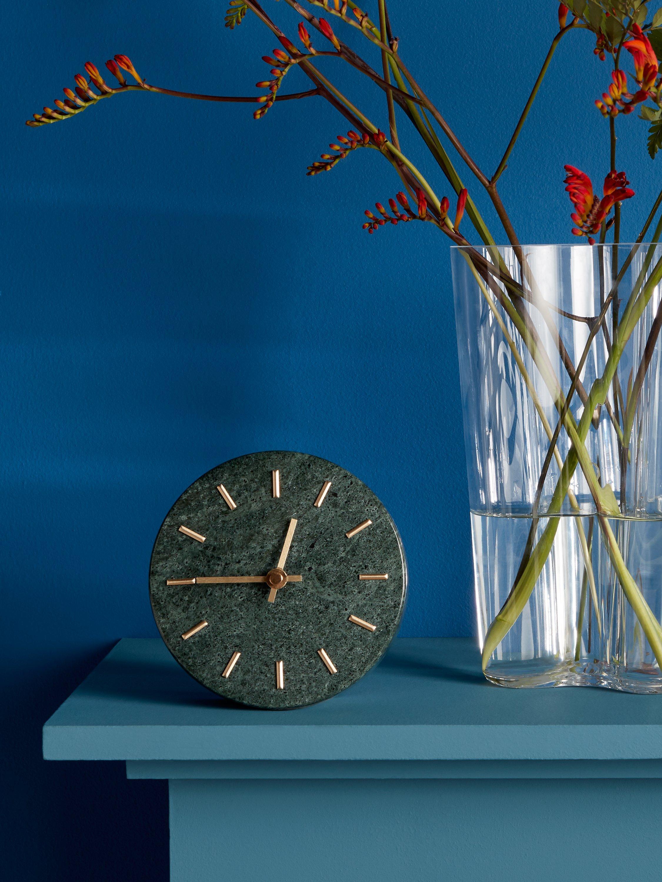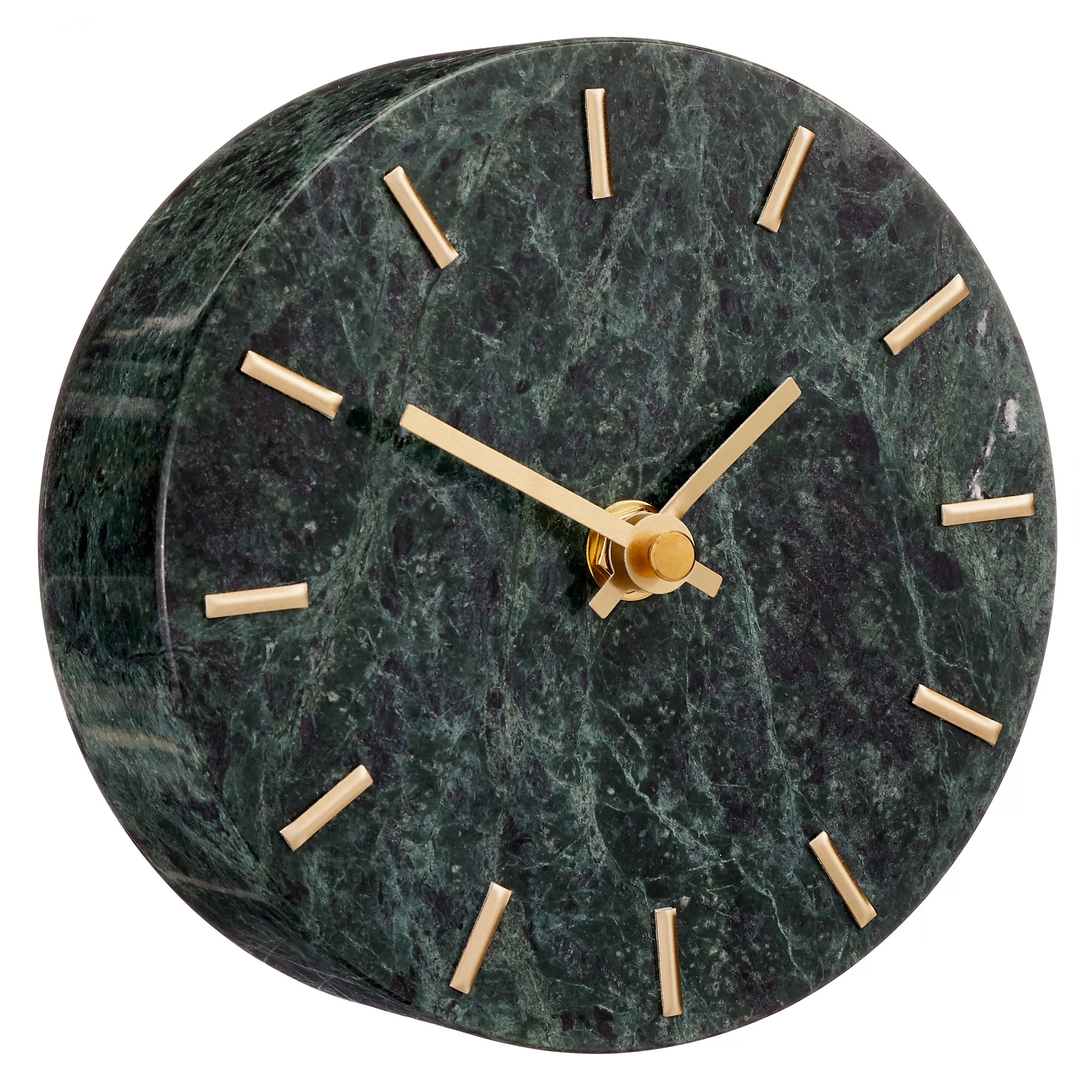 A circle of green marble forms the face of this analogue clock with brass hour markers and matching hands adding a sophisticated touch.