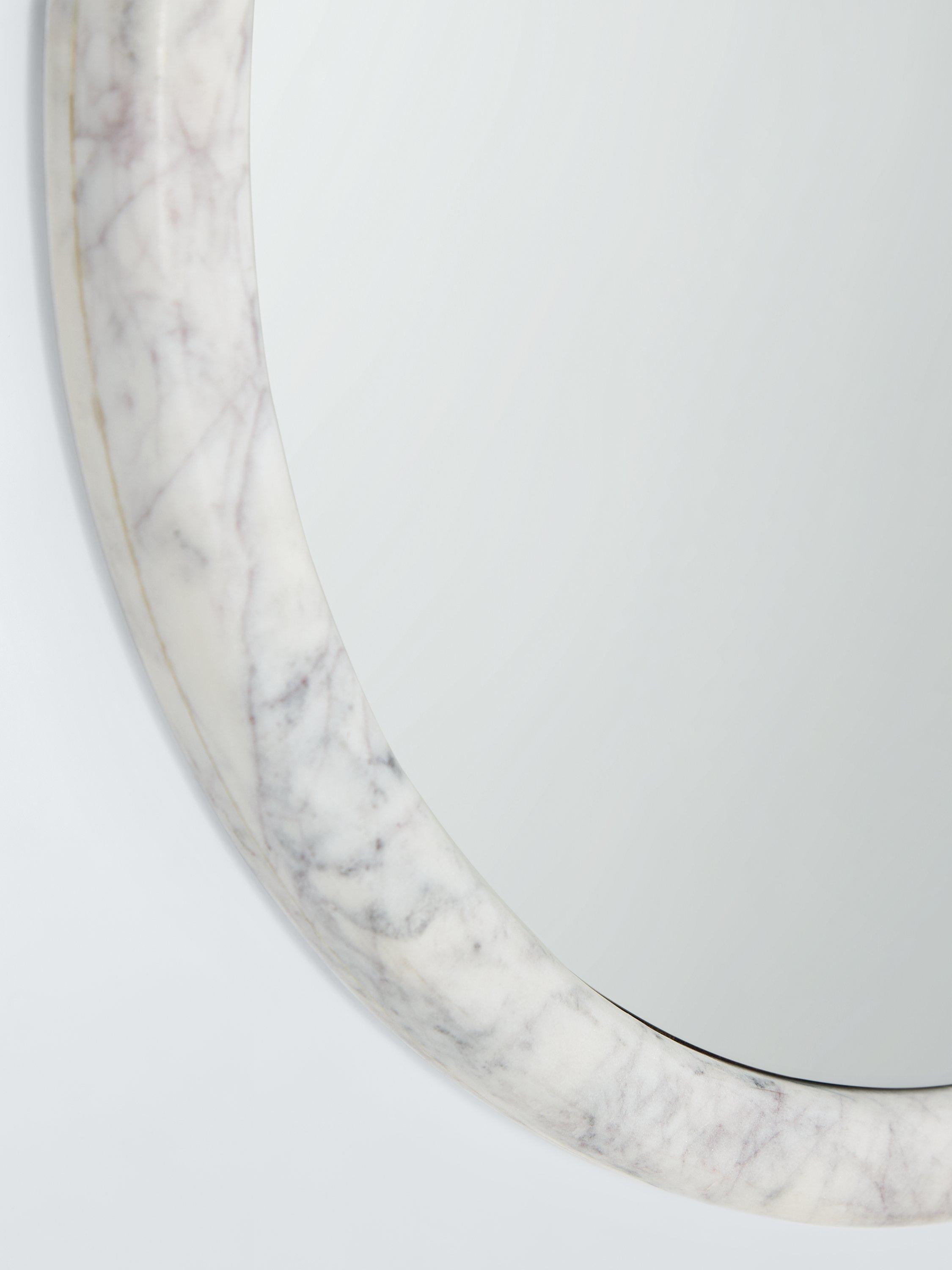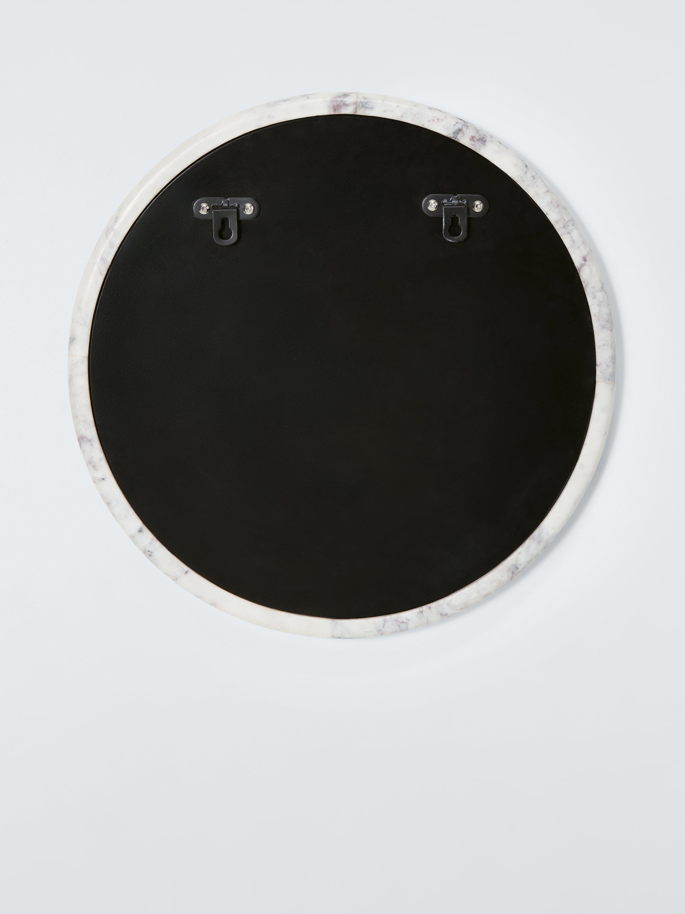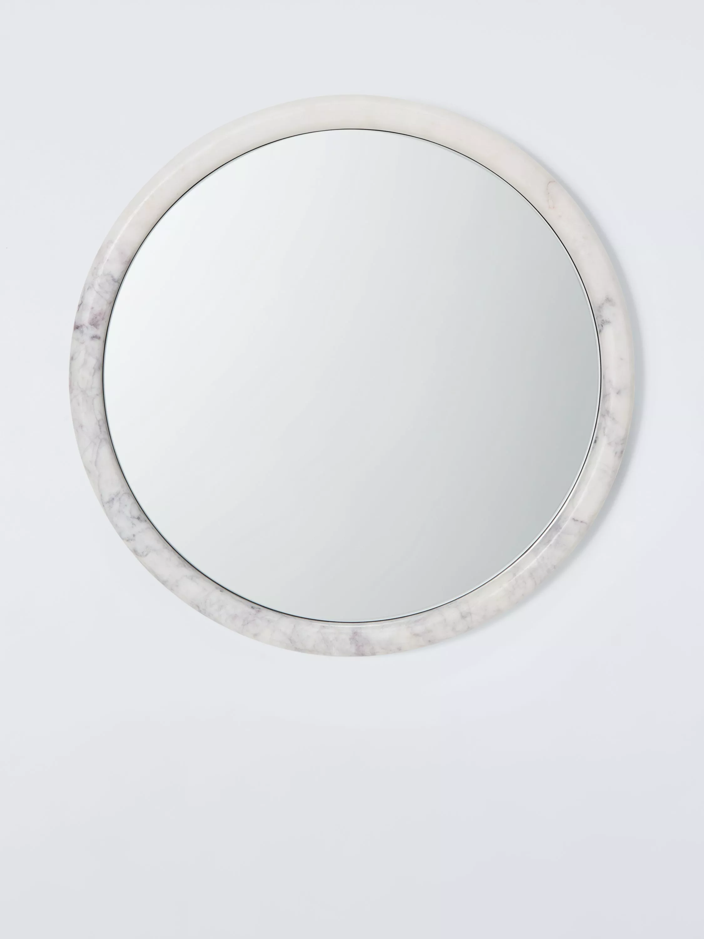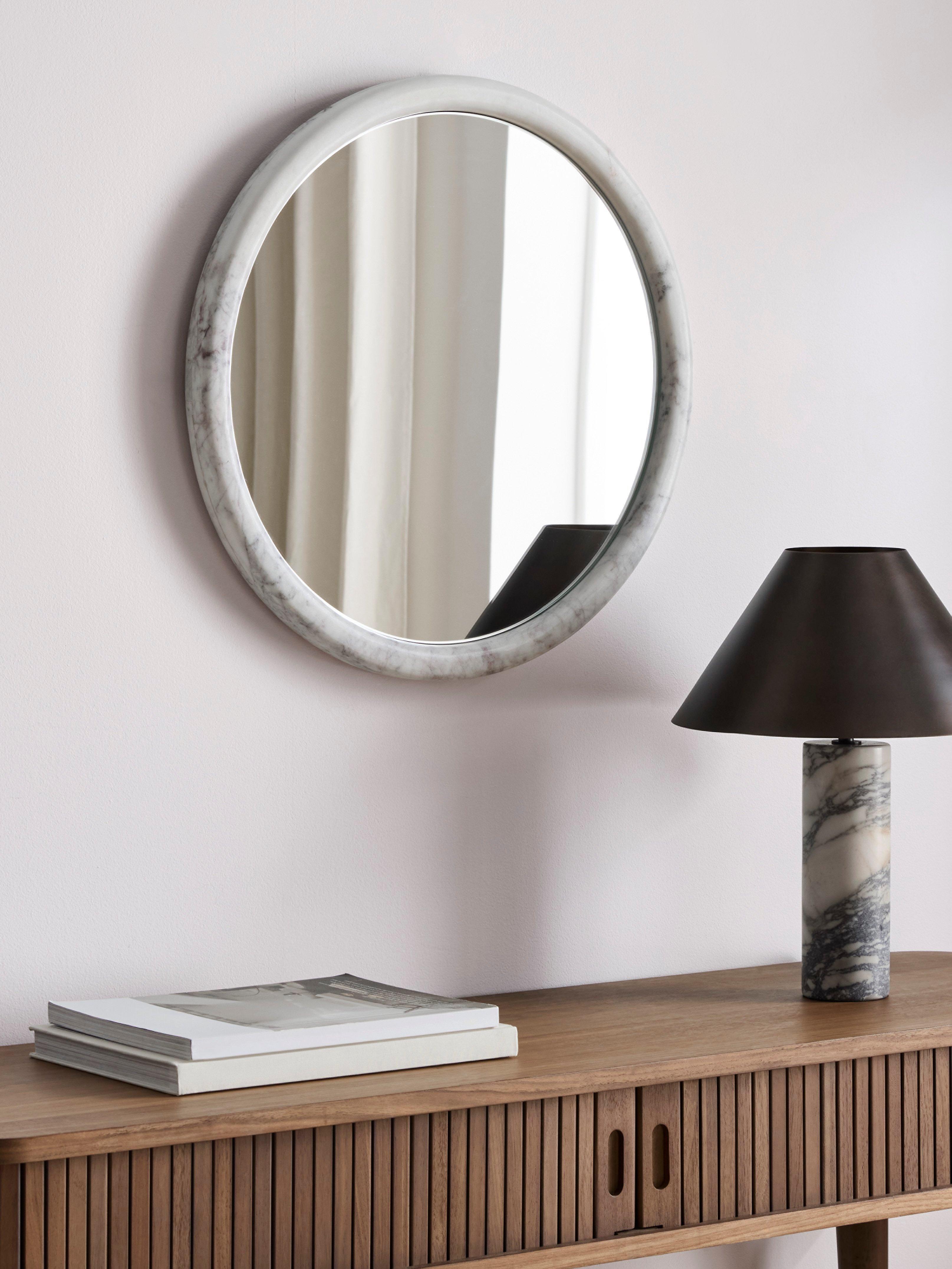 A bespoke marble frame distinguishes this round mirror as a true statement piece, featuring unique natural veining that ensures no two items are exactly alike. Its circular silhouette provides a sophisticated focal point for hallways or living spaces.
