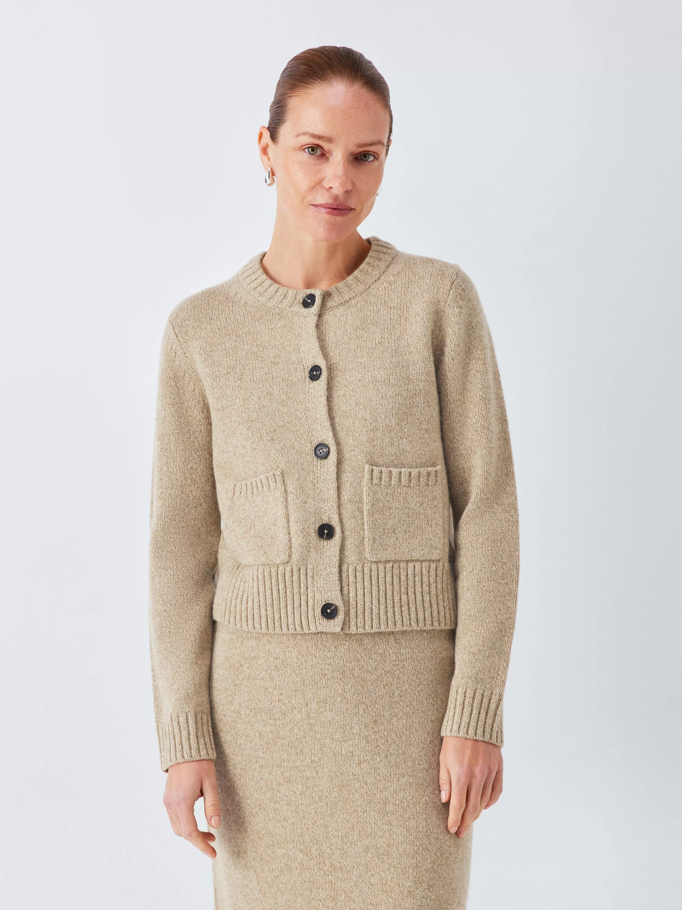 A button-down cardigan featuring two patch pockets and a contrasting ribbed knit on the crew neckline, hem and cuffs. The marled fabric blend includes naturally temperature-regulating wool with nylon, which adds softness to the yarn. Pair it with the matching pencil skirt for a coordinated look.