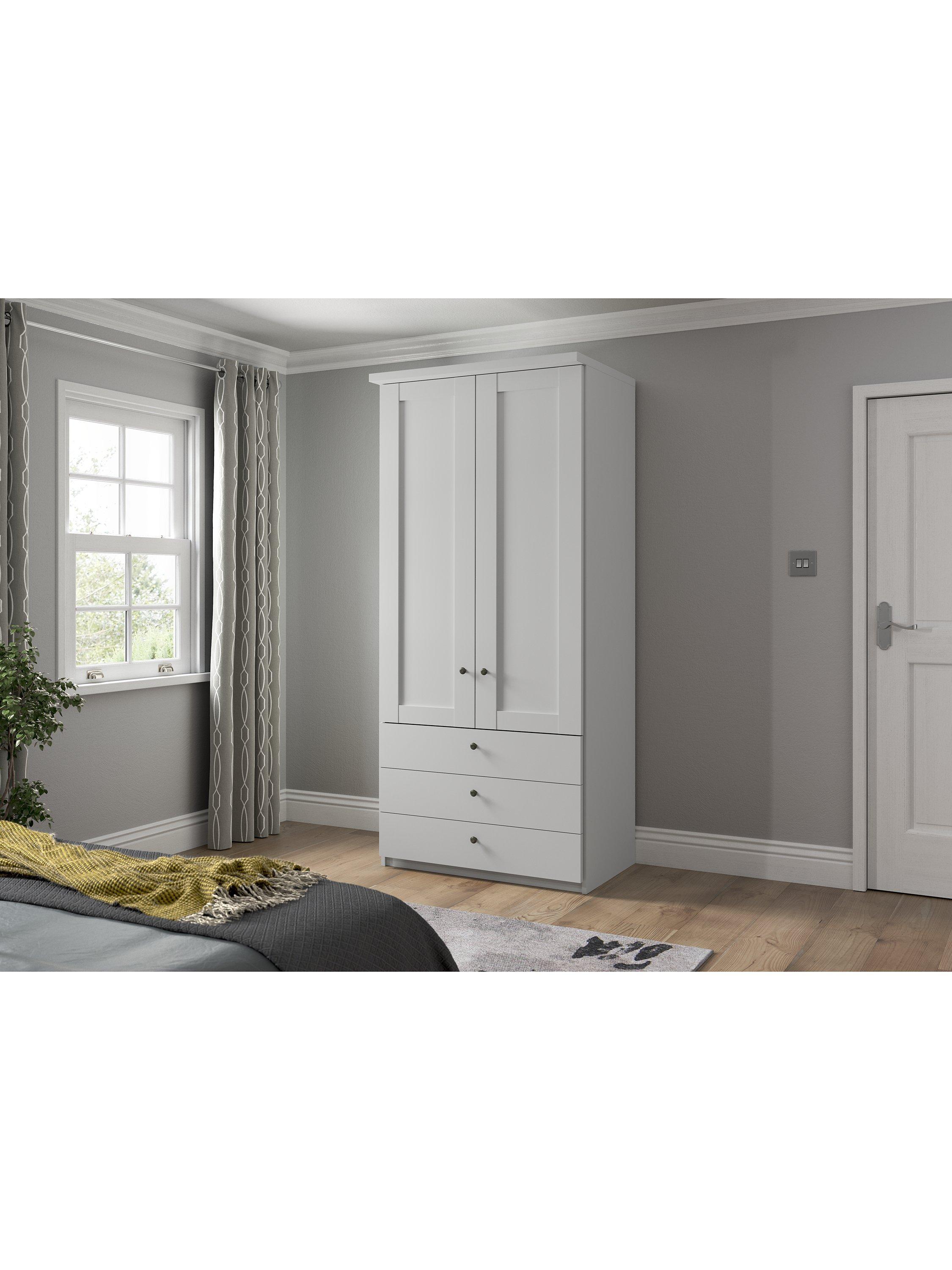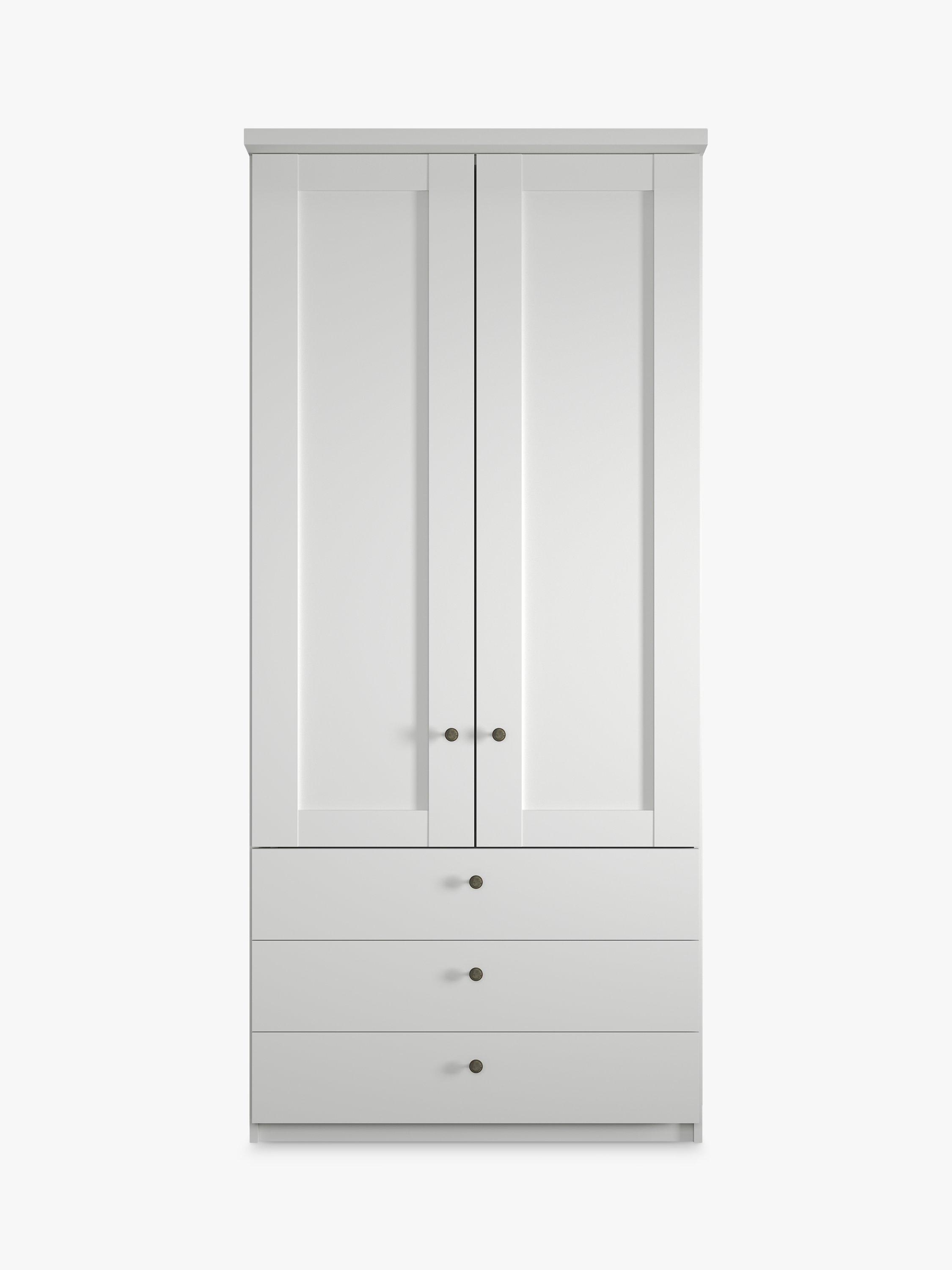 This two-door wardrobe has three drawers at the bottom. The interior has a single compartment with two shelves and a hanging rail, all of which are fully adjustable to suit your requirements.