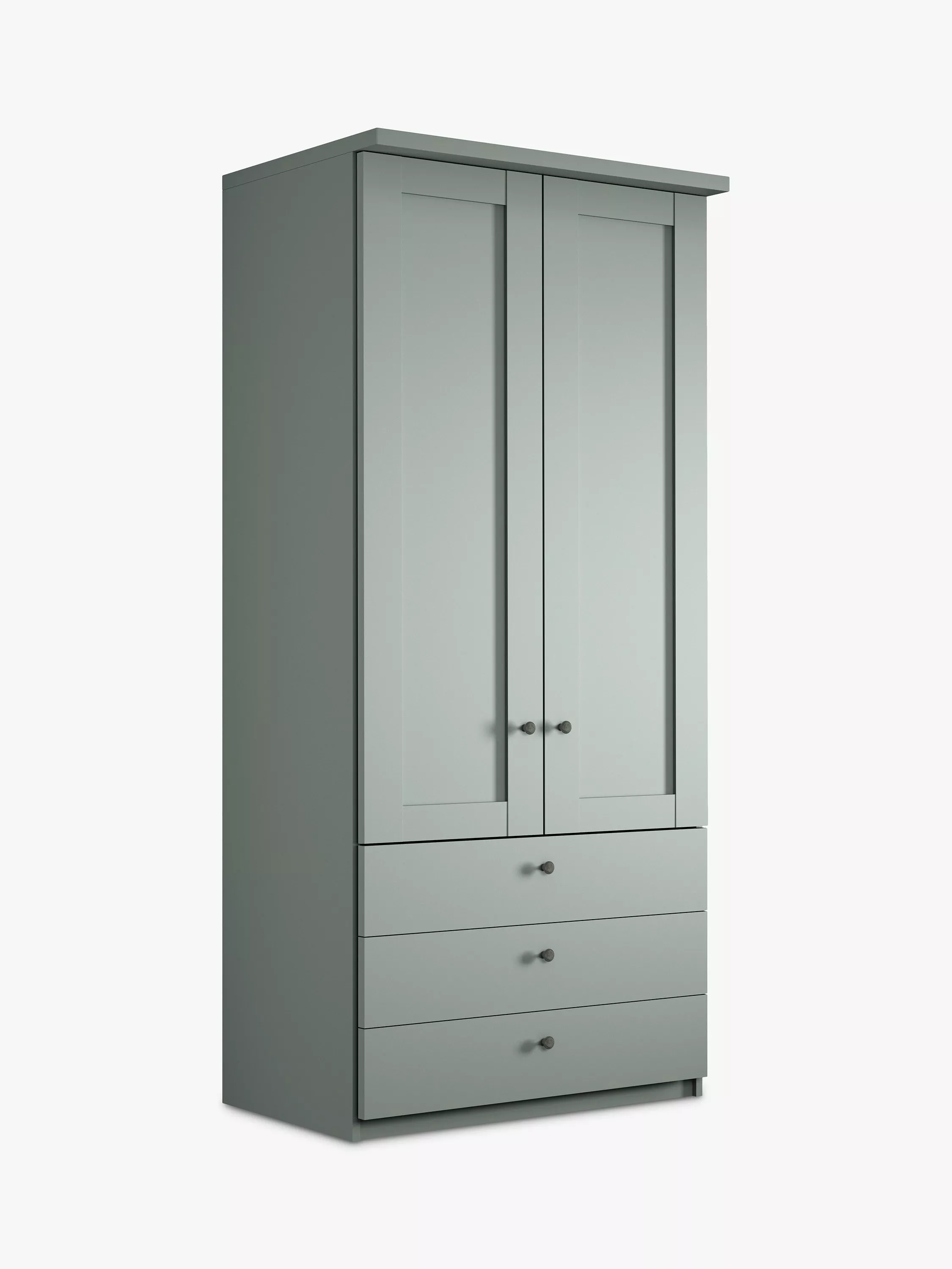 This two-door wardrobe has three drawers at the bottom. The interior has a single compartment with two shelves and a hanging rail, all of which are fully adjustable to suit your requirements.