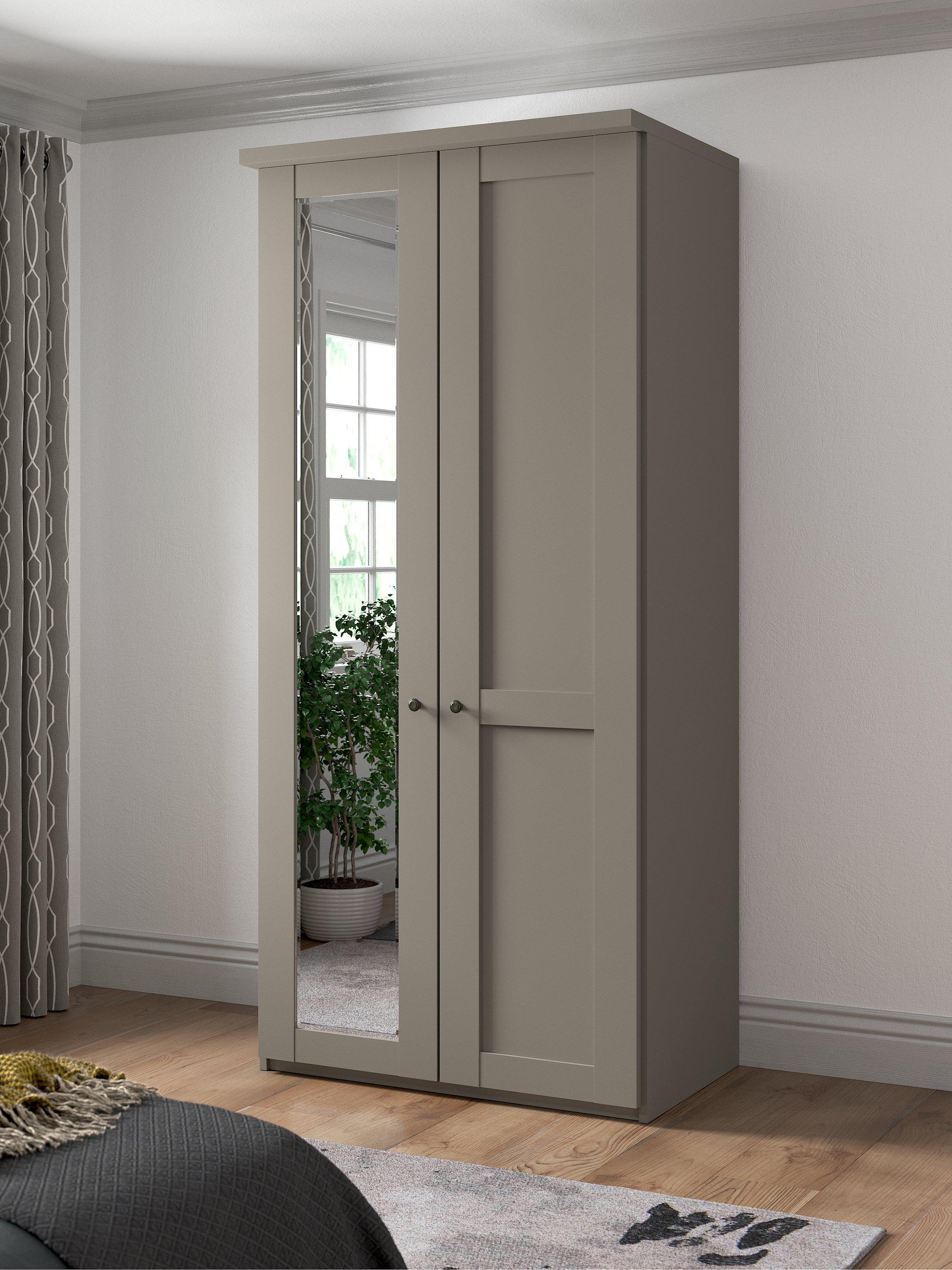 This wardrobe's left-hand door has an external mirror. The interior has a single compartment with two shelves and a hanging rail, all of which are fully adjustable to suit your requirements. This product is delivered and assembled by the supplier for your convenience.
