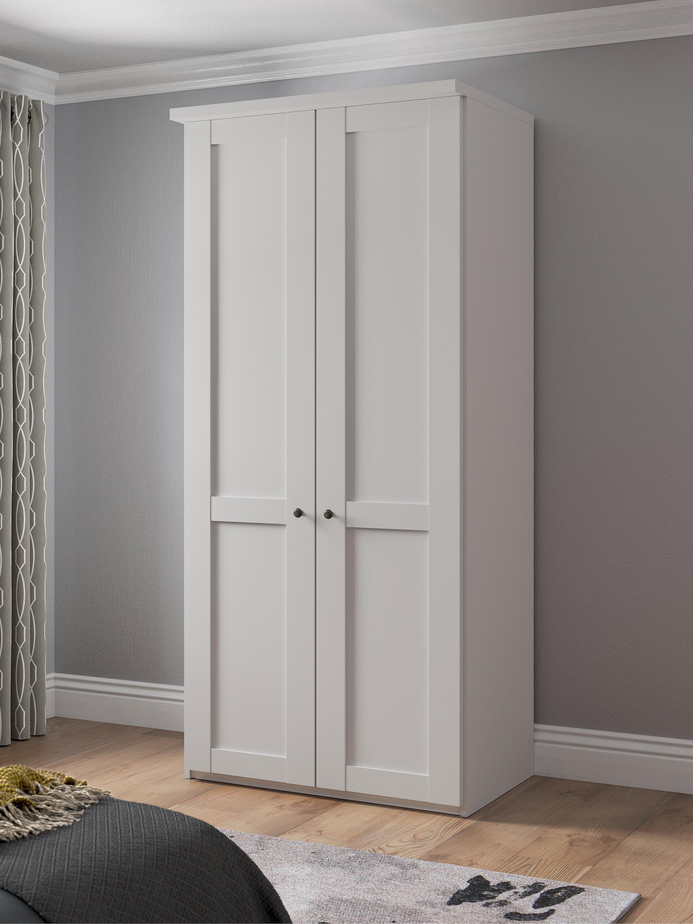 This wardrobe's interior has a single compartment with two shelves and a hanging rail, all of which are fully adjustable to suit your requirements. This product is delivered and assembled by the supplier for your convenience.