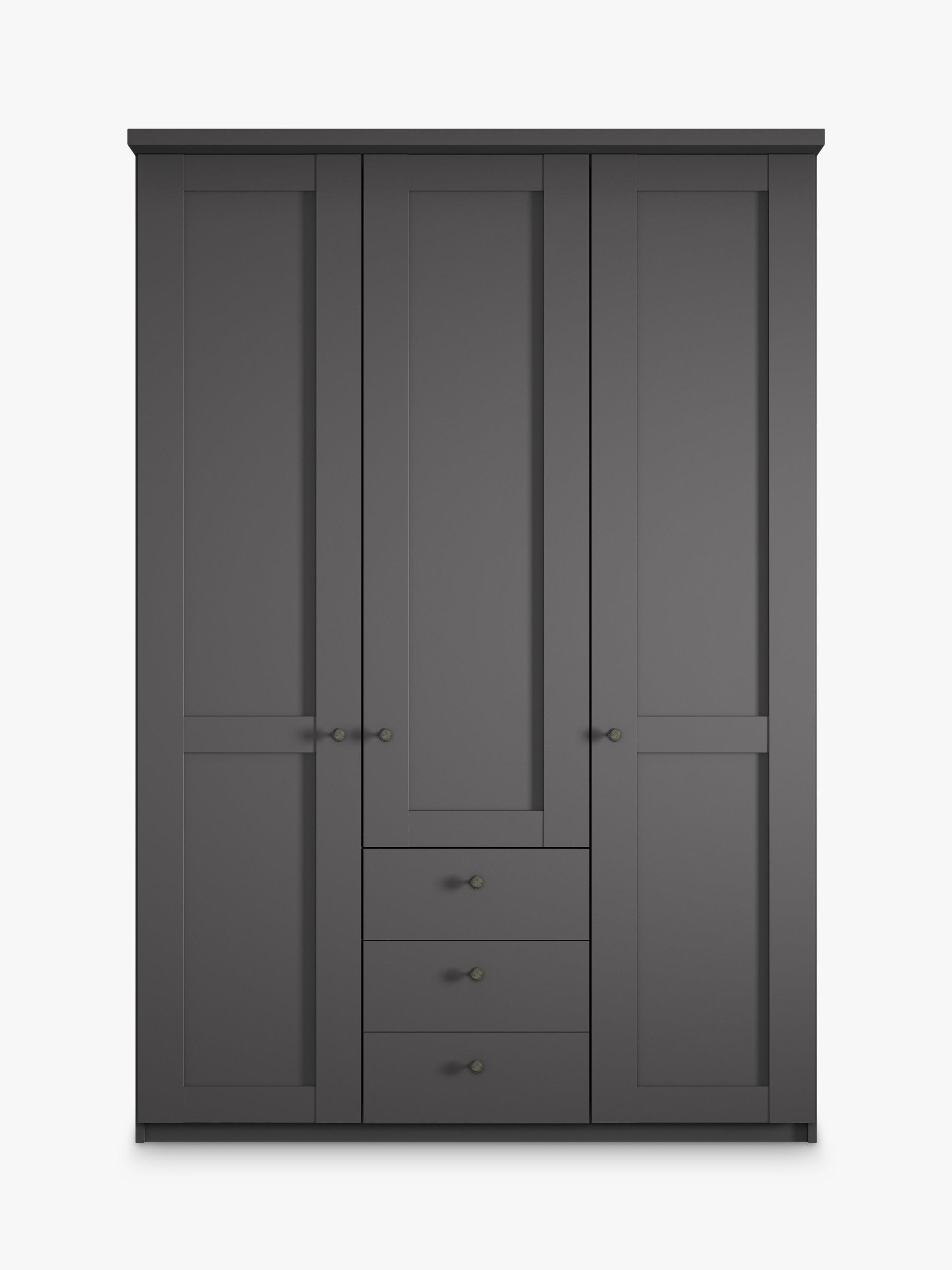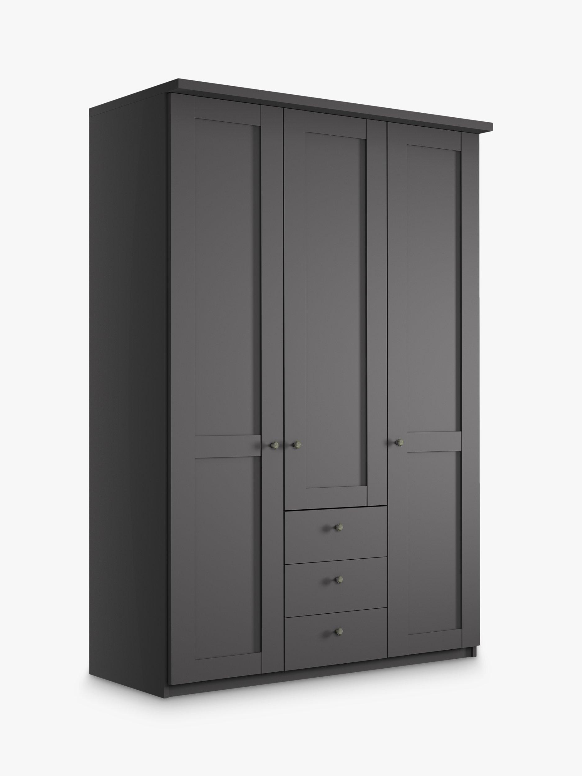 This three-door wardrobe has three drawers below the middle door. The interior has three single compartments. Each compartment is completed with two shelves and a hanging rail, all of which are fully adjustable to suit your requirements.