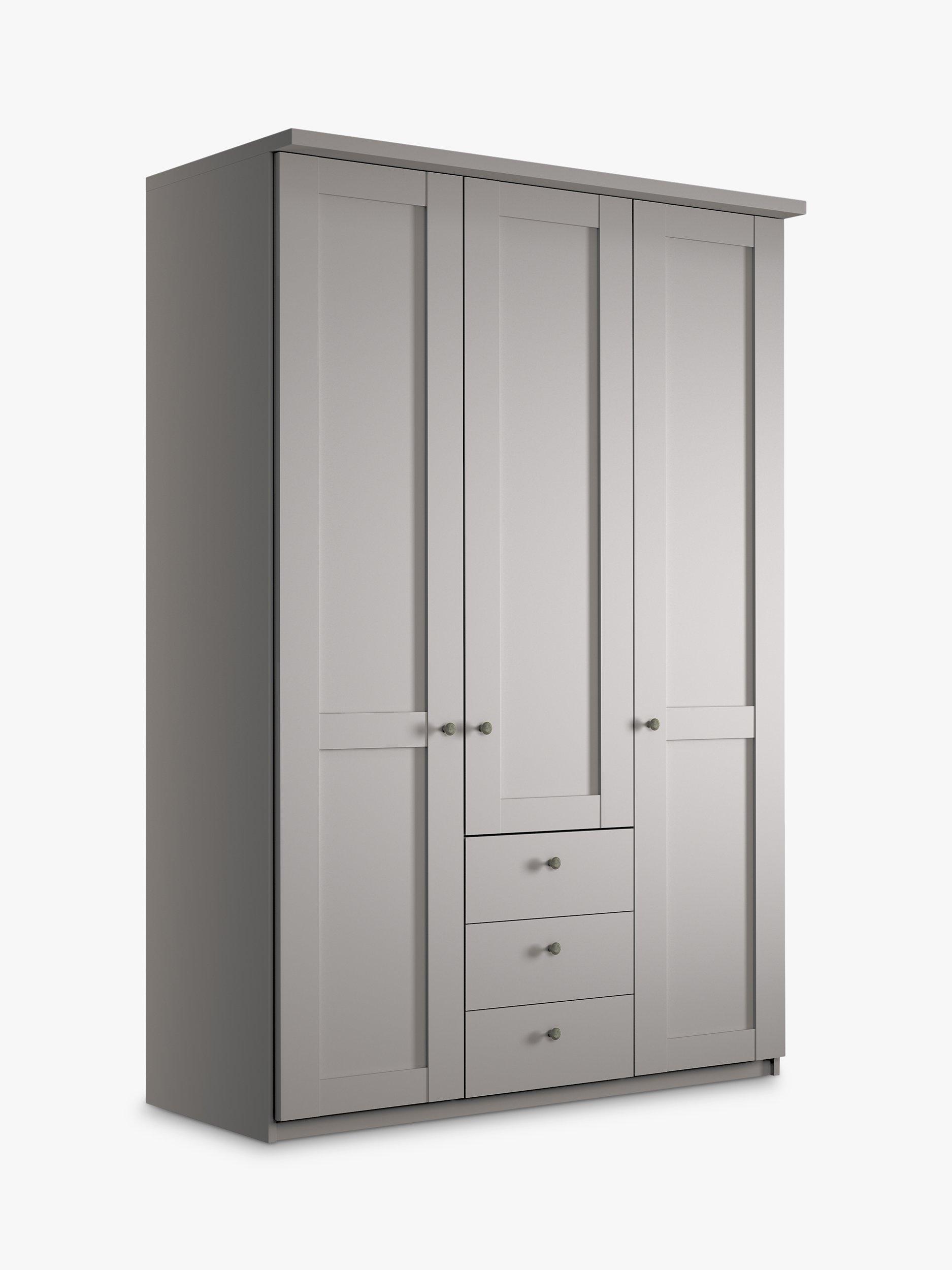 This three-door wardrobe has three drawers below the middle door. The interior has three single compartments. Each compartment is completed with two shelves and a hanging rail, all of which are fully adjustable to suit your requirements.