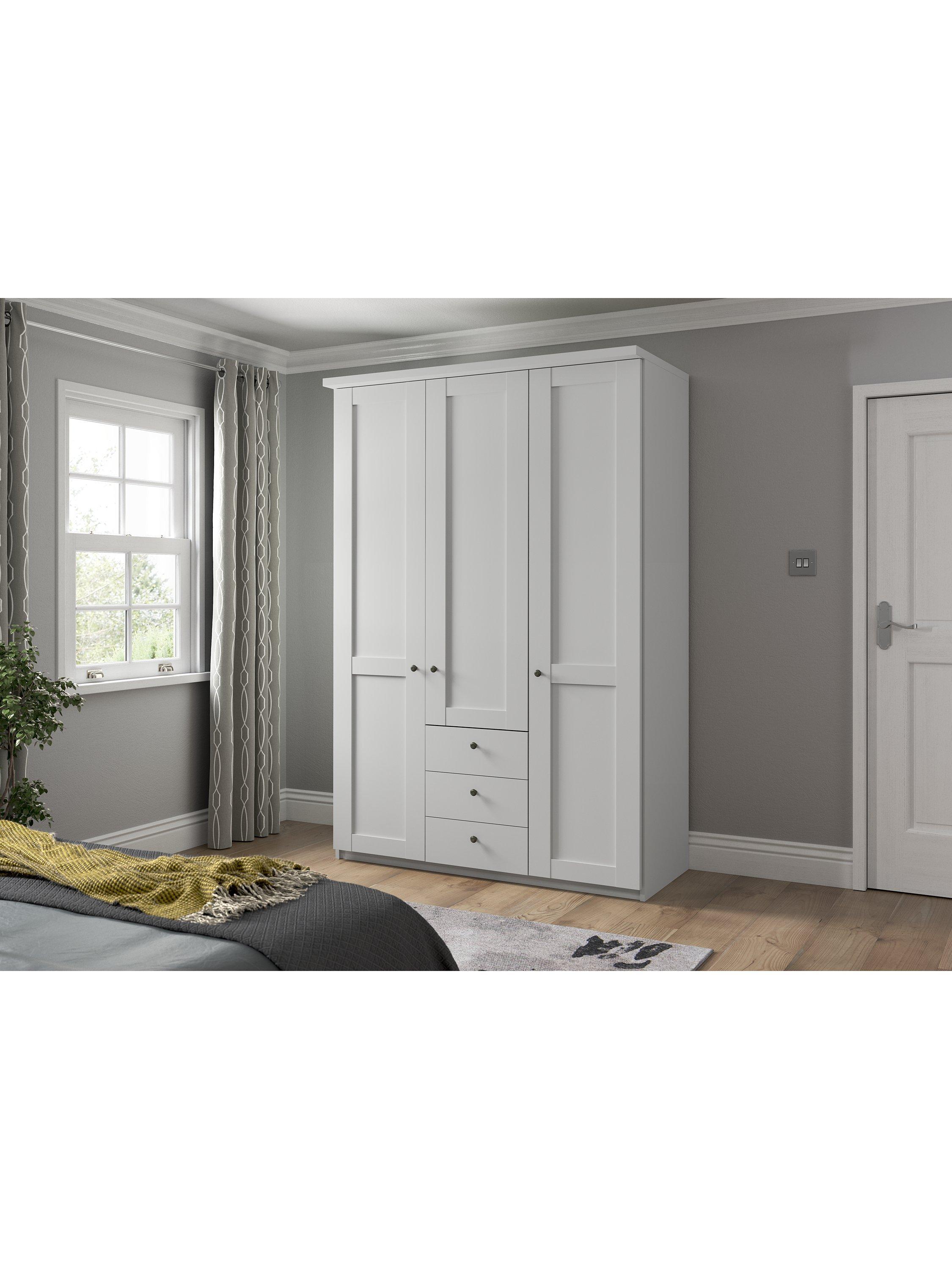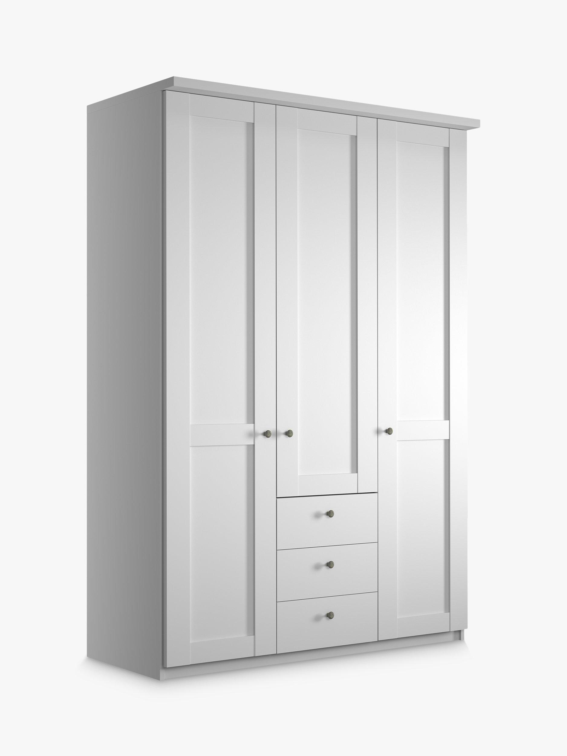 This three-door wardrobe has three drawers below the middle door. The interior has three single compartments. Each compartment is completed with two shelves and a hanging rail, all of which are fully adjustable to suit your requirements.